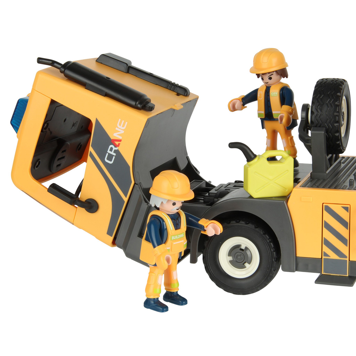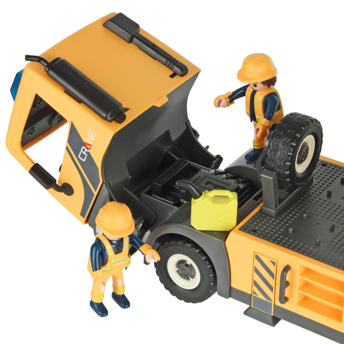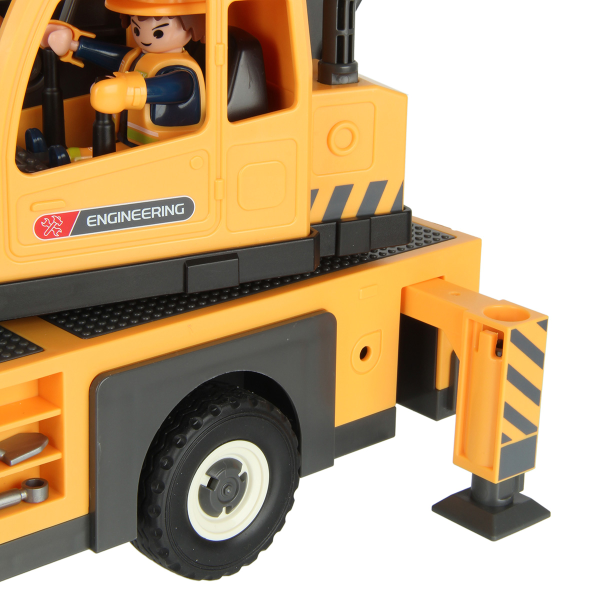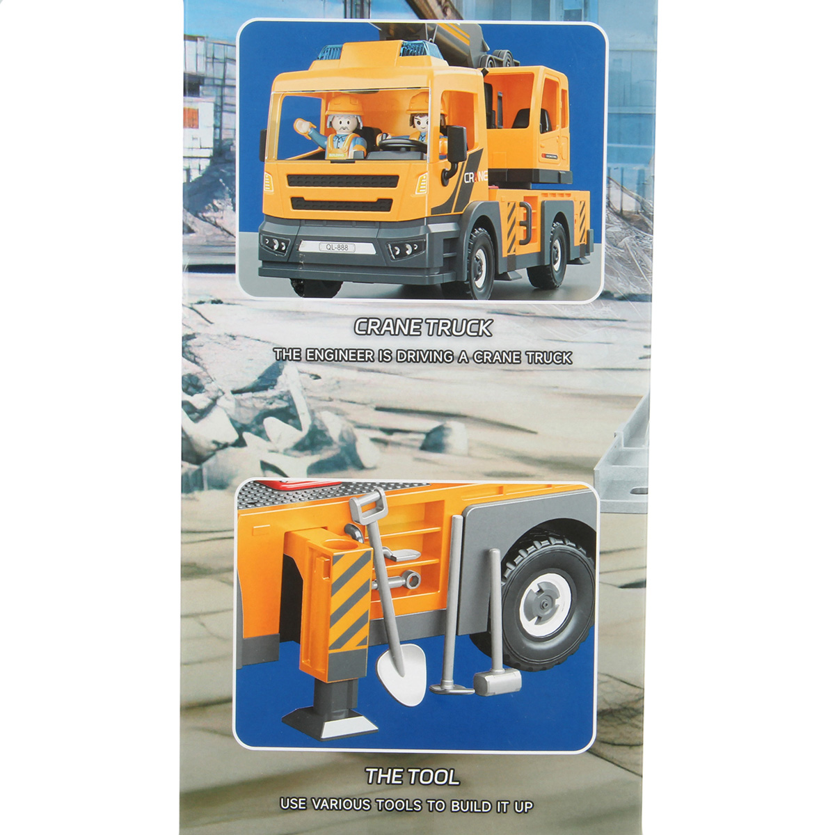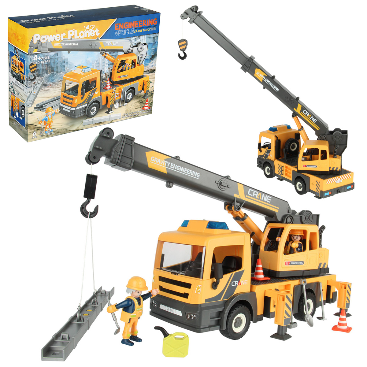 Детали для сборки строительной машинки крана, детали для сборки 2 фигурок строителей, детали для сборки веревки для крепления грузов с 2 крючками, 2 строительные балки, 2 конуса, молоток, 3 лопаты, строительный лом из 2 частей, гаечный ключ, канистра для топлива, набор наклеек, инструкция на английском языке.