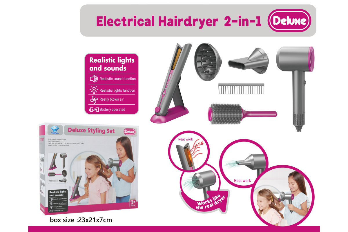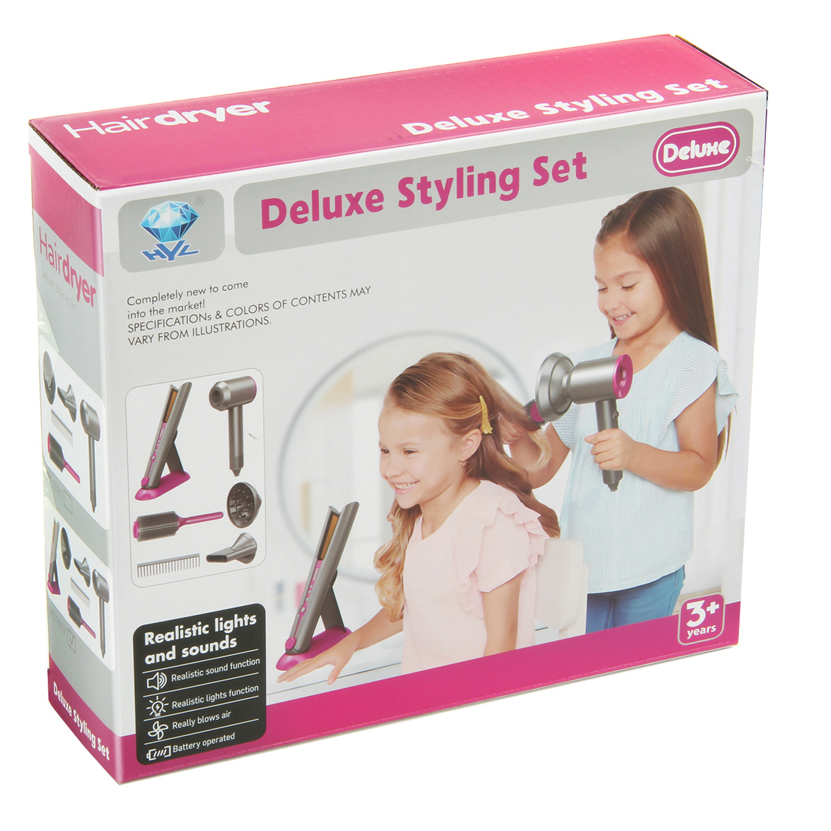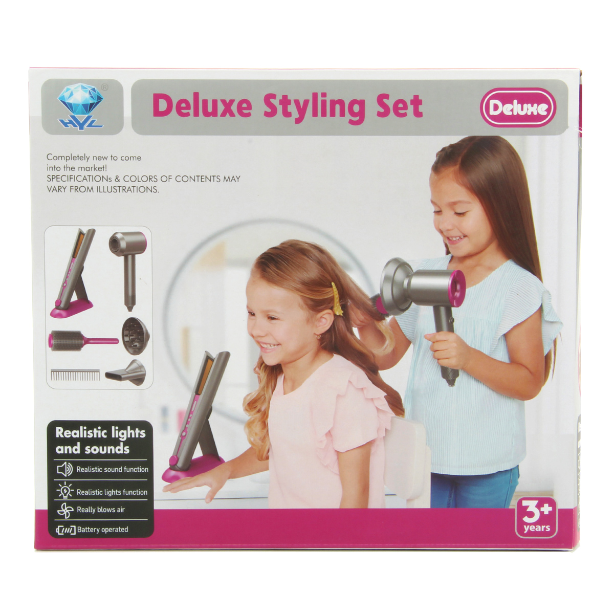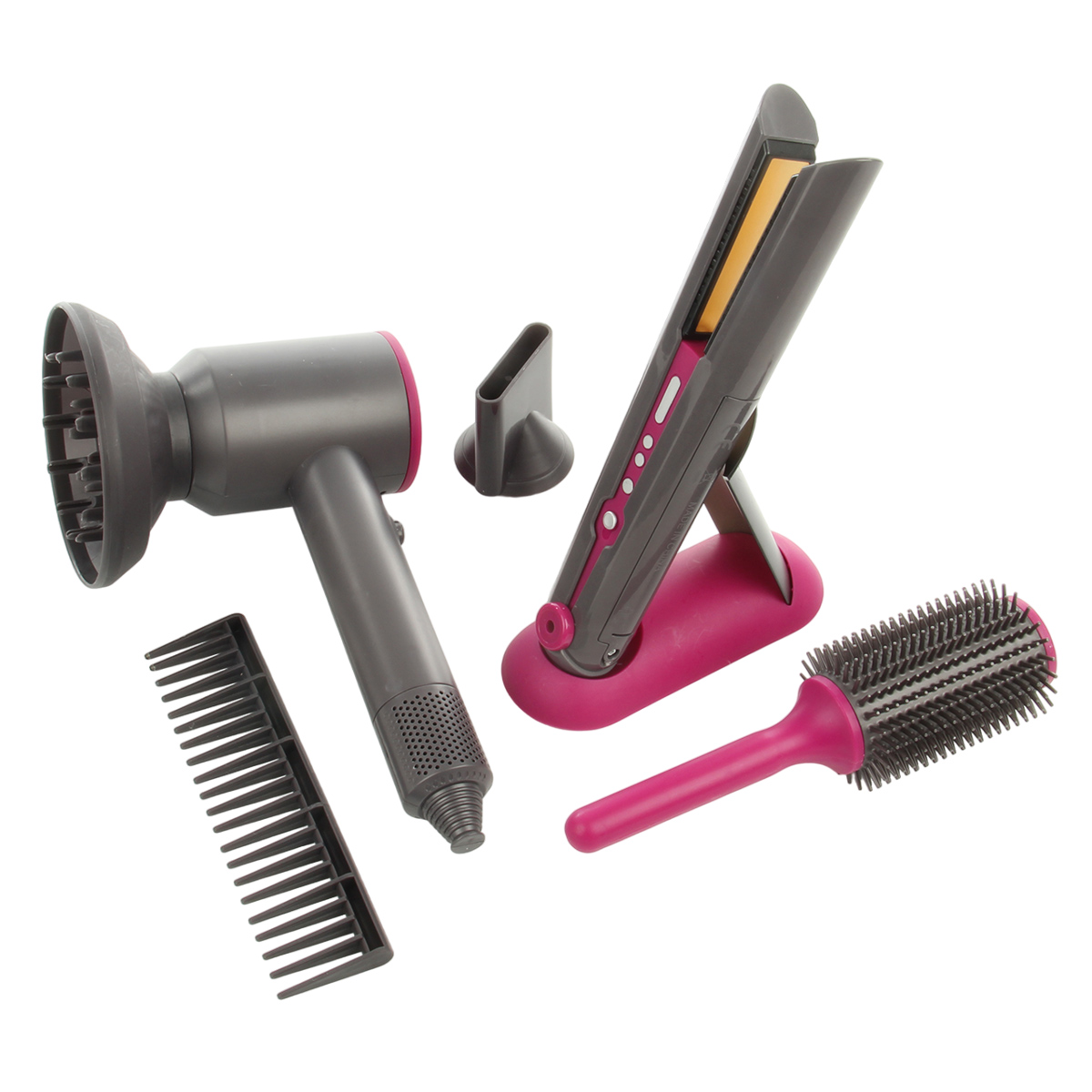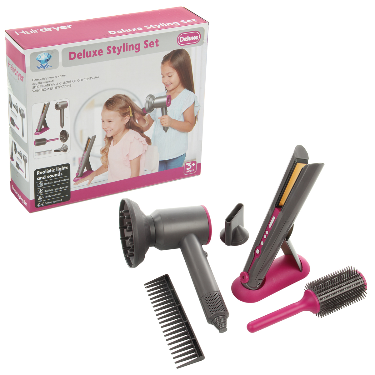 Игрушечный фен, выдувающий воздух, сменные насадки к нему, 2 расчески в комплекте, игрушка утюжок со световыми эффектами, этот роскошный набор Парикмахерская очень понравится ребенку.