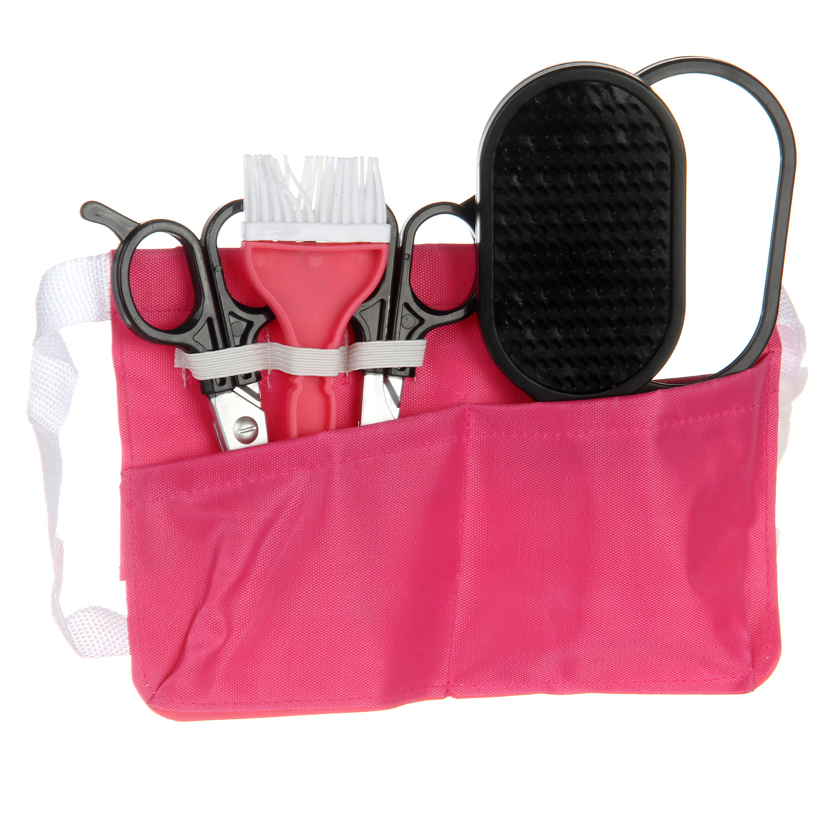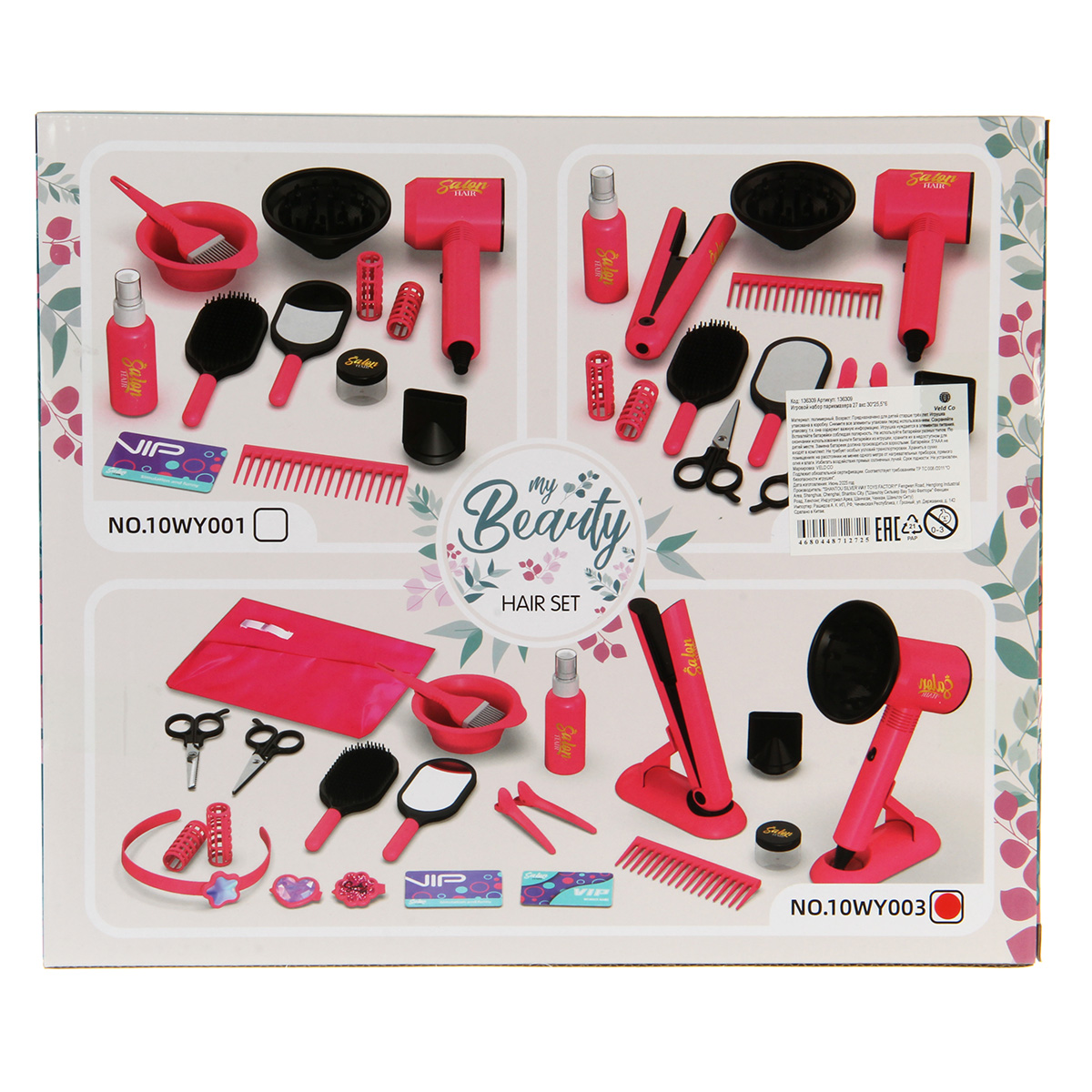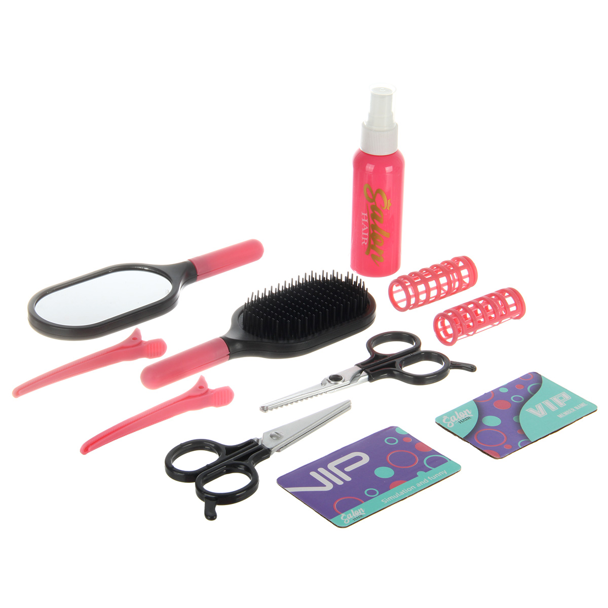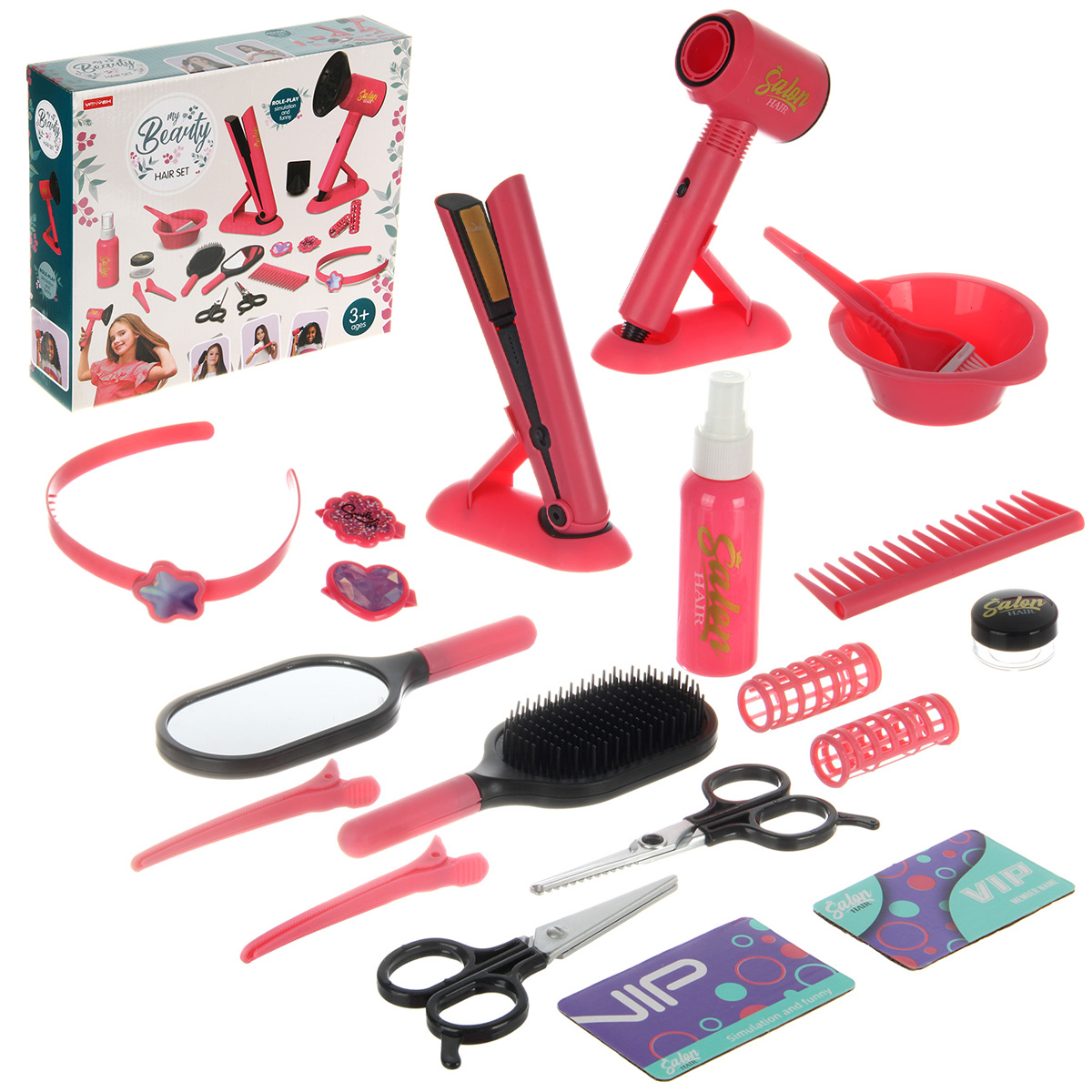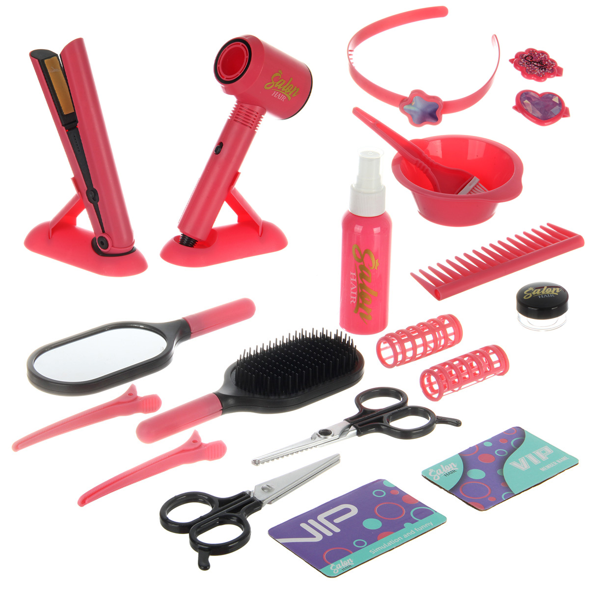 Ободок для волос, 2 заколки зажима, фен, насадка концентратор, насадка диффузор, бутылочка пульверизатор, массажная расческа, зеркало, ножницы, ножницы для филировки, парикмахерский пояс, кисточка для окрашивания, 2 заколки клипсы, 2 бигуди, 2 картонные карточки вип, ёмкость для окрашивания, подставка для утюжка, подставка для фена, утюжок для волос, расческа гребень, круглая баночка с крышкой.