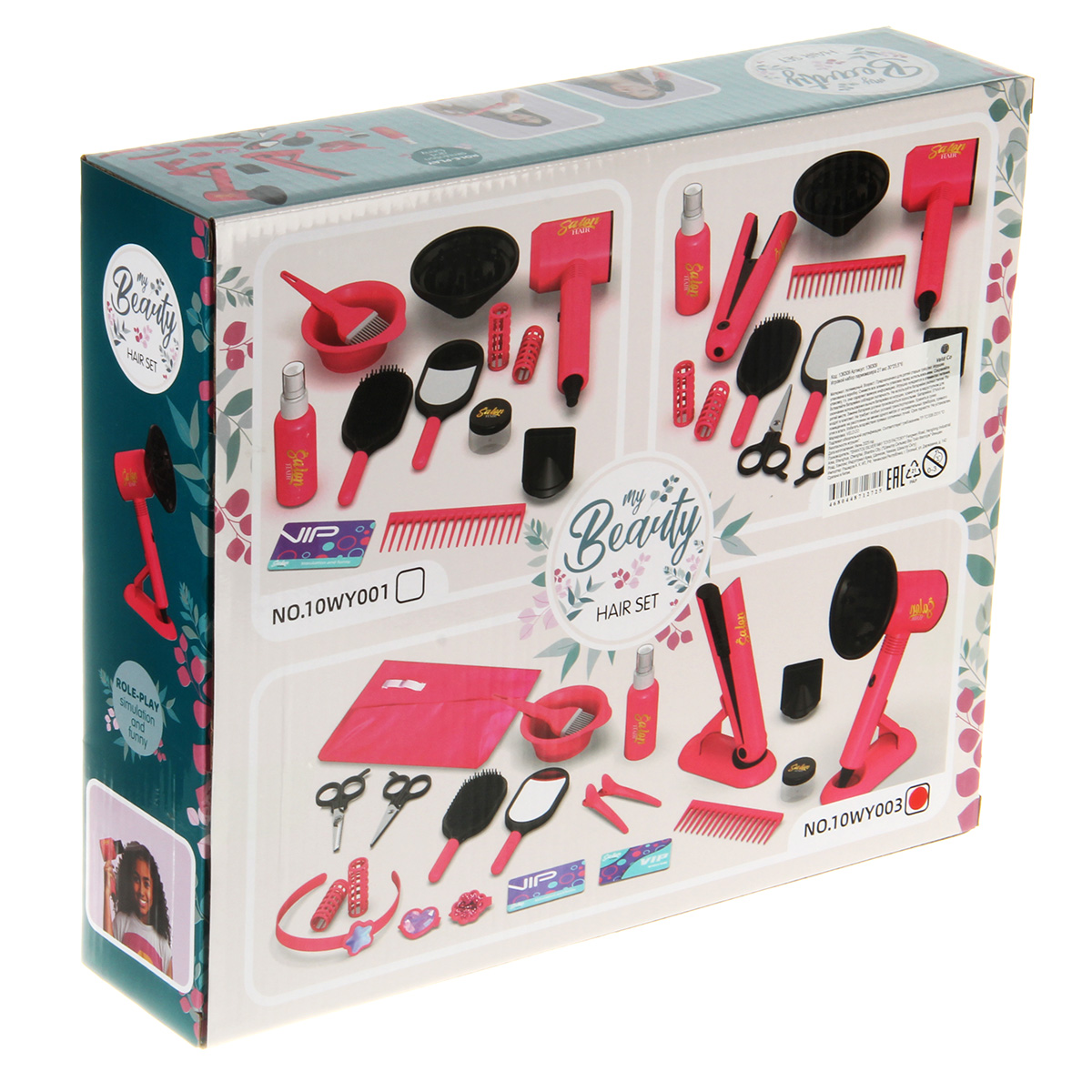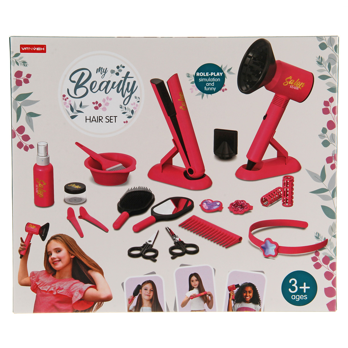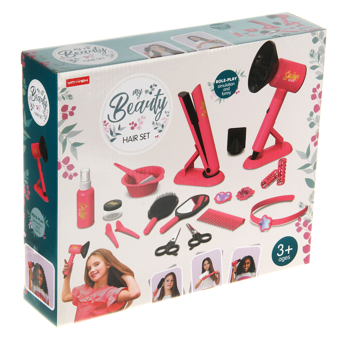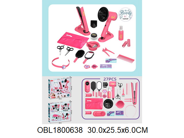 Игровой набор парикмахера с большим количеством предметов. Фен выдувает воздух, сменные насадки, более сильный и более слабый выдув, утюжок для волос имитирует процесс нагревания. Зеркало с отражающей поверхностью, ножницы с подвижными ручками, бутылочка пульверизатор, емкость и кисточка для окрашивания, симпатичная поясная сумочка с двумя кармашками. Прочные и долговечные материалы, качественное исполнение, внимание к деталям.