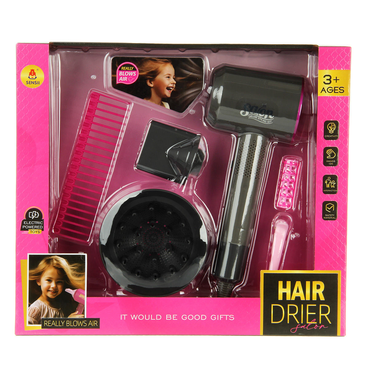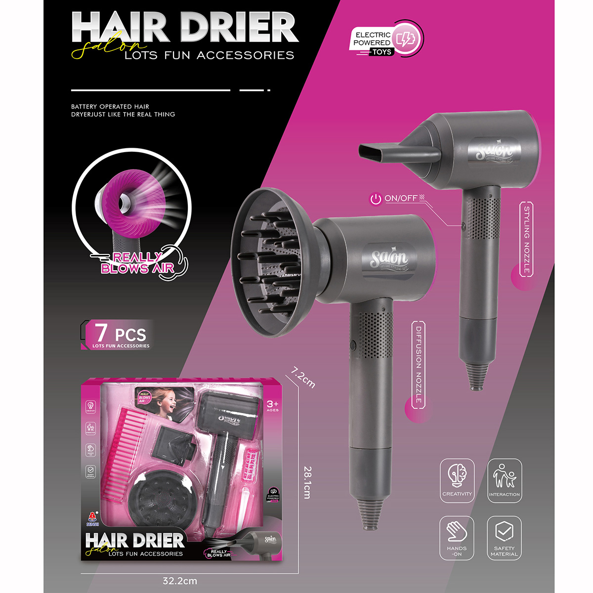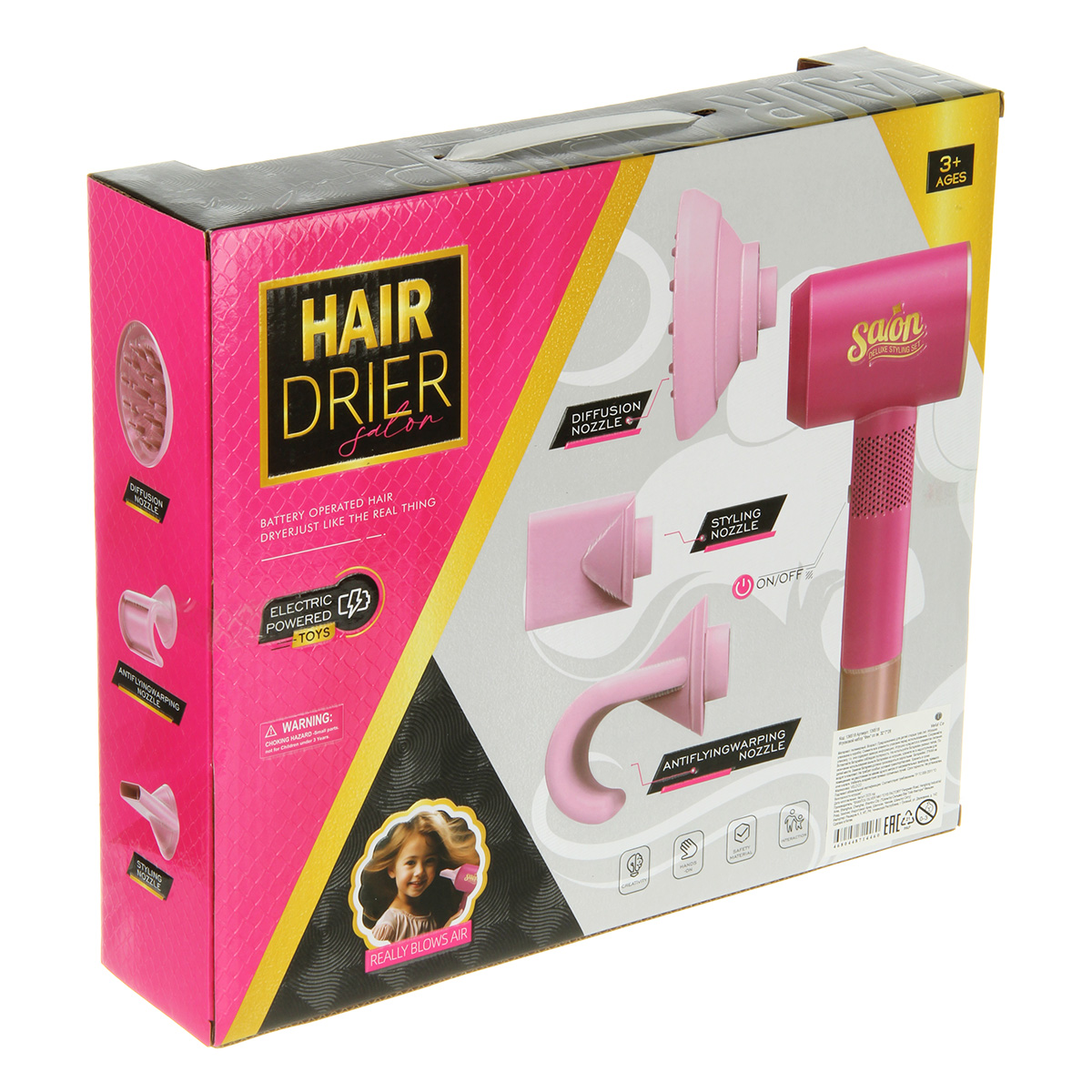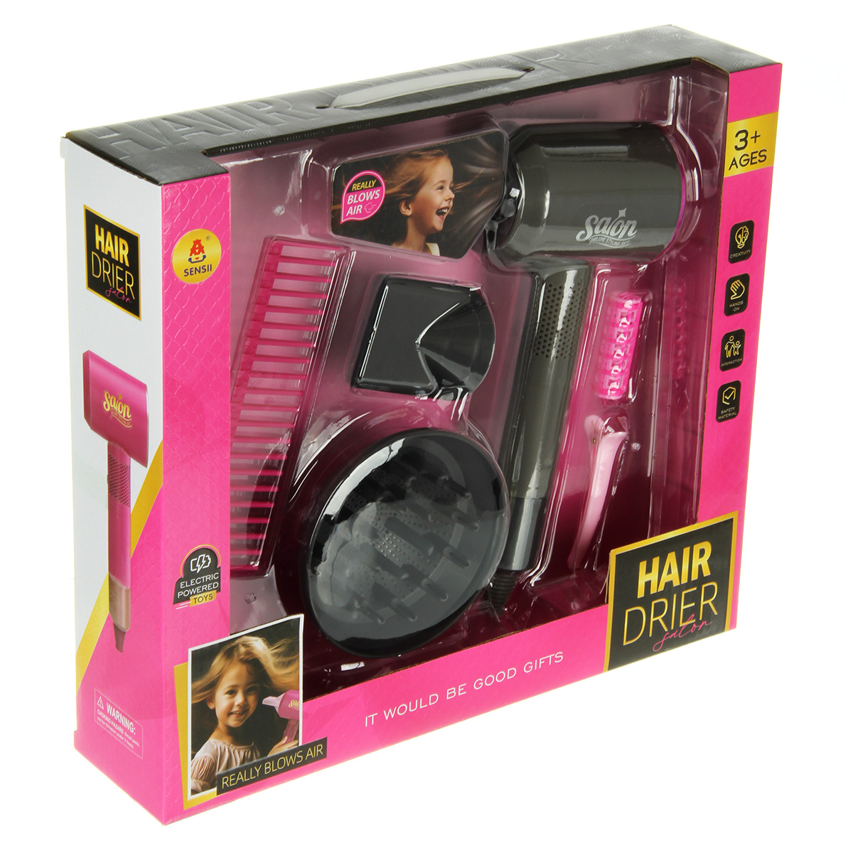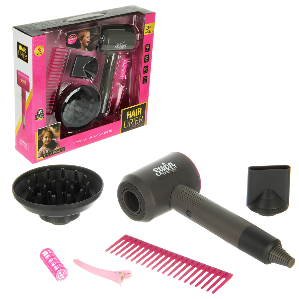 Игровой набор парикмахера для девочки. Игрушка фен с выдувом воздуха, звуком работающей техники и сменными насадками. Салон красоты детский в реалистичном дизайне, качественном исполнении, стильной расцветке. Набор стилиста детский изготовлен из прочных и долговечных материалов. Парикмахерский набор станет замечательным подарком для девочки на Новый год, День рождения, 8 марта.