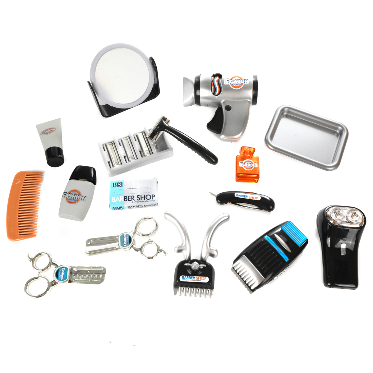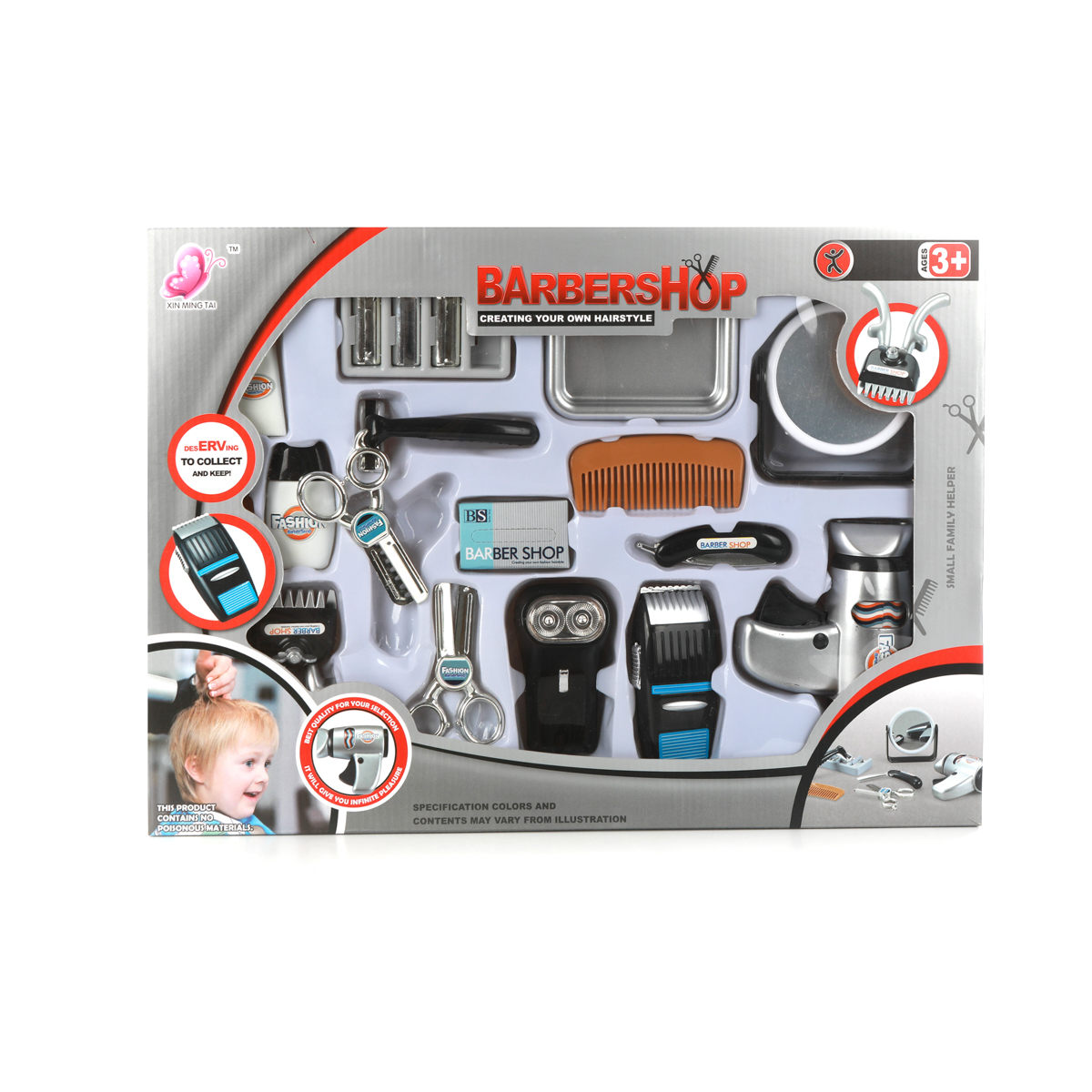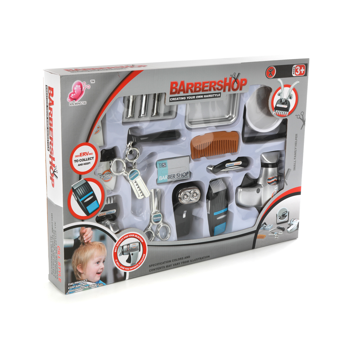 Игровой набор "Барбершоп" - это целая сокровищница необходимых и нужных предметов для создания крутого мужского образа! С таким набором легко можно стать самым лучшим барбером и стилистом на свете!В комплект входят: фен для сушки волос, 2 пары ножниц (обычные и филировочные), бритва с круглыми головками, расческа, зеркальце с подставкой, флакон одеколона, 2 крема в тубе, бритвенный станок, набор сменных лезвий к нему (3 штуки), поднос, механическая машинка для стрижки волос, электрическая машинка для стрижки волос, муляж картонной коробочки для бритвенных лезвий, профессиональная парикмахерская бритва.Фен умеет "сушить волосы" при нажатии на кнопку - лопасти и разноцветная катушка внутри проворачиваются, издавая шум. Ножнички умеют чуть-чуть резать, зеркальце проворачивается, крышечки у кремов и флакона с одеколоном снимаются.У электрической бритвы с двумя бритвенными головками вжимаются внутрь бритвенные блоки.У профессиональной парикмахерской бритвы выдвигается лезвие. У электрической машинки для стрижки волос двигается вправо-влево насадка и отодвигается кнопка.У механической машинки для стрижки волос можно сдвинуть ручки, раздастся характерный звук.Все детали игрушки очень качественно обработаны, не имеют острых углов, сколов и зазубрин, такой набор абсолютно безопасен для ребенка.Игрушка прекрасно развивает мелкую моторику рук, знакомит с цветами и формами, тренирует координацию движений, воображение, позволяет сыграть во множество увлекательных сюжетно-ролевых игр и придумать огромное количество классных и модных стрижек! Игрушка изготовлена из высококачественной пластмассы.Размеры предметов около 11*5*11 см.Размеры коробки: 48*6,5*34 см.