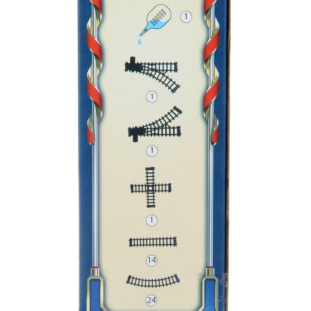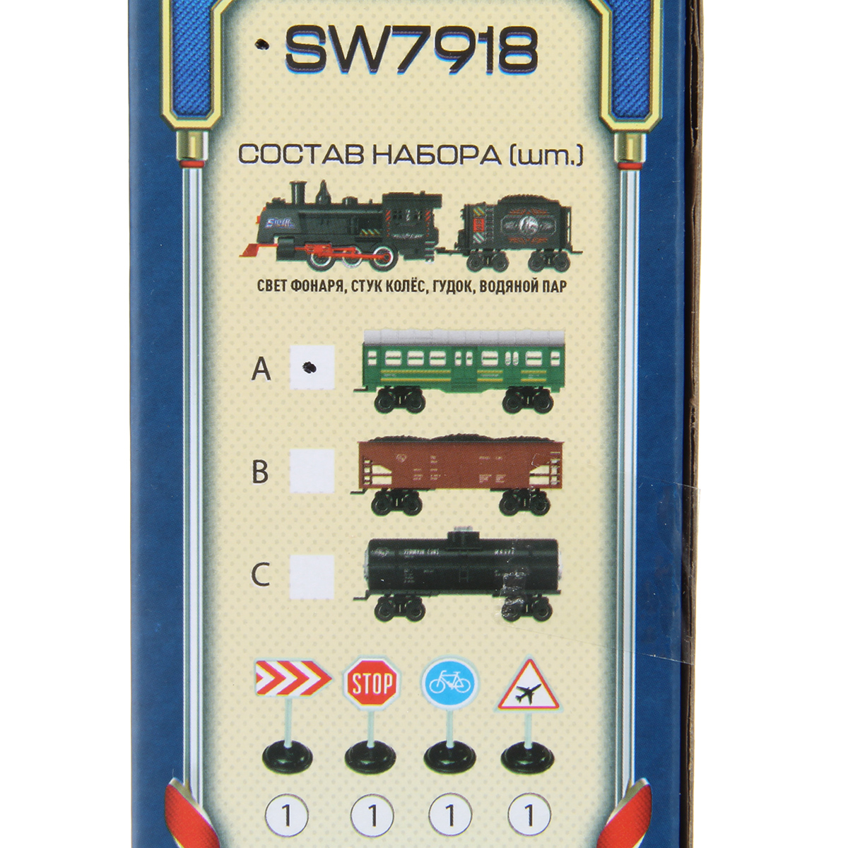 В наборе локомотив, 2 вагона, 4 дорожных знака, бутылочка для воды, 2 элемента дороги со стрелками, перекресток, 38 деталей для сборки дороги.