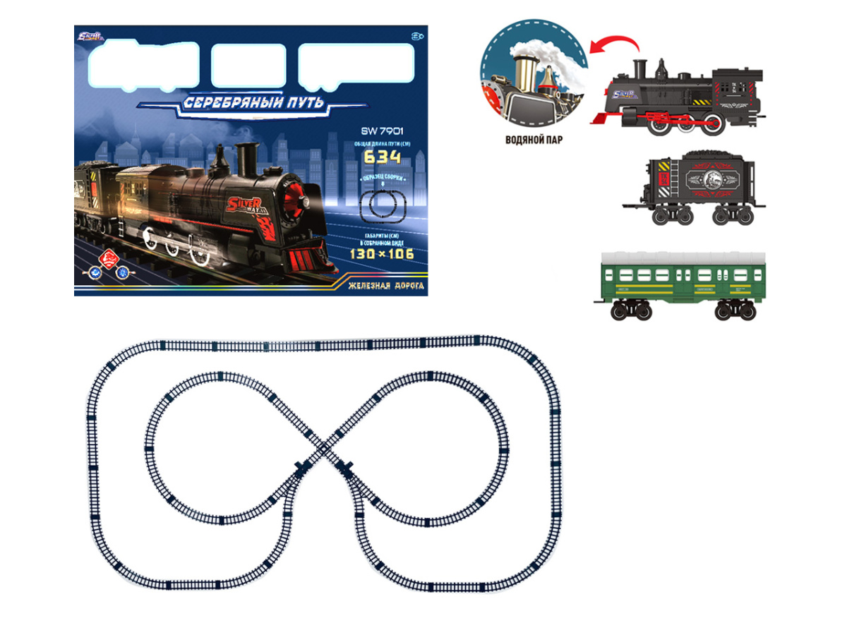 Игрушка поезд имеет эффектную подсветку, издает различные звуки, из трубы идет водяной пар, дорожные знаки в комплекте. Благодаря наличию элементов со стрелками можно менять направление движения поезда.