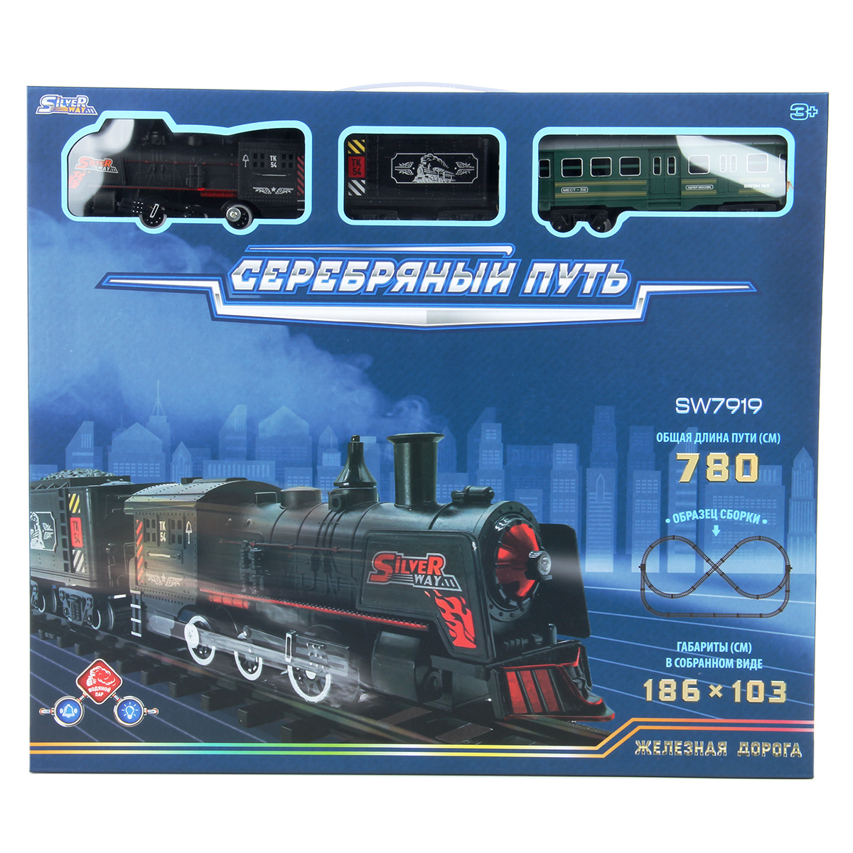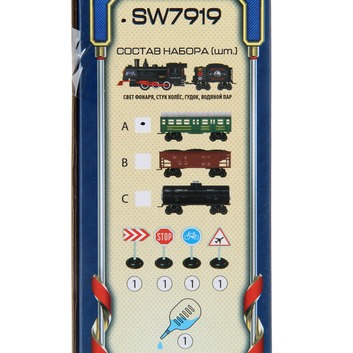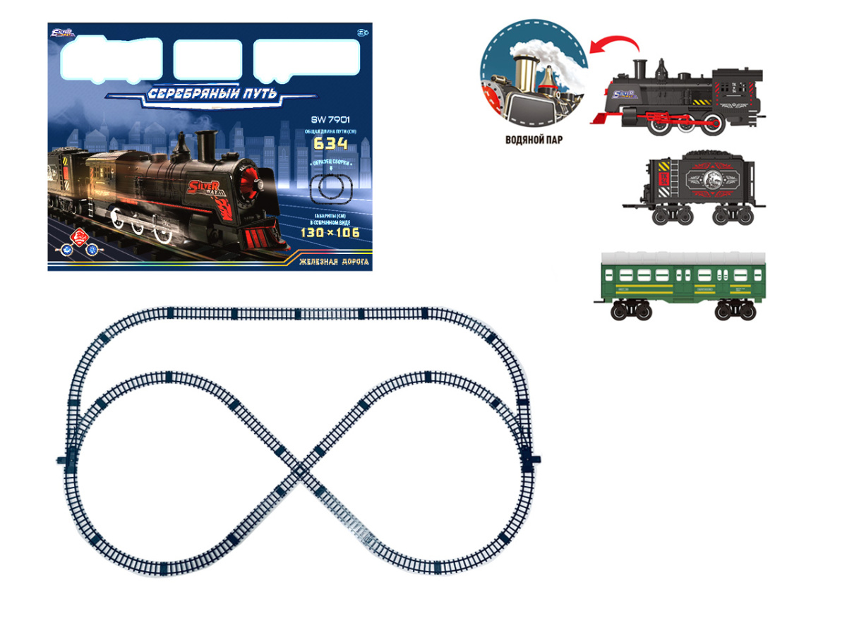 Игрушка поезд имеет эффектную подсветку, издает различные звуки, из трубы идет водяной пар, дорожные знаки в комплекте. Благодаря наличию элементов со стрелками можно менять направление движения поезда.