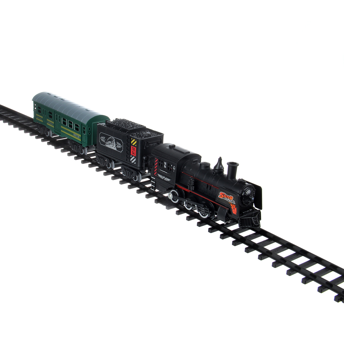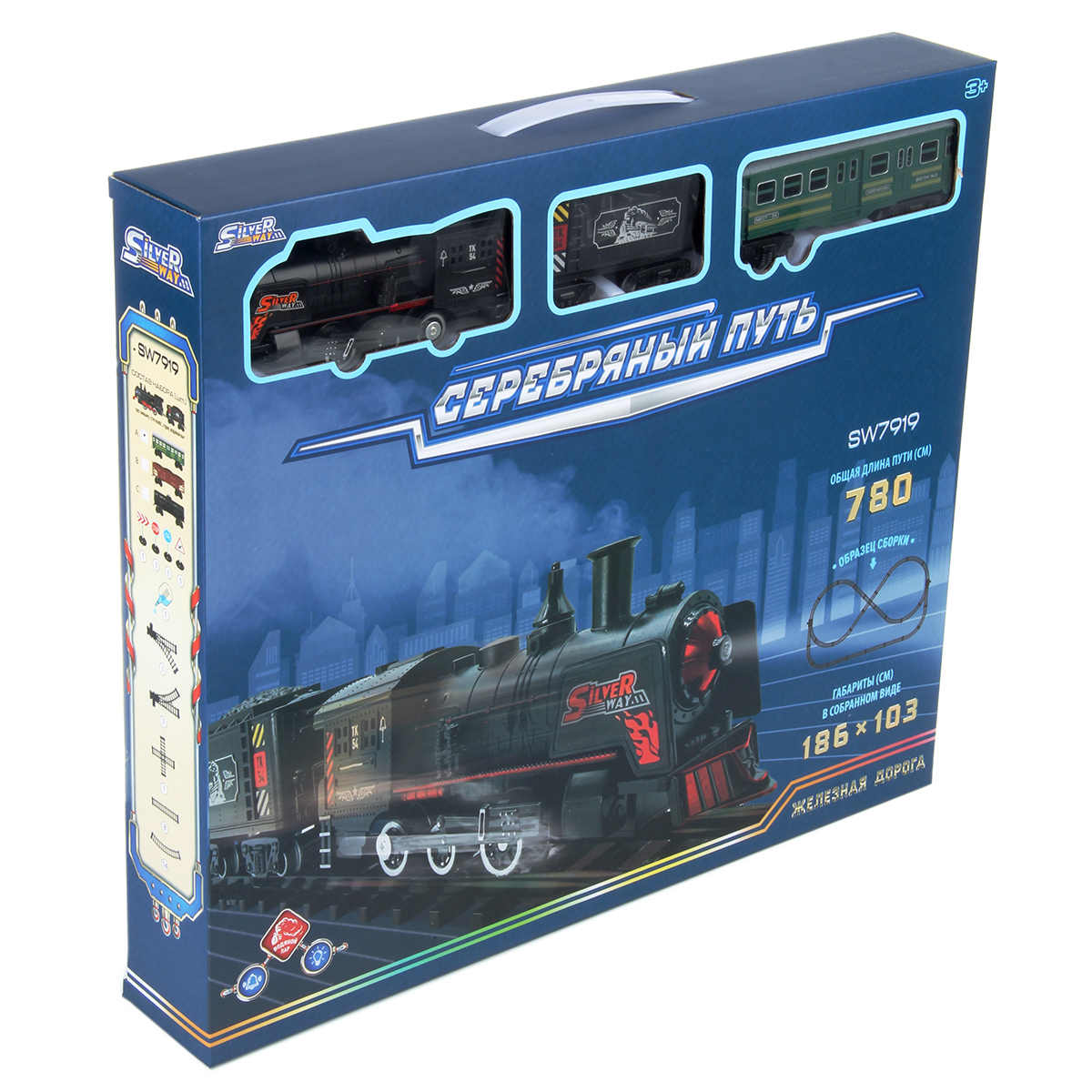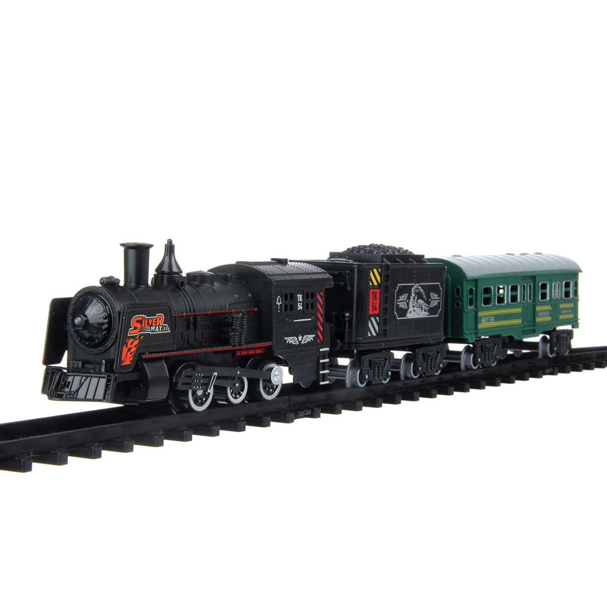Игрушка поезд имеет эффектную подсветку, издает различные звуки, из трубы идет водяной пар, дорожные знаки в комплекте. Благодаря наличию элементов со стрелками можно менять направление движения поезда.