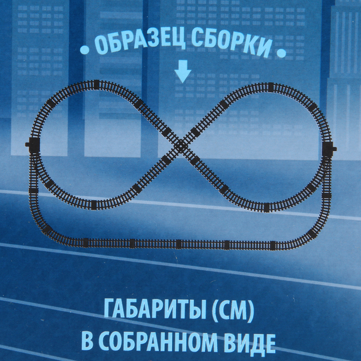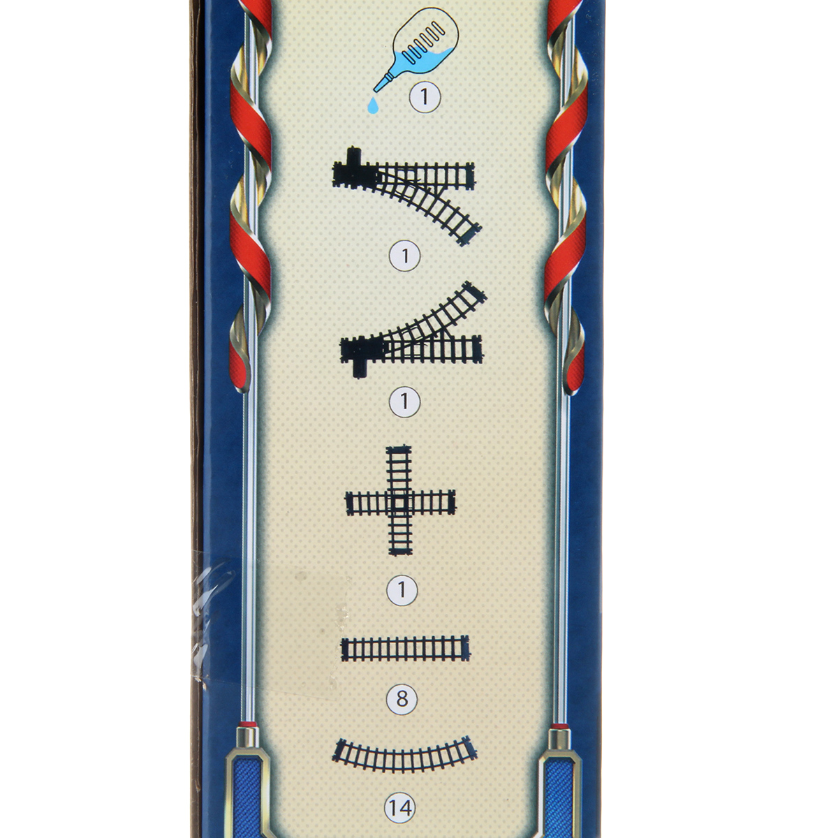 В наборе локомотив, 2 вагона, 4 дорожных знака, бутылочка для воды, 2 элемента дороги со стрелками, 1 перекресток, 22 детали для сборки дороги.