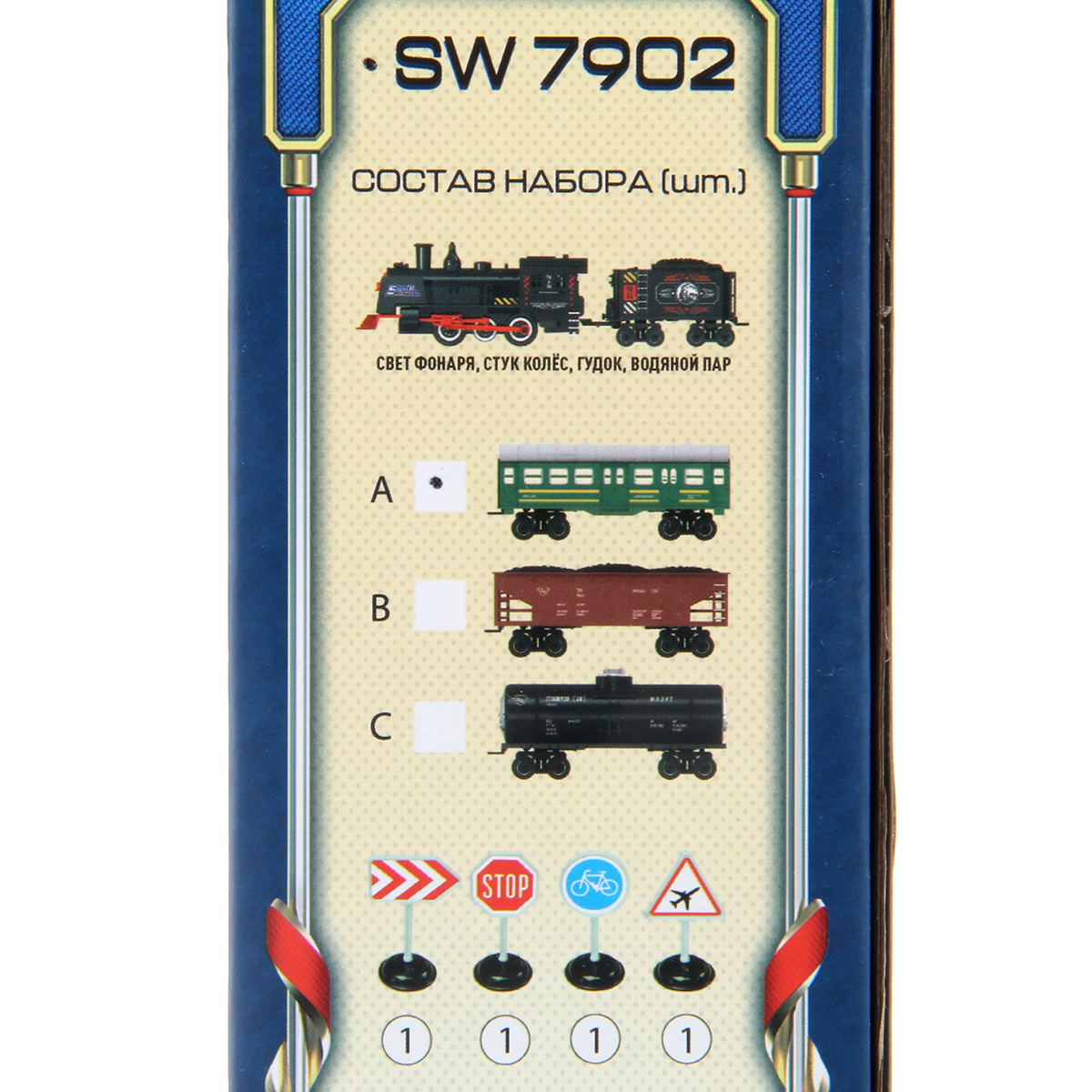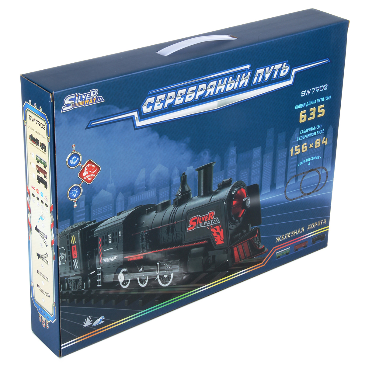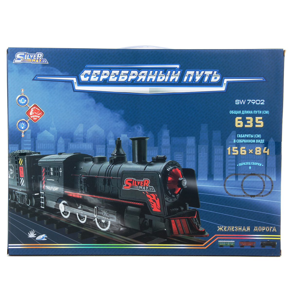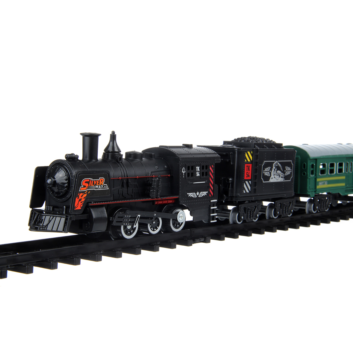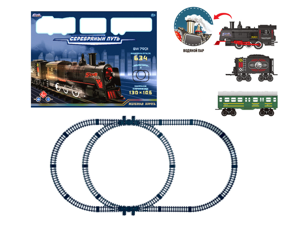 Игрушка поезд имеет эффектную подсветку, издает различные звуки, из трубы идет водяной пар, дорожные знаки в комплекте. Благодаря наличию элементов со стрелками можно менять направление движения поезда.