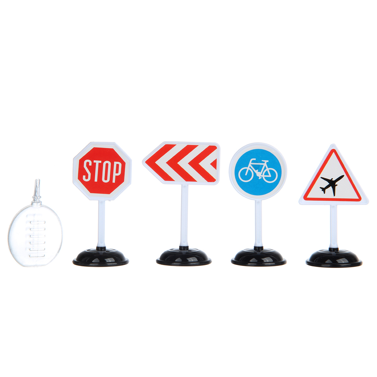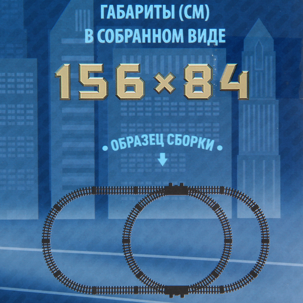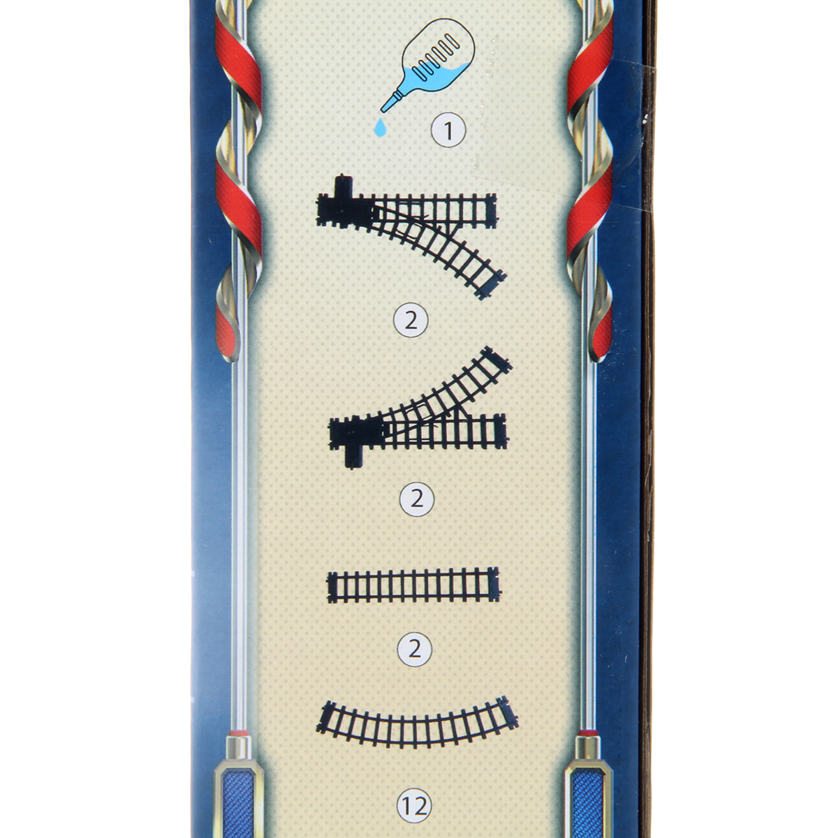 В наборе локомотив, 2 вагона, 4 дорожных знака, бутылочка для воды, 4 элемента дороги со стрелками, 14 элементов для сборки дороги.
