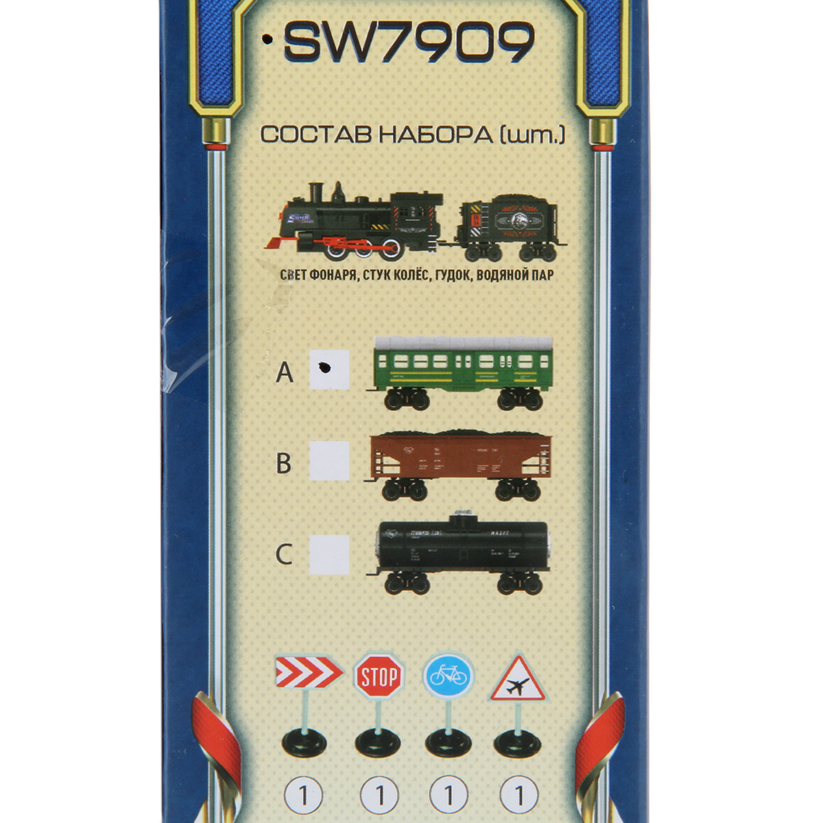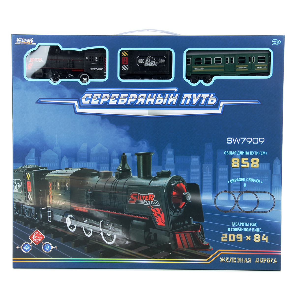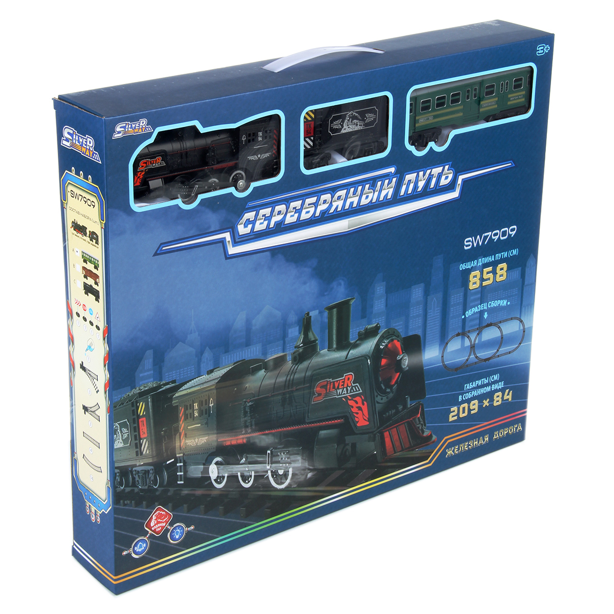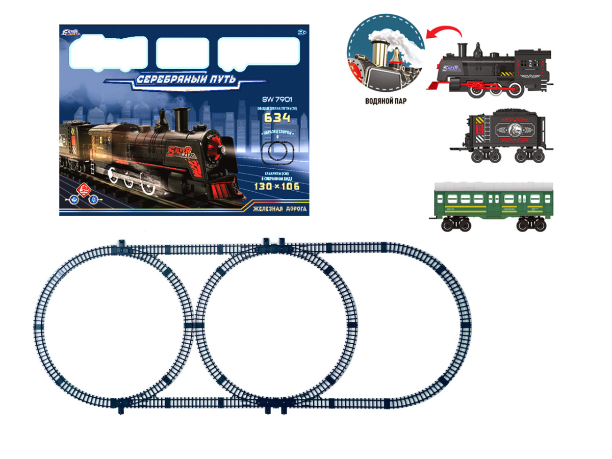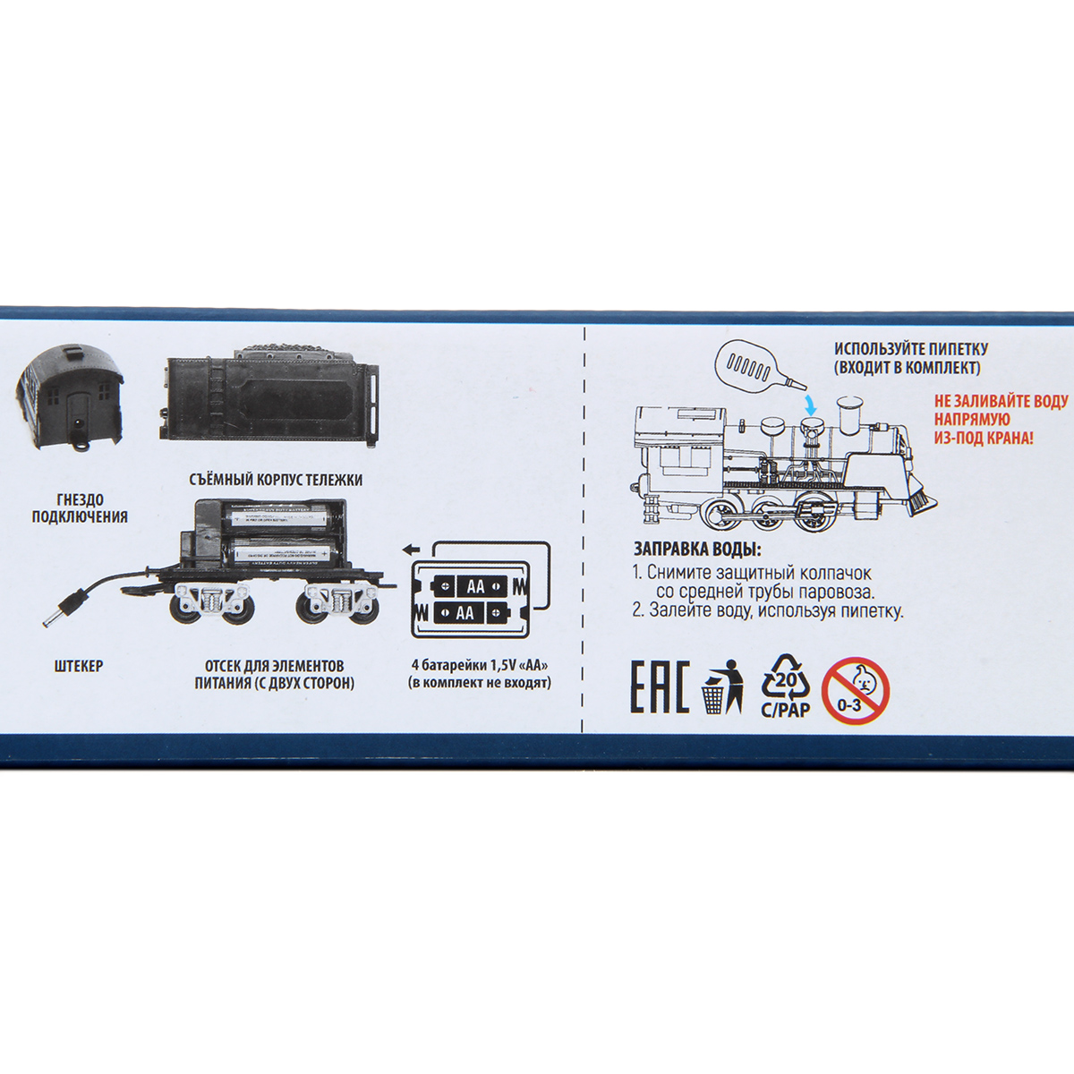 Игрушка поезд имеет эффектную подсветку, издает различные звуки, из трубы идет водяной пар, дорожные знаки в комплекте. Благодаря наличию элементов со стрелками можно менять направление движения поезда.