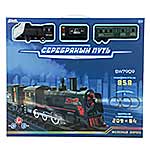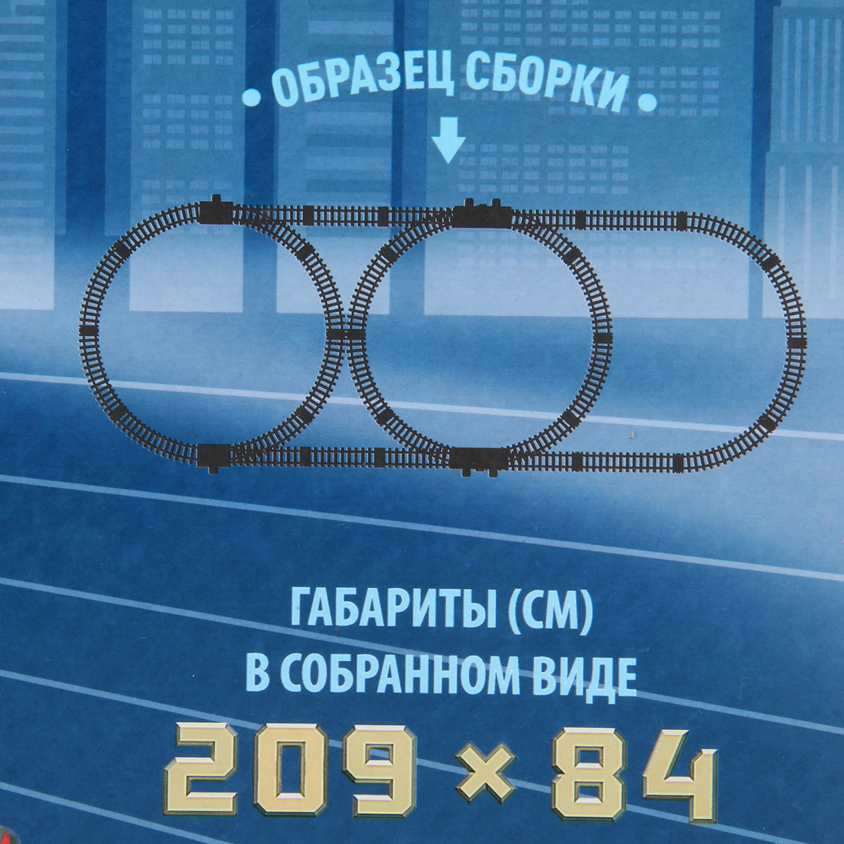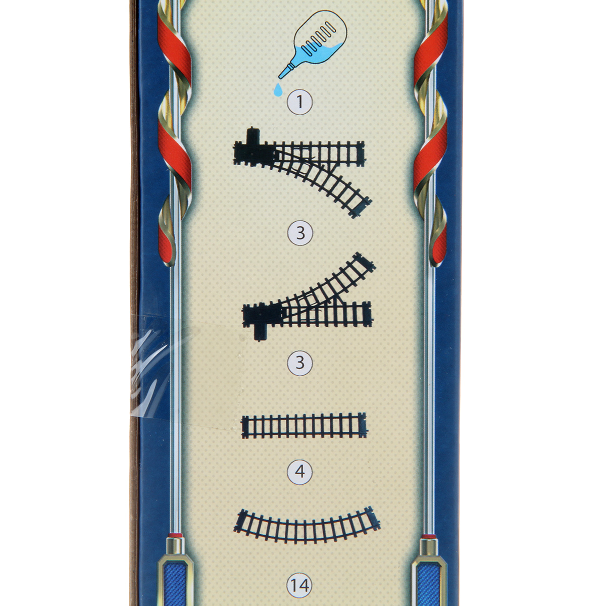 В наборе локомотив, 2 вагона, 4 дорожных знака, бутылочка для воды, 6 элементов дороги со стрелками, 18 элементов для сборки железной дороги.