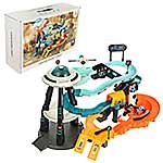 Комплектация. Детали для сборки трека, 4 машинки, инструкция по сборке на английском языке, набор наклеек.
