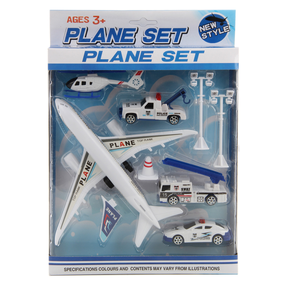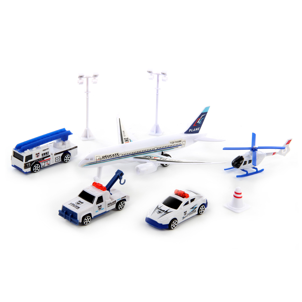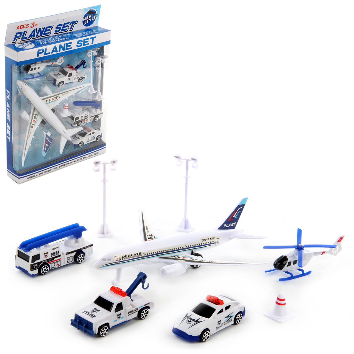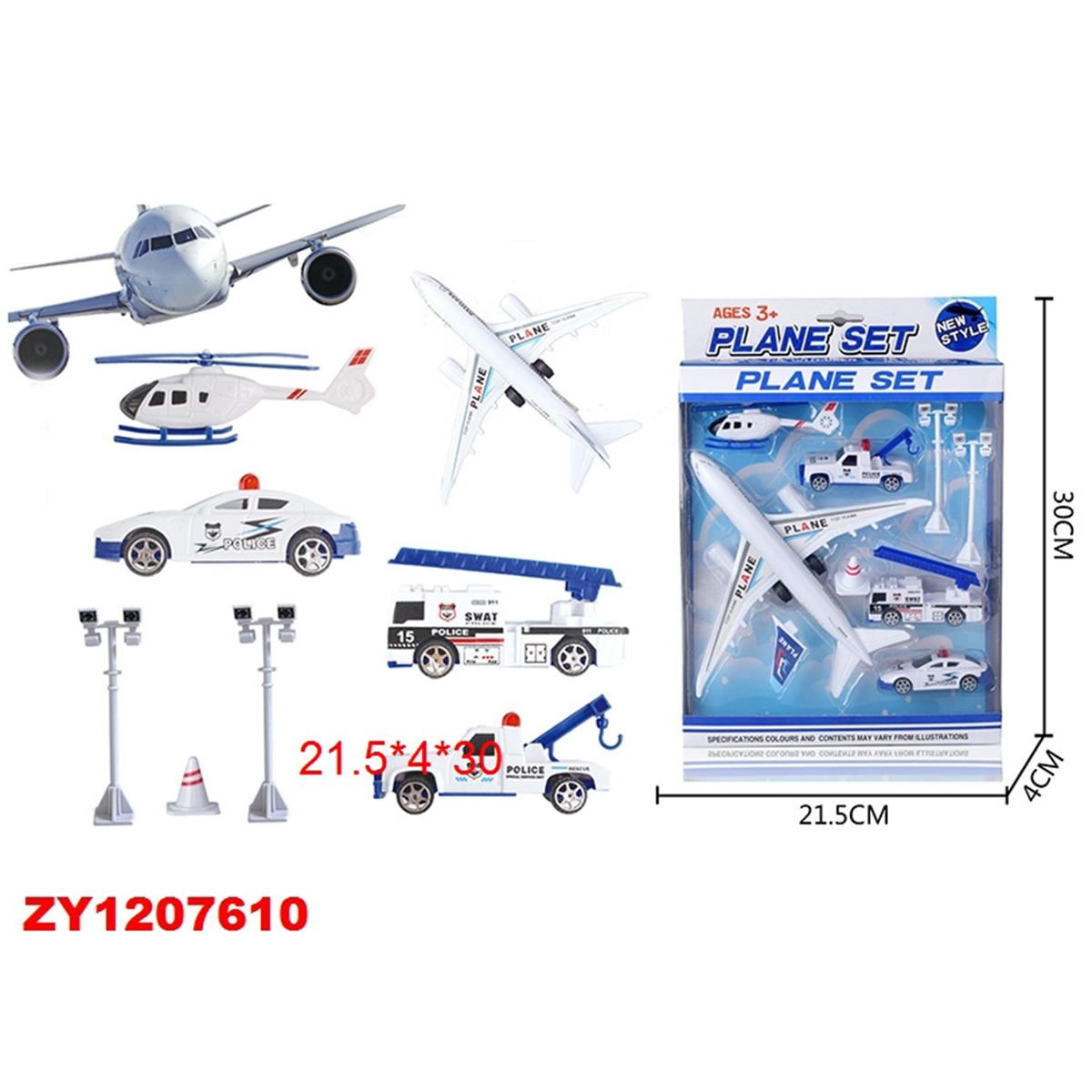 В комплекте самолет, 3 машинки, вертолет, фонари и конус.