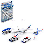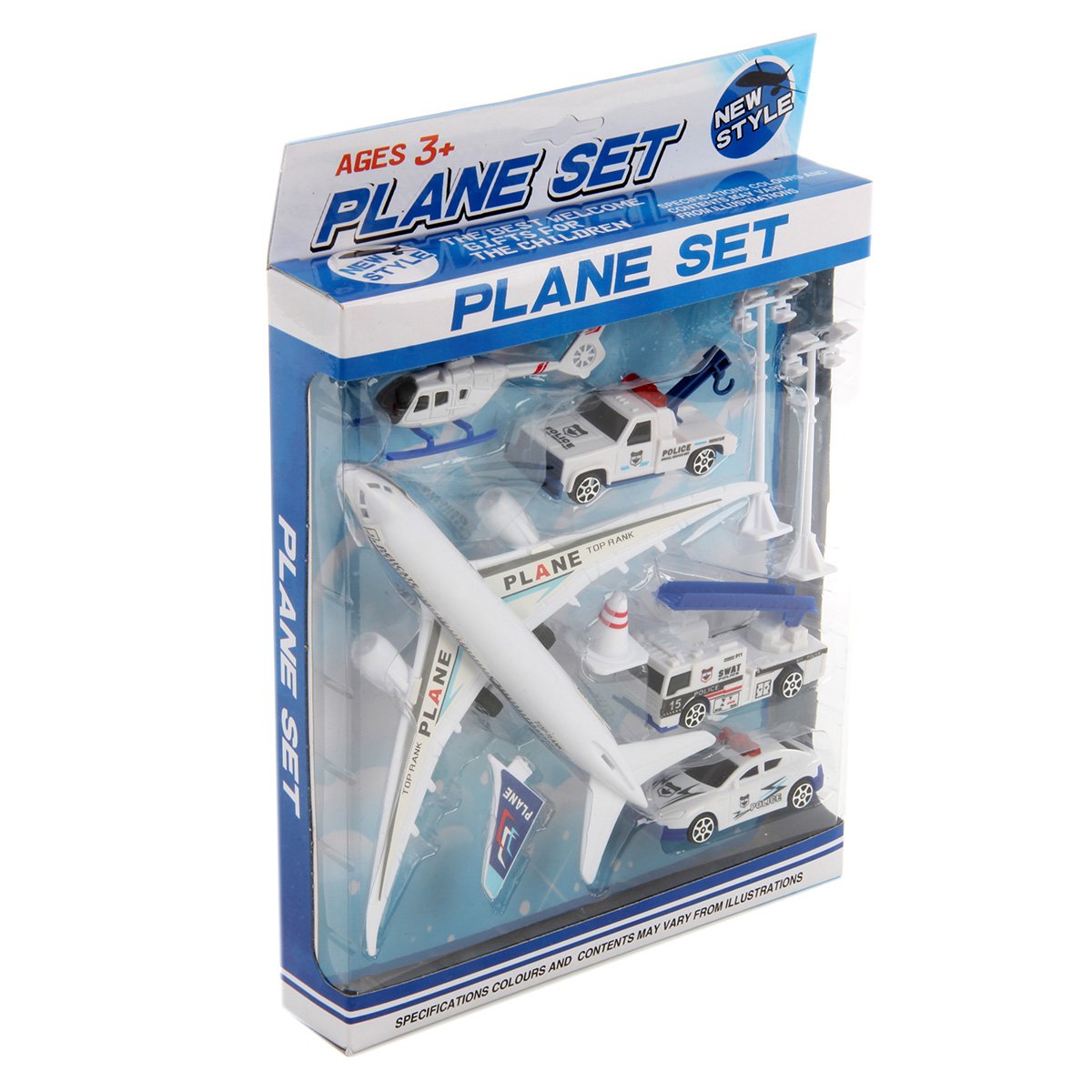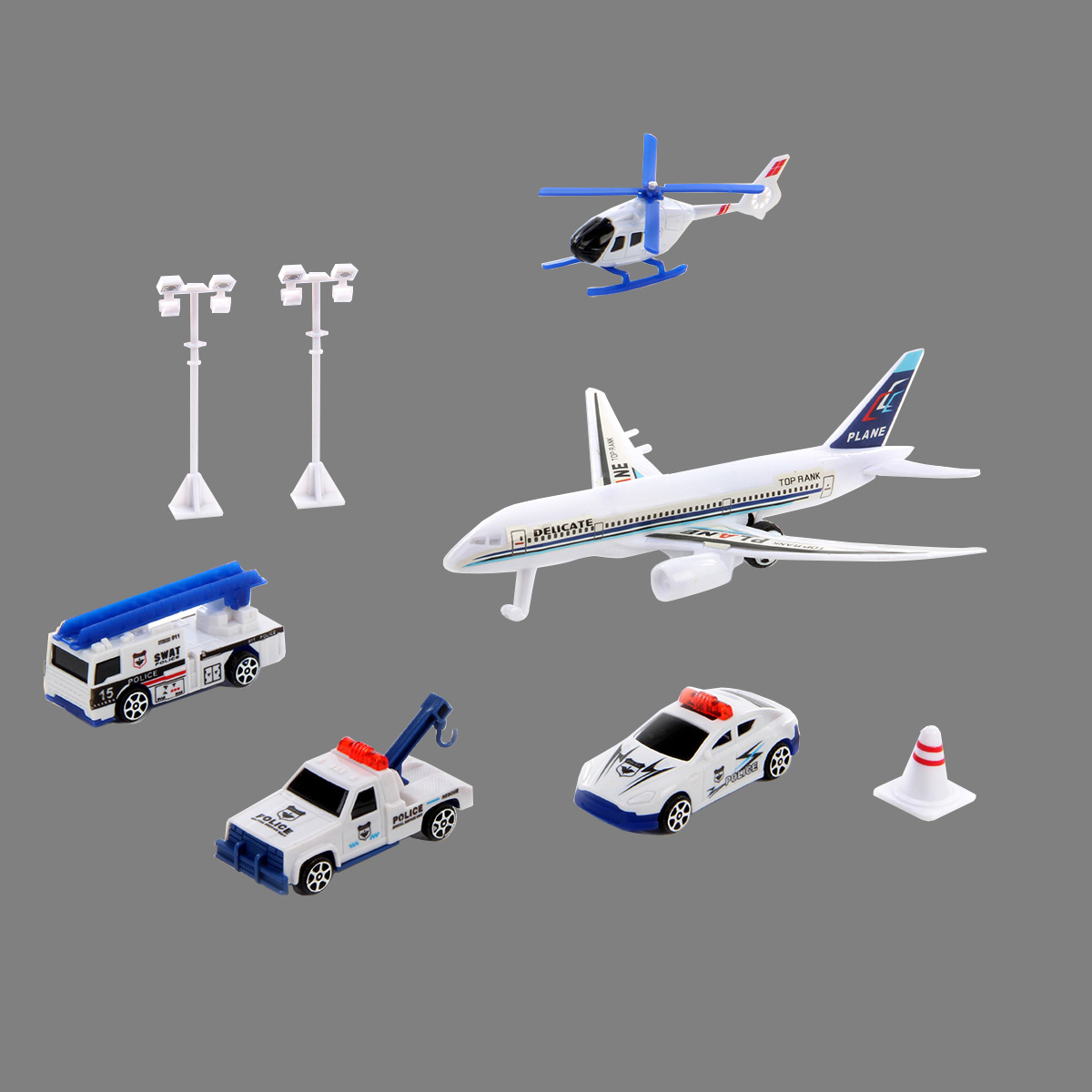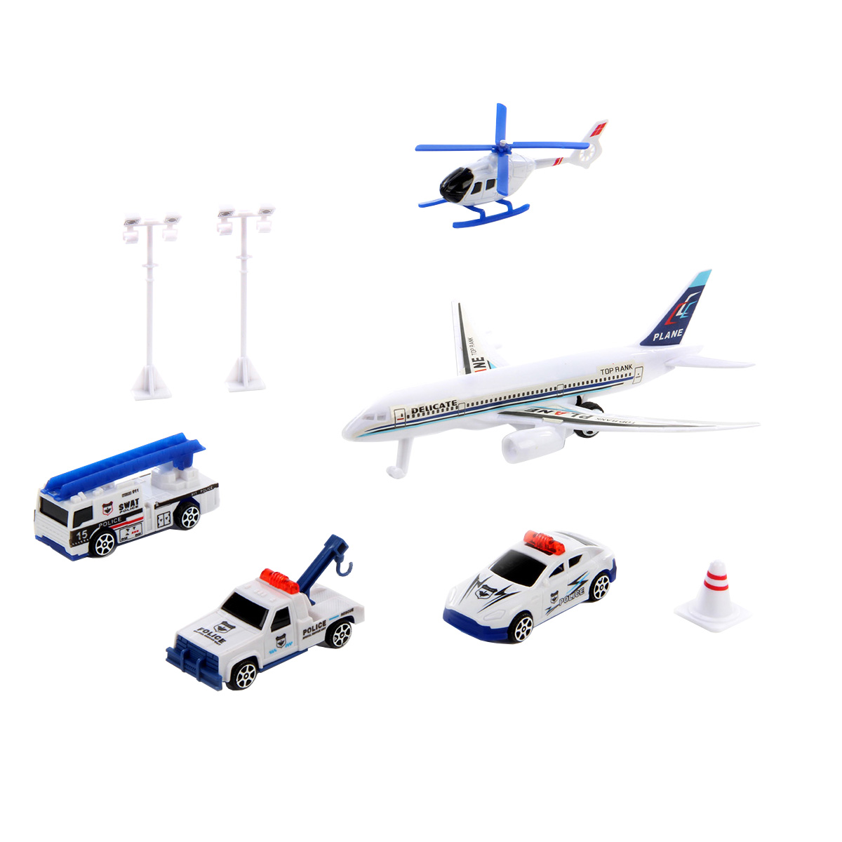 В комплекте самолет, 3 машинки, вертолет, фонари и конус.