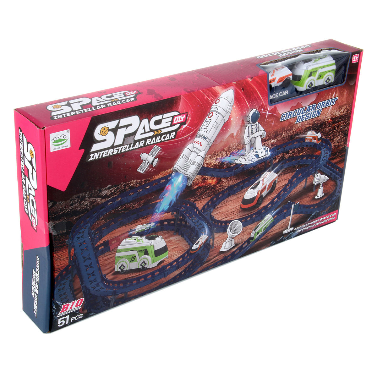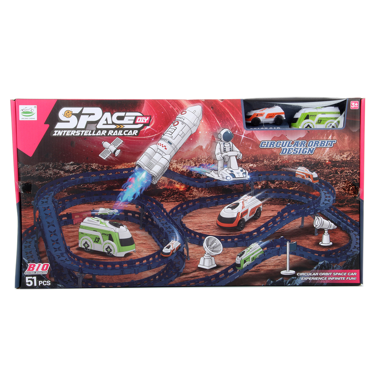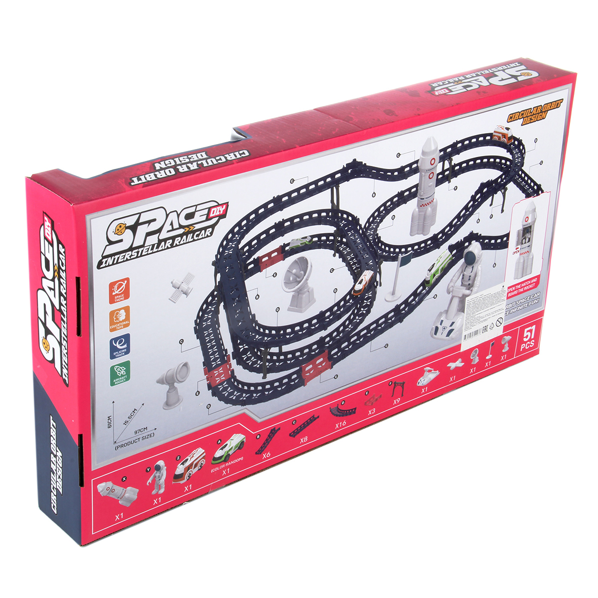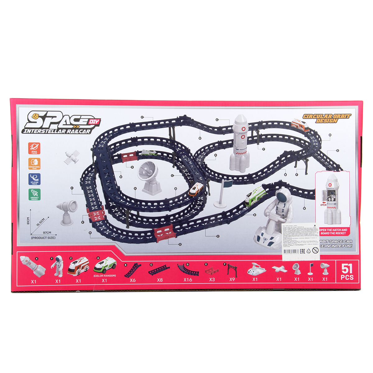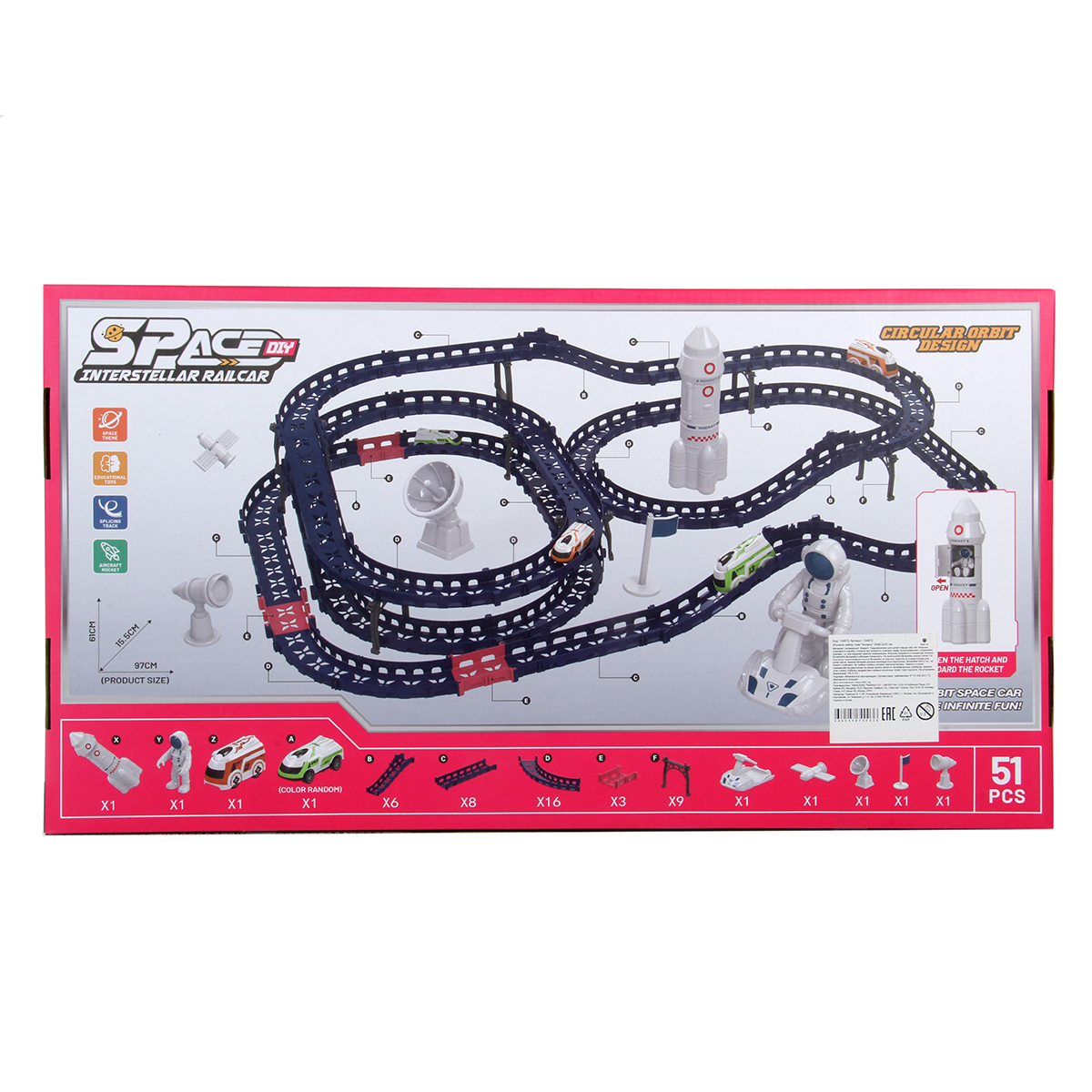 42 детали для сборки трека, 2 машинки, детали для сборки ракеты, космонавта, скутера, антенны, сегмента МКС, телескопа, флажка.