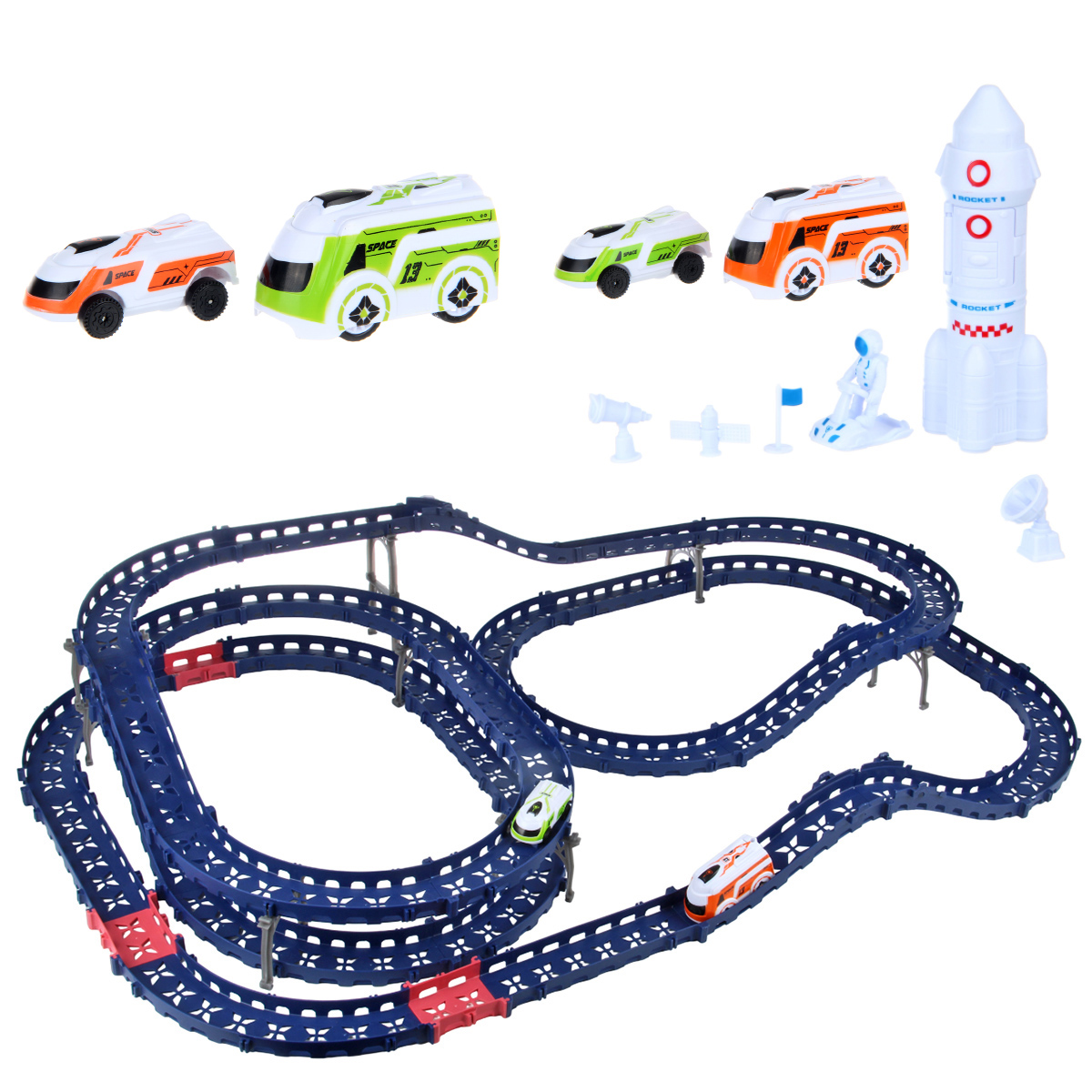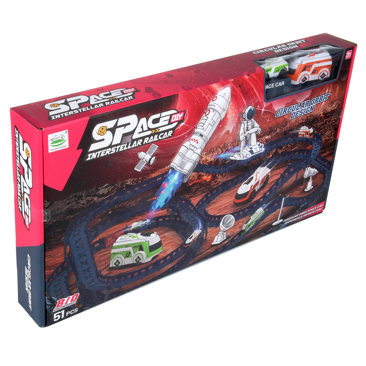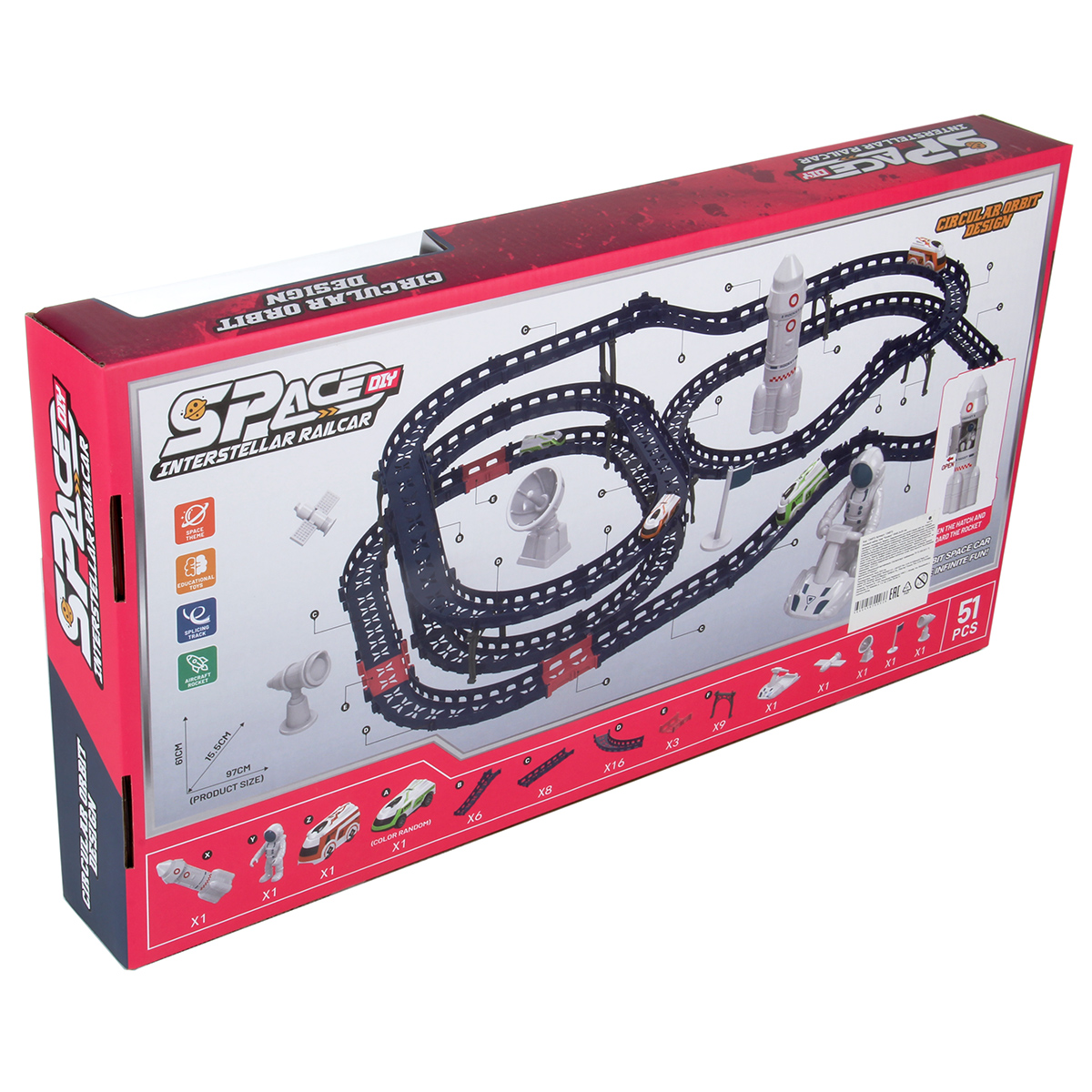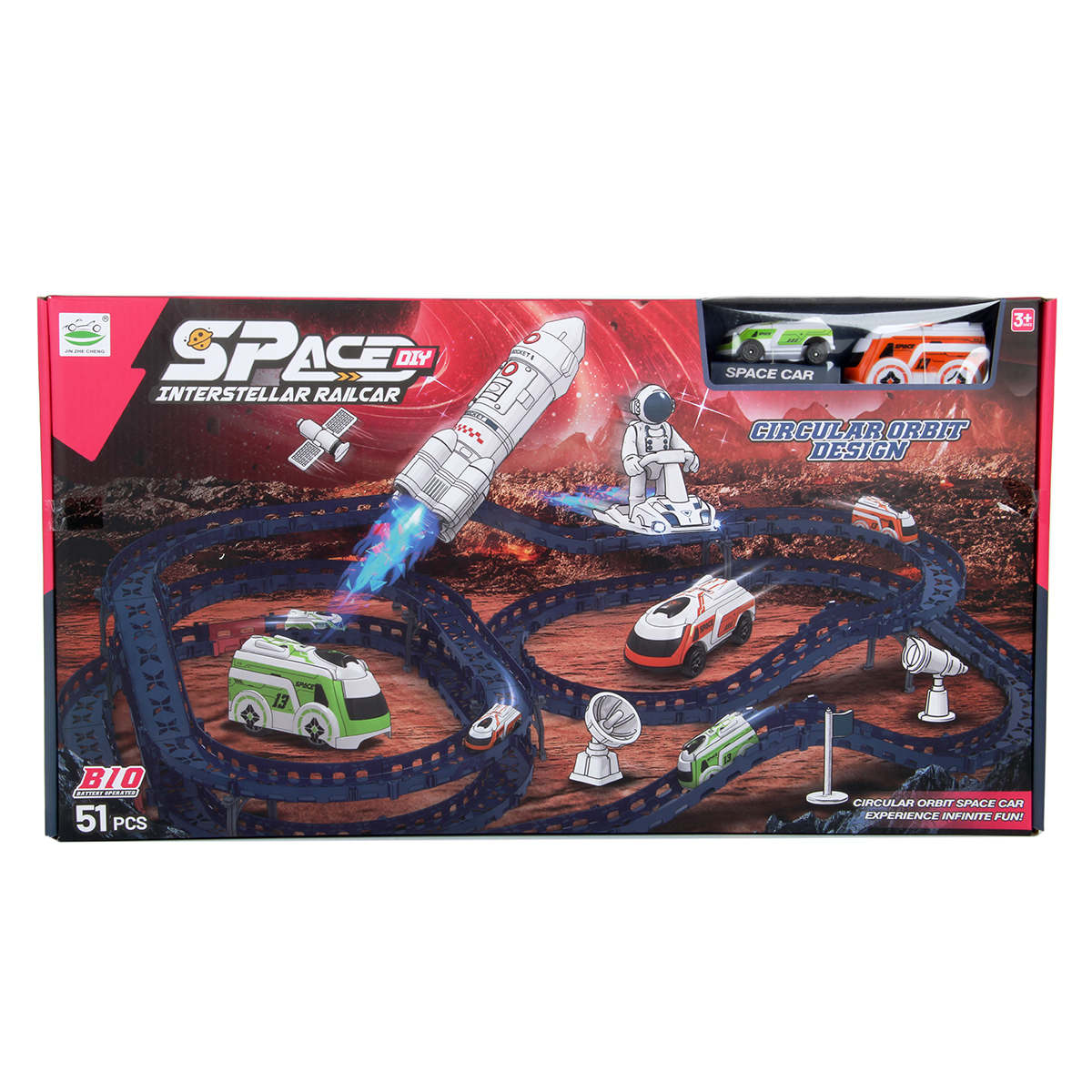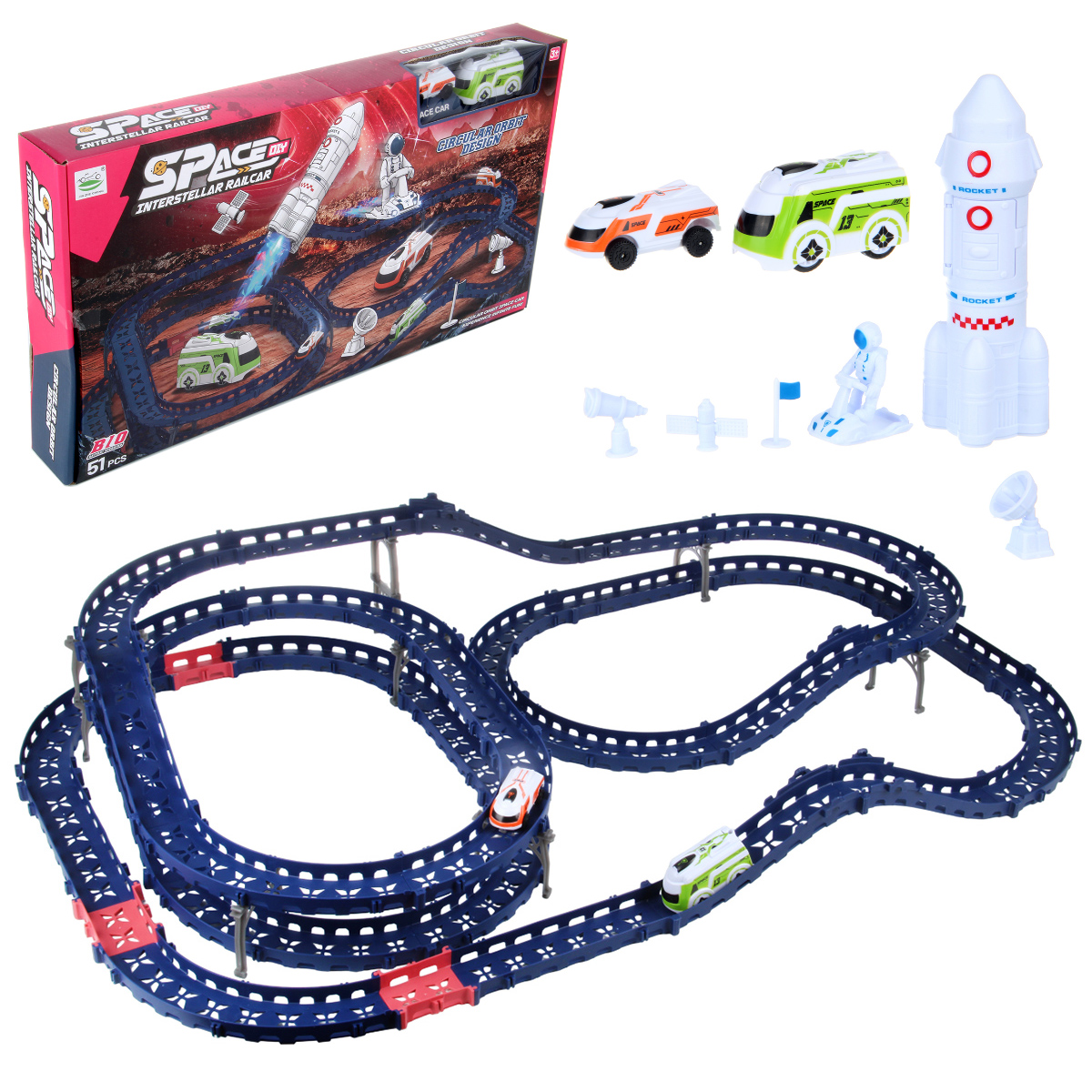 42 детали для сборки трека, 2 машинки, детали для сборки ракеты, космонавта, скутера, антенны, сегмента МКС, телескопа, флажка.