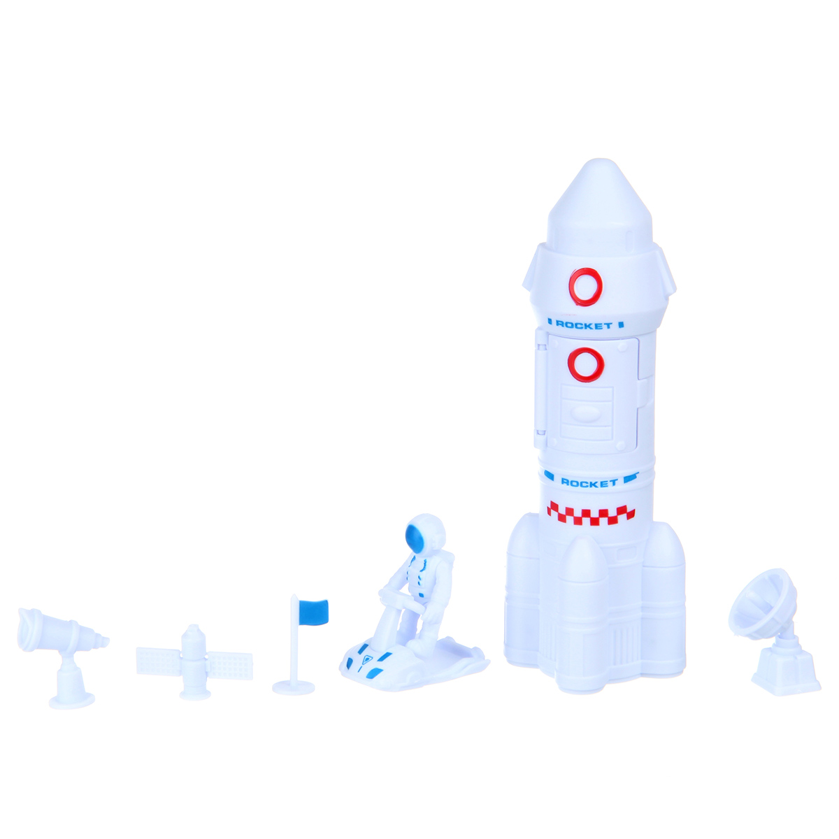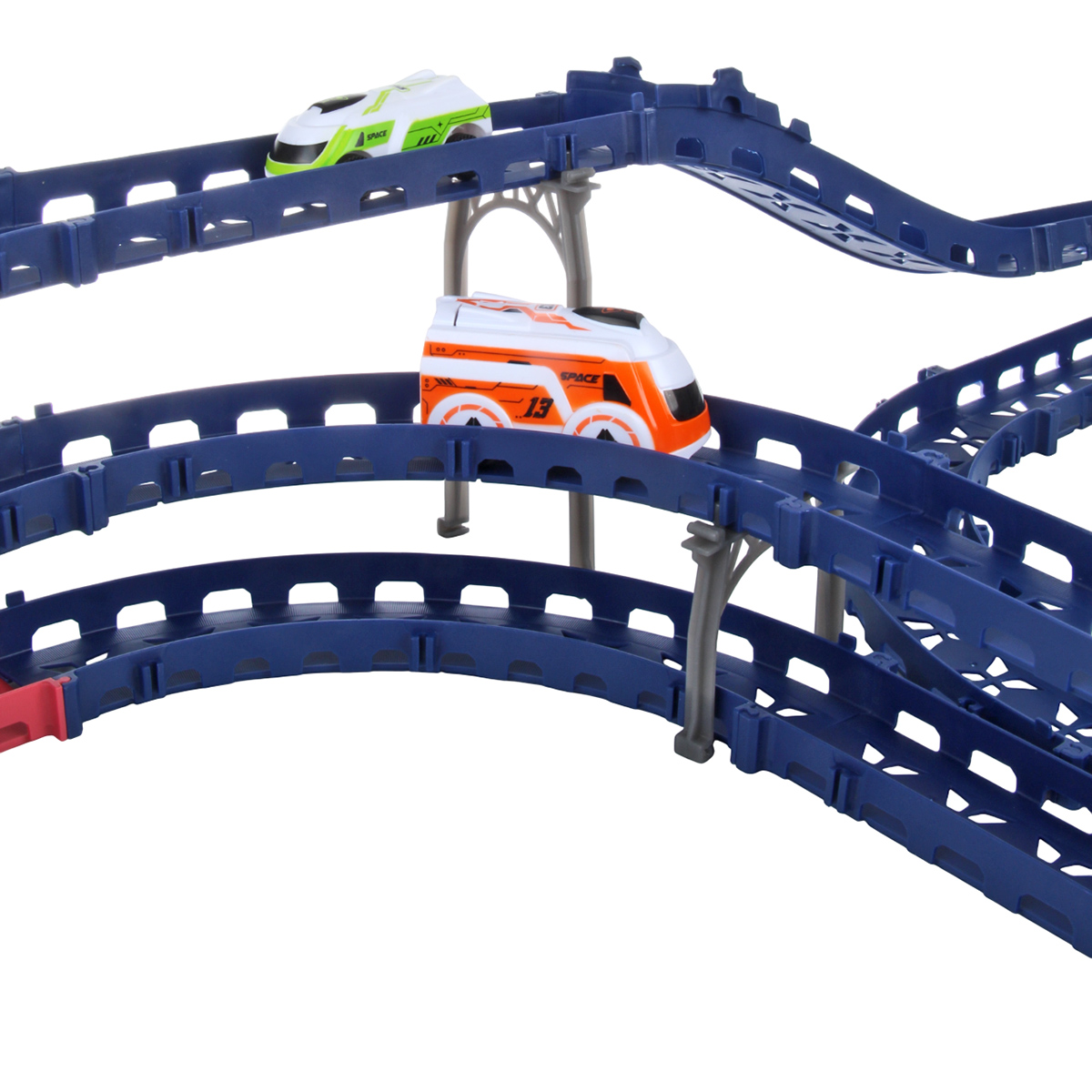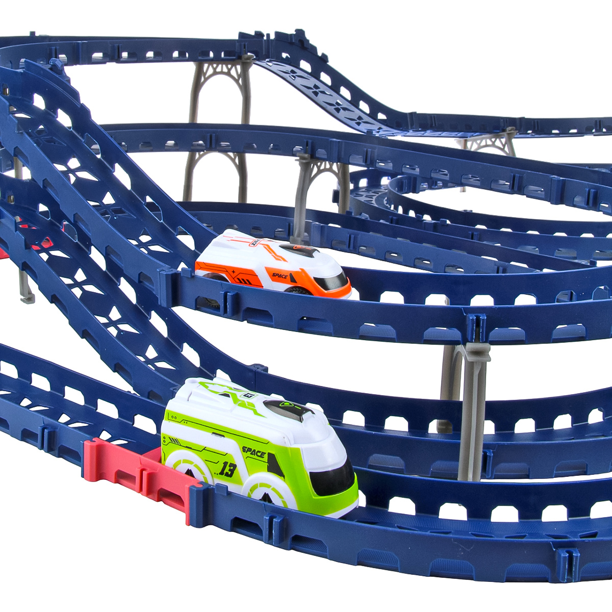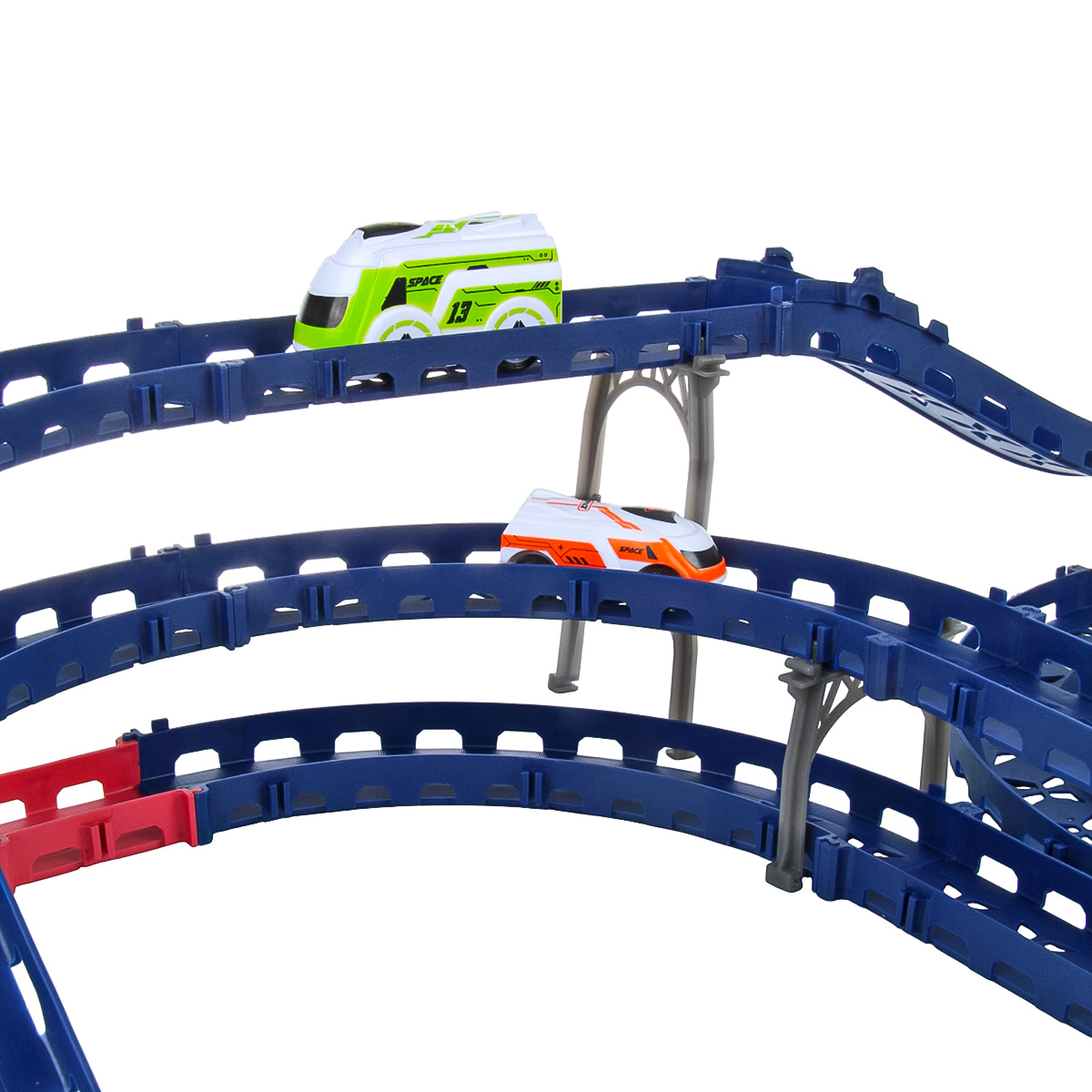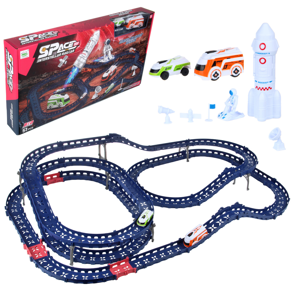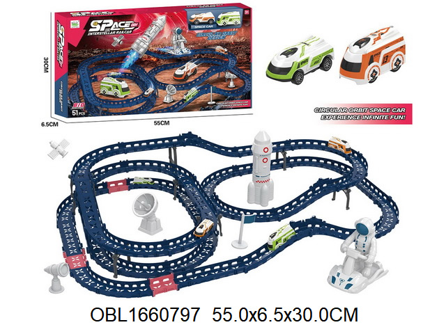 42 детали для сборки трека, 2 машинки, детали для сборки ракеты, космонавта, скутера, антенны, сегмента МКС, телескопа, флажка.