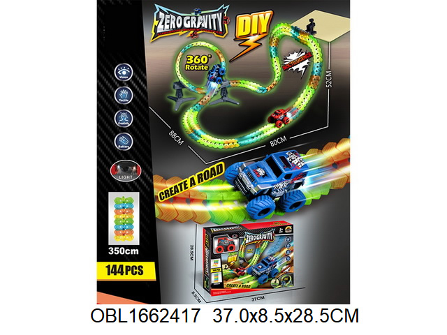 144 детали для сборки трека, 4 детали для сборки машинки, набор наклеек, аккумулятор 3.7 V, USB кабель, отвертка.