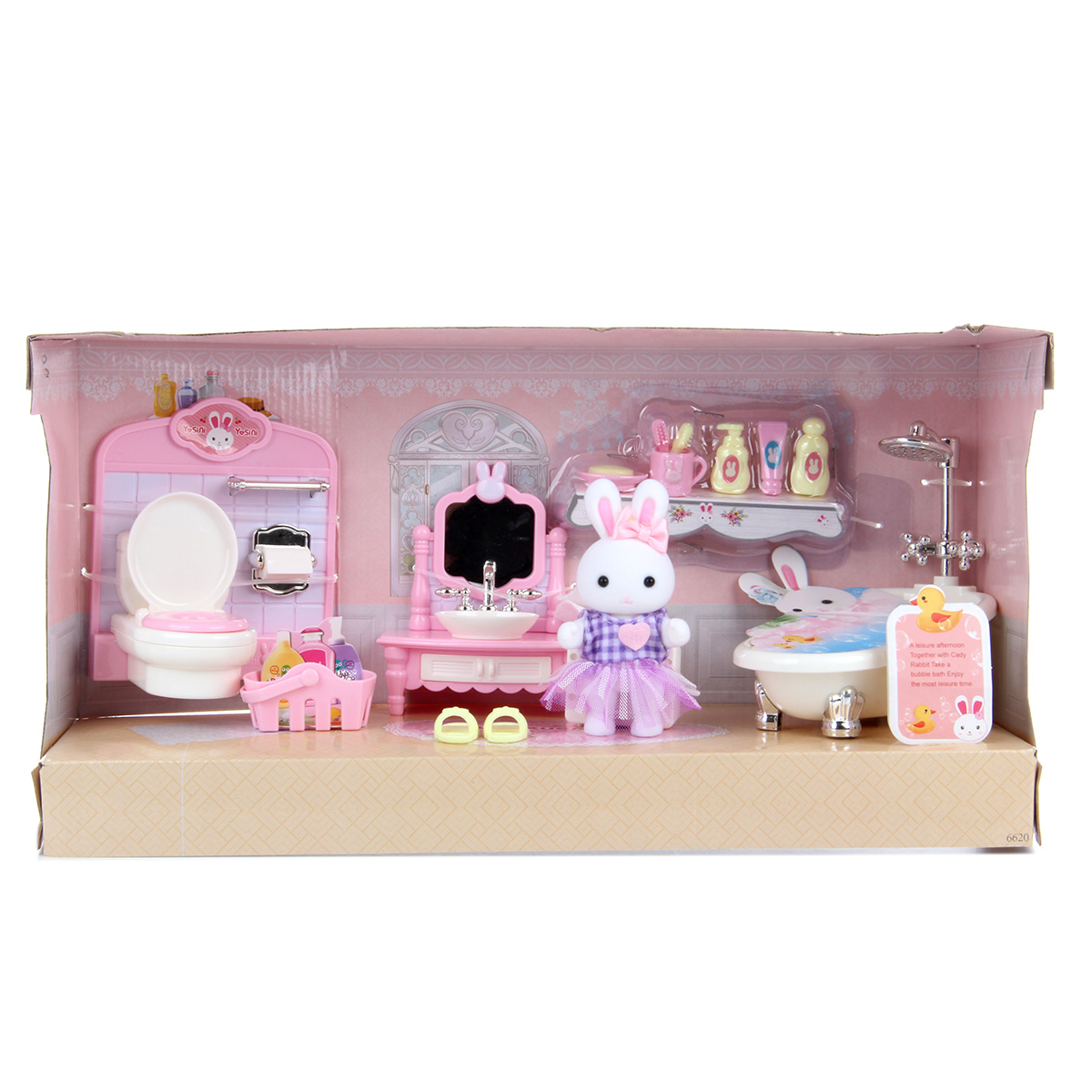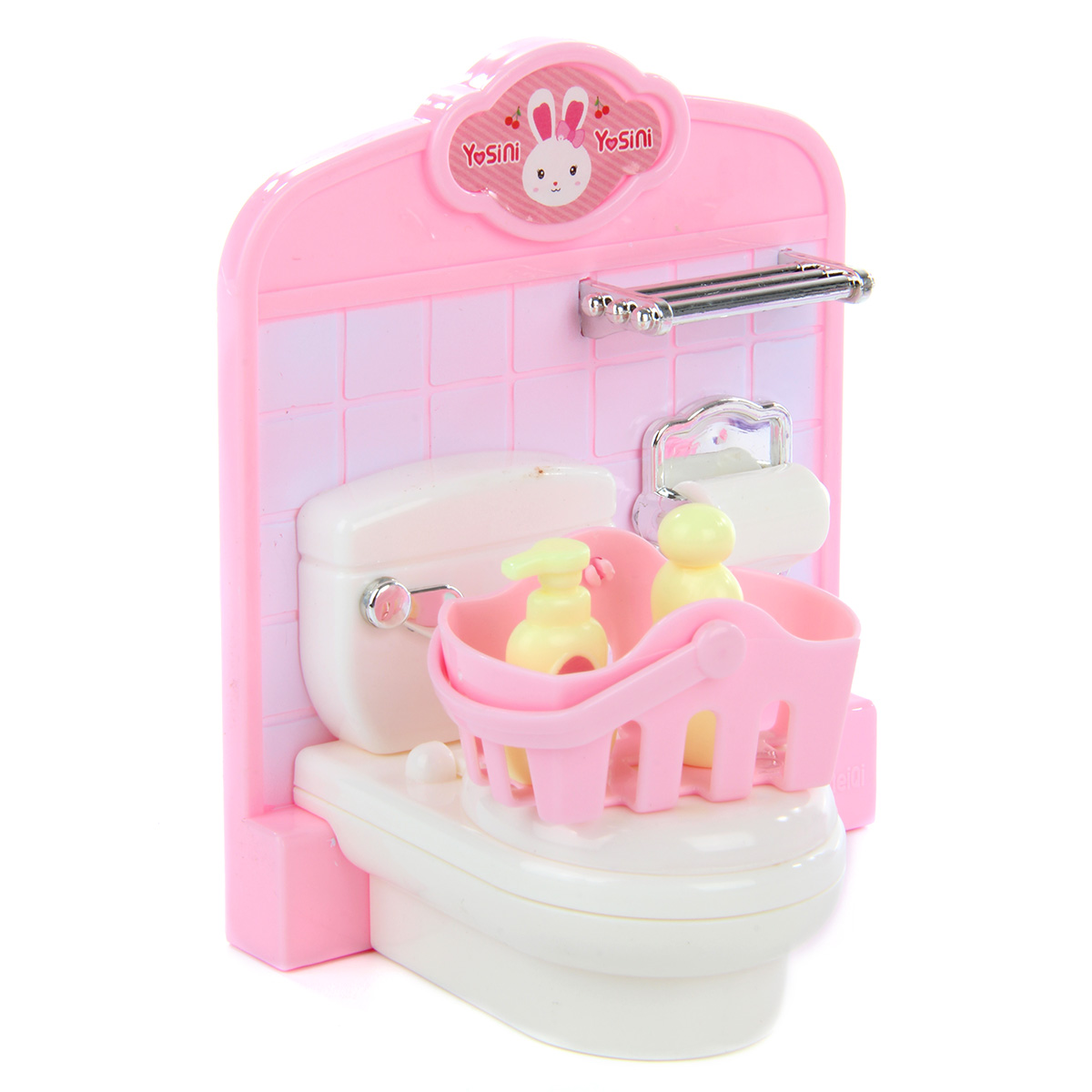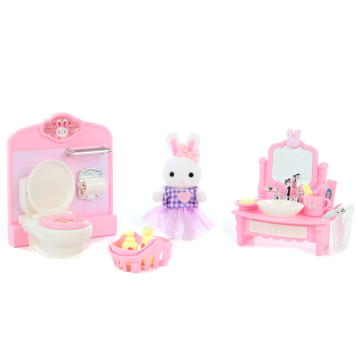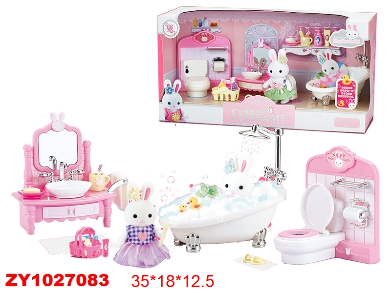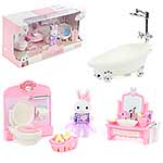 Кукла зайчик с набором мебели станет замечательным подарком для каждого ребенка. Большое количество предметов, компактные размеры. Разнообразит сюжетно-ролевые игры. В комплект входят игрушка зайчик, игрушка ванна, корзина, тапочки, унитаз со стенкой, умывальник, мыльные принадлежности, кружка, полотенце. Полотенце на умывальнике снимается. Крышка унитаза поднимается. Голова, руки и ноги у зайчика двигаются, одежда снимается. Игрушка изготовлена из качественной и безопасной пластмассы, есть текстиль. Размеры умывальника: 8*9 см. Размеры туалетной стенки: 9*10 см. Размеры корзинки: 3*2 см. Размеры мыльницы: 2*2 см. Размеры зайки: 5*9 см. Размеры коробки: 35*12*18 см.