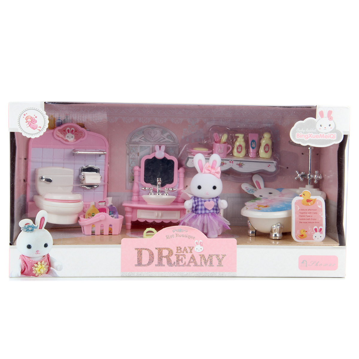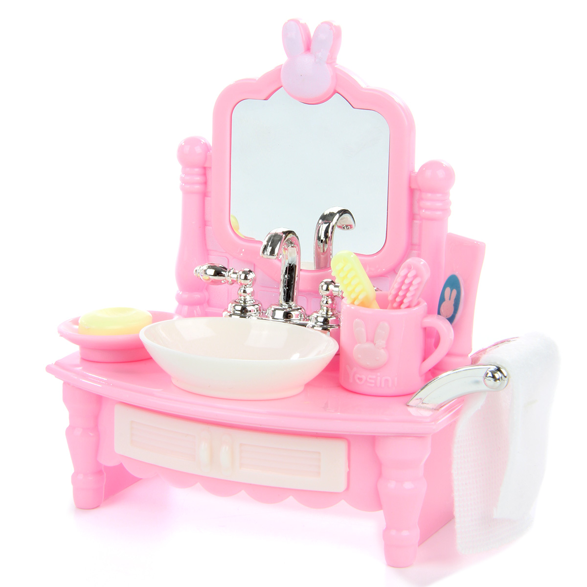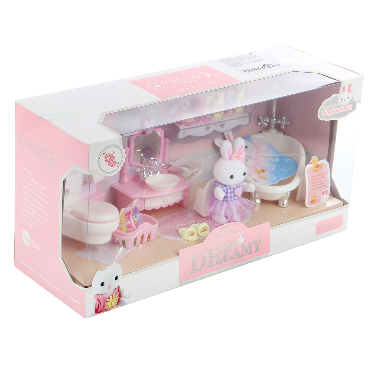 Кукла зайчик с набором мебели станет замечательным подарком для каждого ребенка. Большое количество предметов, компактные размеры. Разнообразит сюжетно-ролевые игры. В комплект входят игрушка зайчик, игрушка ванна, корзина, тапочки, унитаз со стенкой, умывальник, мыльные принадлежности, кружка, полотенце. Полотенце на умывальнике снимается. Крышка унитаза поднимается. Голова, руки и ноги у зайчика двигаются, одежда снимается. Игрушка изготовлена из качественной и безопасной пластмассы, есть текстиль. Размеры умывальника: 8*9 см. Размеры туалетной стенки: 9*10 см. Размеры корзинки: 3*2 см. Размеры мыльницы: 2*2 см. Размеры зайки: 5*9 см. Размеры коробки: 35*12*18 см.