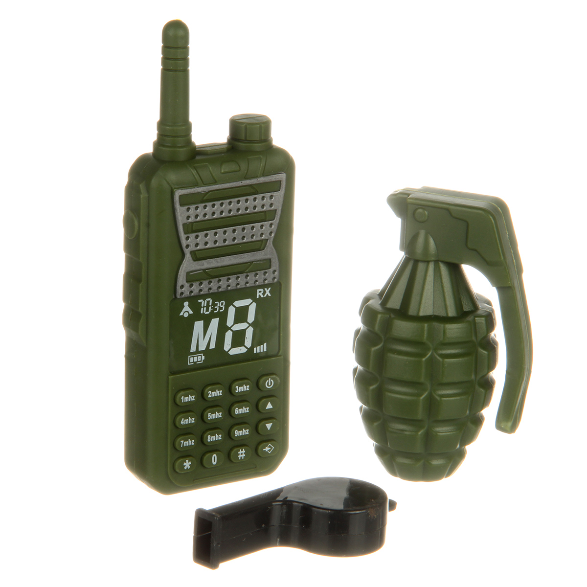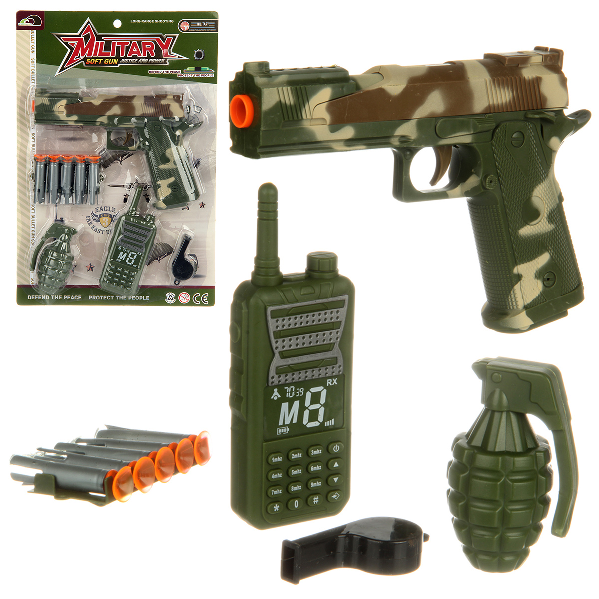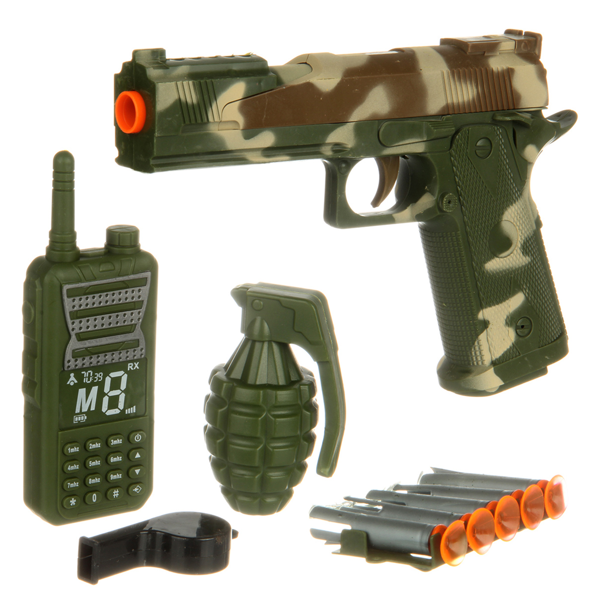 В комплекте игрушка пистолет, игрушечная рация, граната, магазин с 5 патронами, свисток.