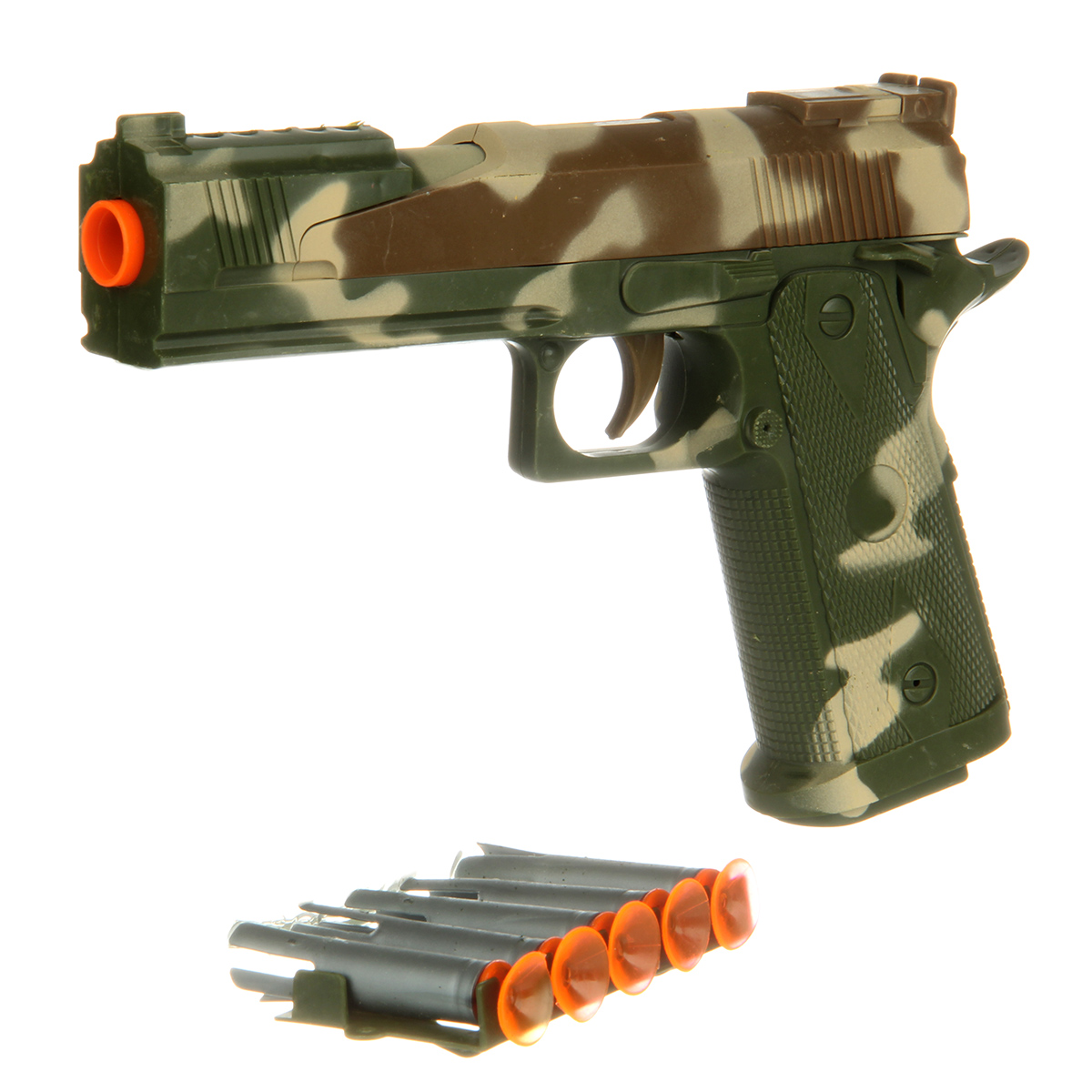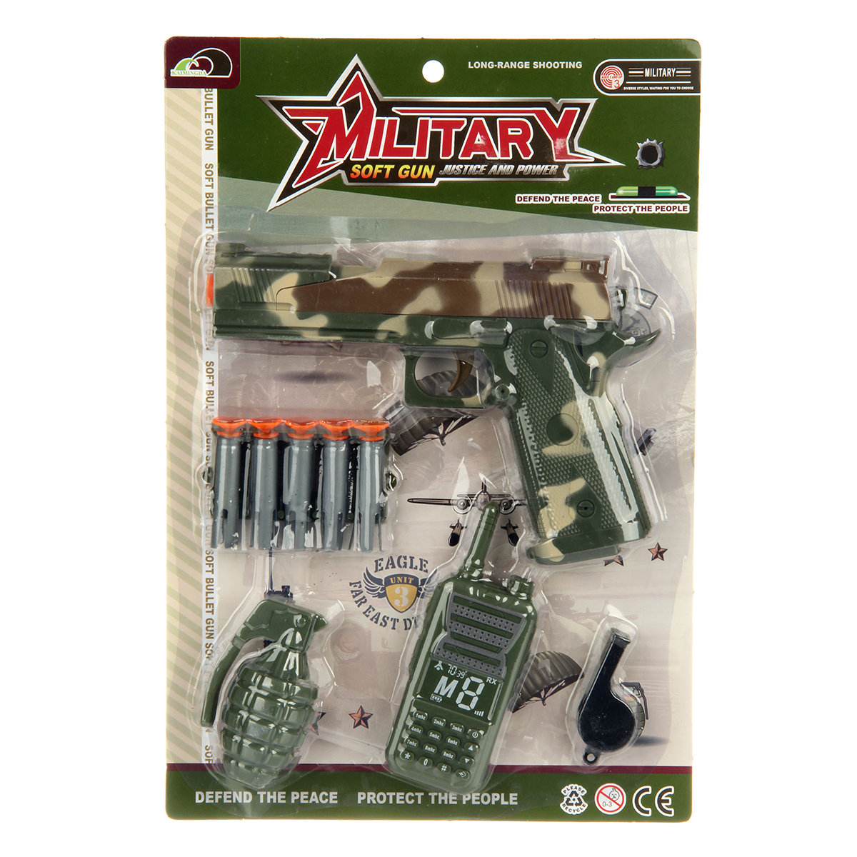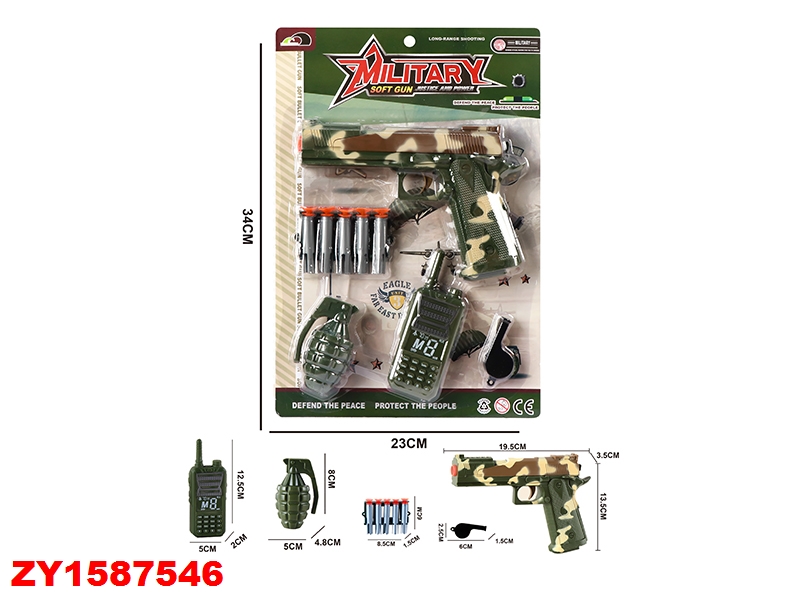 В комплекте игрушка пистолет, игрушечная рация, граната, магазин с 5 патронами, свисток.