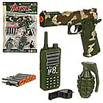Игрушечный пистолет, стреляющий патронами, магазин, который можно зацепить за ремень, рация с гранатой, с этим набором военного ребенок придумает массу увлекательных игр.