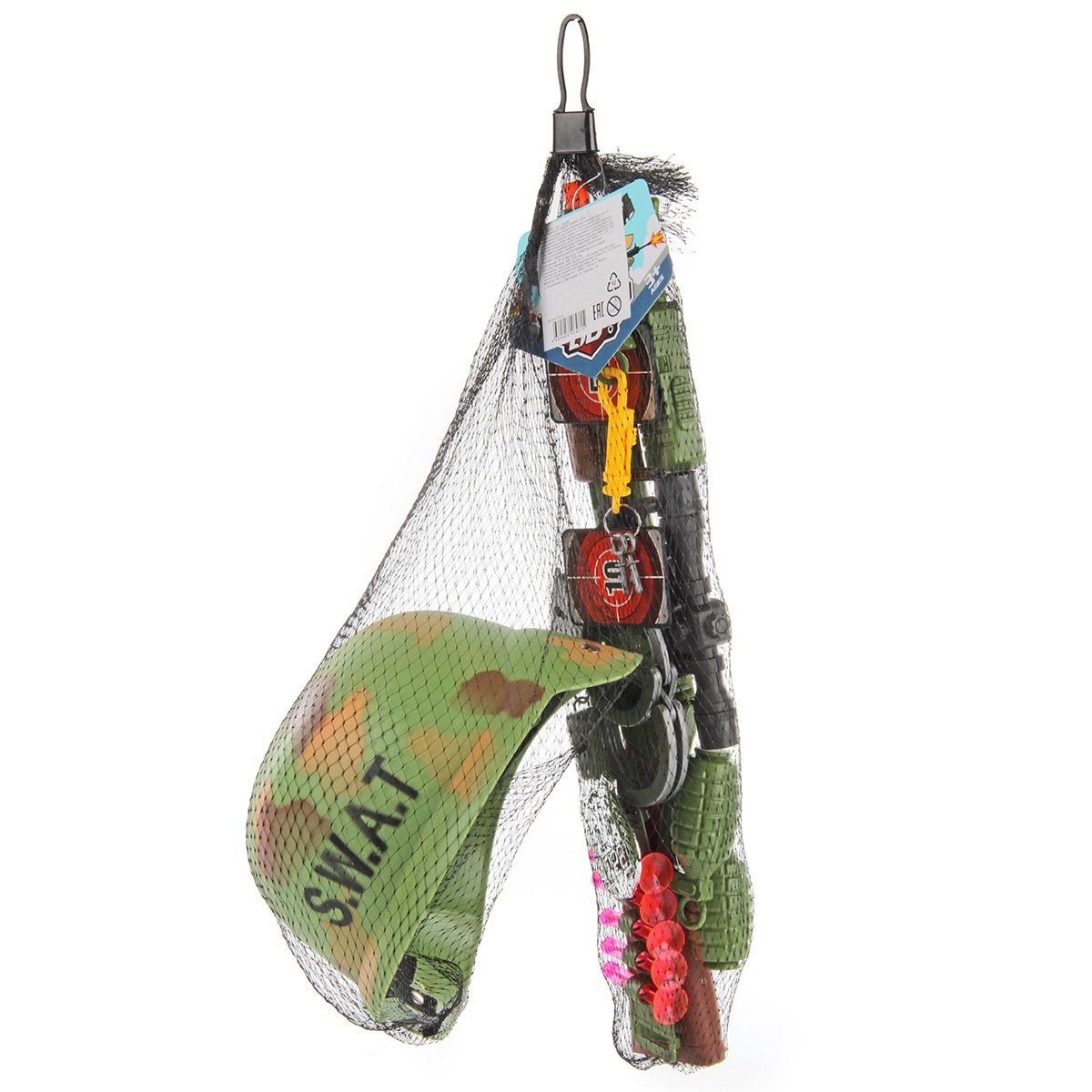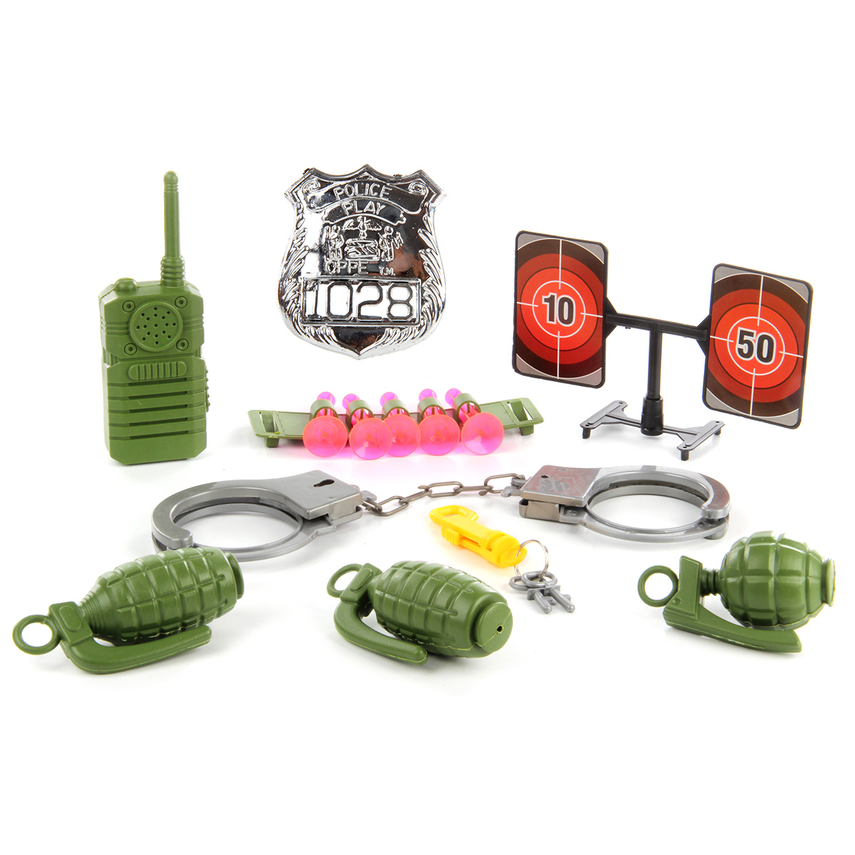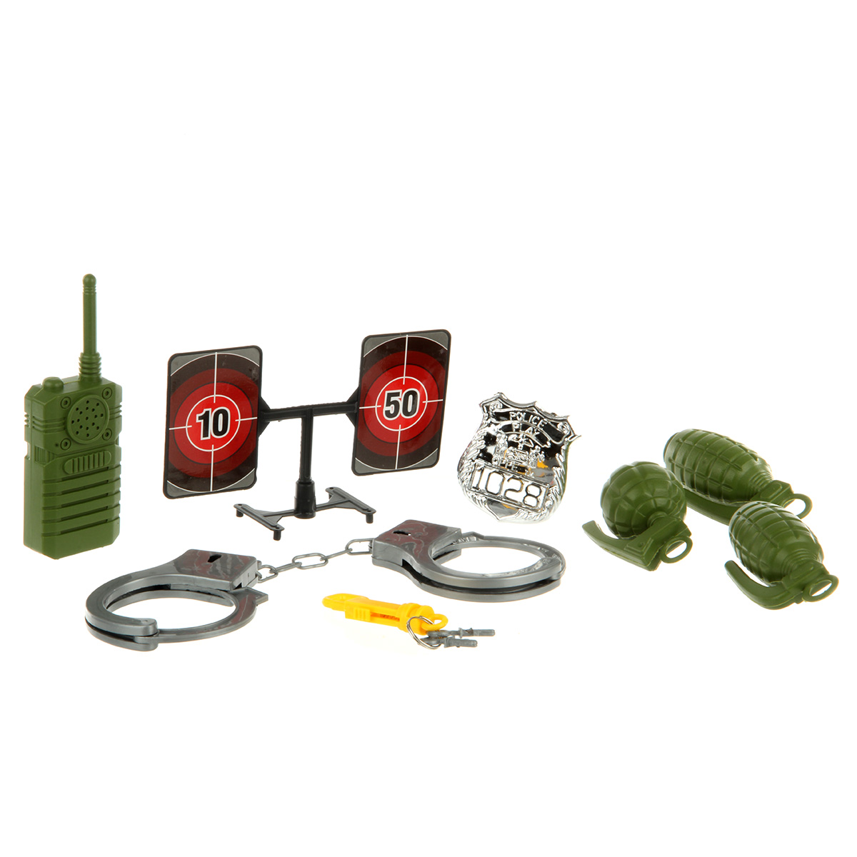 Замечательный набор для тематических игр. В комплект входят игрушечное ружье, муляж рации, мишень на подставке, наручники, ключи к наручникам на карабине, жетон, муляжи гранат, каска и обойма со снарядами с присосками. Наручники можно открыть с помощью ключиков, карабин открывается, у жетона есть зажим, можно прикрепить к одежде. Каска на ремешках, длина регулируется. Крышки с прицела снимаются. Механизм стрельбы из ружья: - загрузите снаряд в дуло оружия присоской от себя; - передерните ручку под стволом; - прицельтесь и нажмите на спусковой крючок. Игрушка отлично развивает мелкую моторику рук, координацию движений, воображение, концентрацию внимания и глазомер. Игрушка изготовлена из качественного и безопасного полимерного материала, упакована в сетку. Размеры каски: 22*21*14 см. Внутренний диаметр каски: 19 см. Размеры ружья: 45*3*13 см. Размеры наручников: 28*1,5*7 см. Размеры рации: 5*2,5*13 см. Размеры жетона: 6*1*6,5 см. Длина снаряда: 6 см. Размеры игрушки в упаковке: 45*20*18 см.