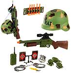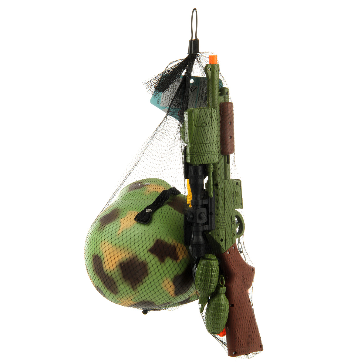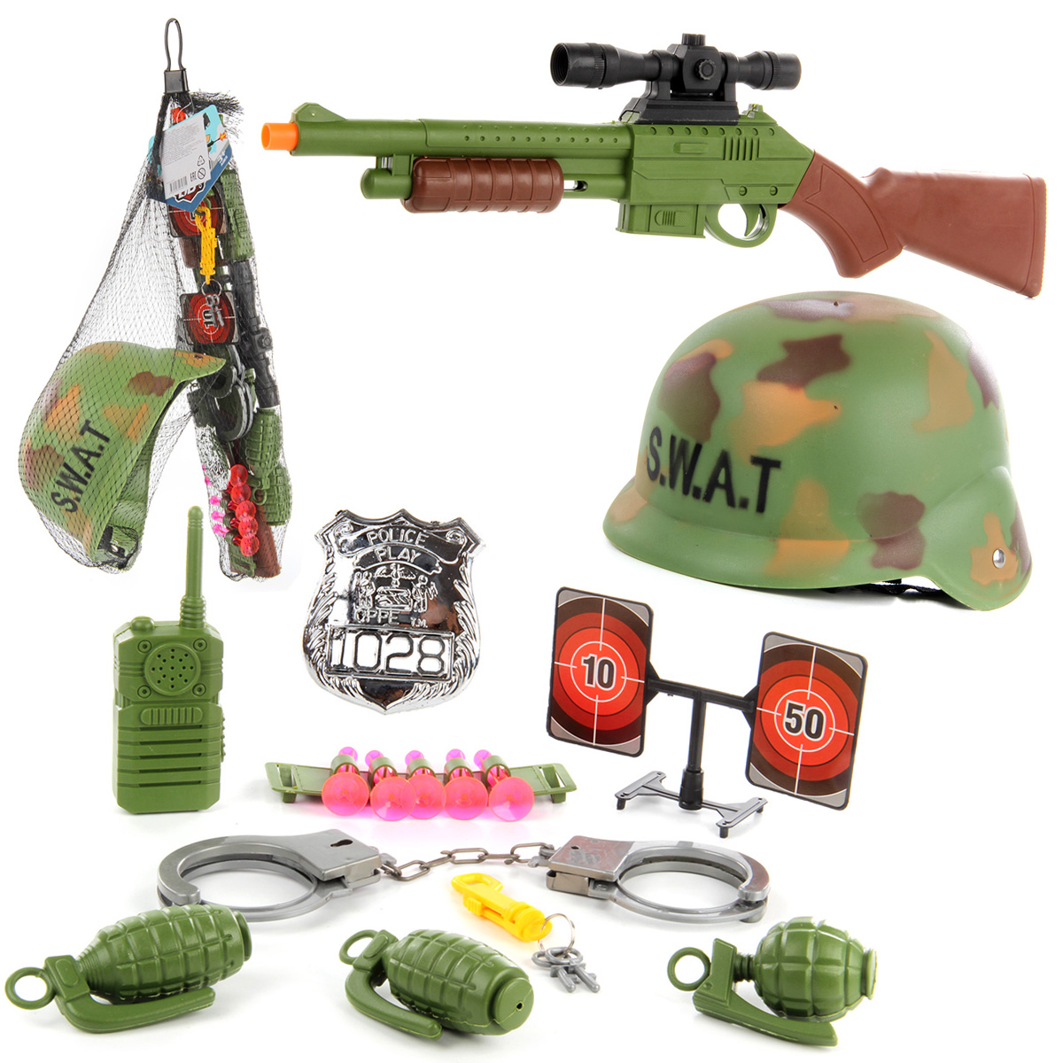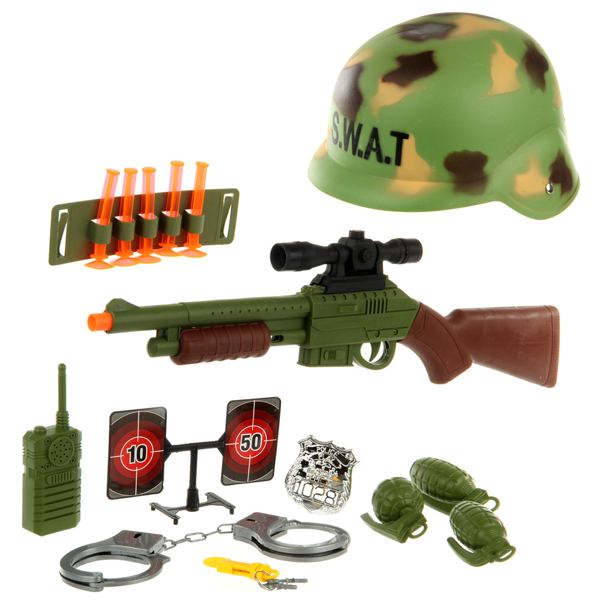 Замечательный набор для тематических игр. В комплект входят игрушечное ружье, муляж рации, мишень на подставке, наручники, ключи к наручникам на карабине, жетон, муляжи гранат, каска и обойма со снарядами с присосками. Наручники можно открыть с помощью ключиков, карабин открывается, у жетона есть зажим, можно прикрепить к одежде. Каска на ремешках, длина регулируется. Крышки с прицела снимаются. Механизм стрельбы из ружья: - загрузите снаряд в дуло оружия присоской от себя; - передерните ручку под стволом; - прицельтесь и нажмите на спусковой крючок. Игрушка отлично развивает мелкую моторику рук, координацию движений, воображение, концентрацию внимания и глазомер. Игрушка изготовлена из качественного и безопасного полимерного материала, упакована в сетку. Размеры каски: 22*21*14 см. Внутренний диаметр каски: 19 см. Размеры ружья: 45*3*13 см. Размеры наручников: 28*1,5*7 см. Размеры рации: 5*2,5*13 см. Размеры жетона: 6*1*6,5 см. Длина снаряда: 6 см. Размеры игрушки в упаковке: 45*20*18 см.