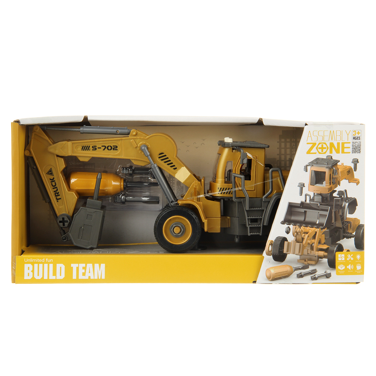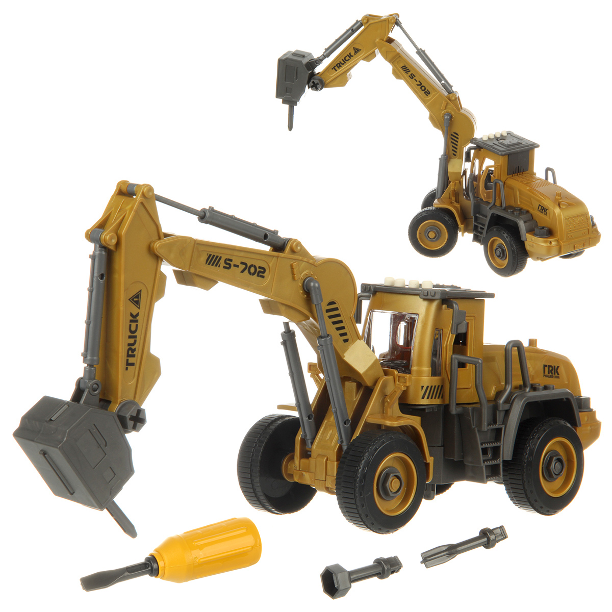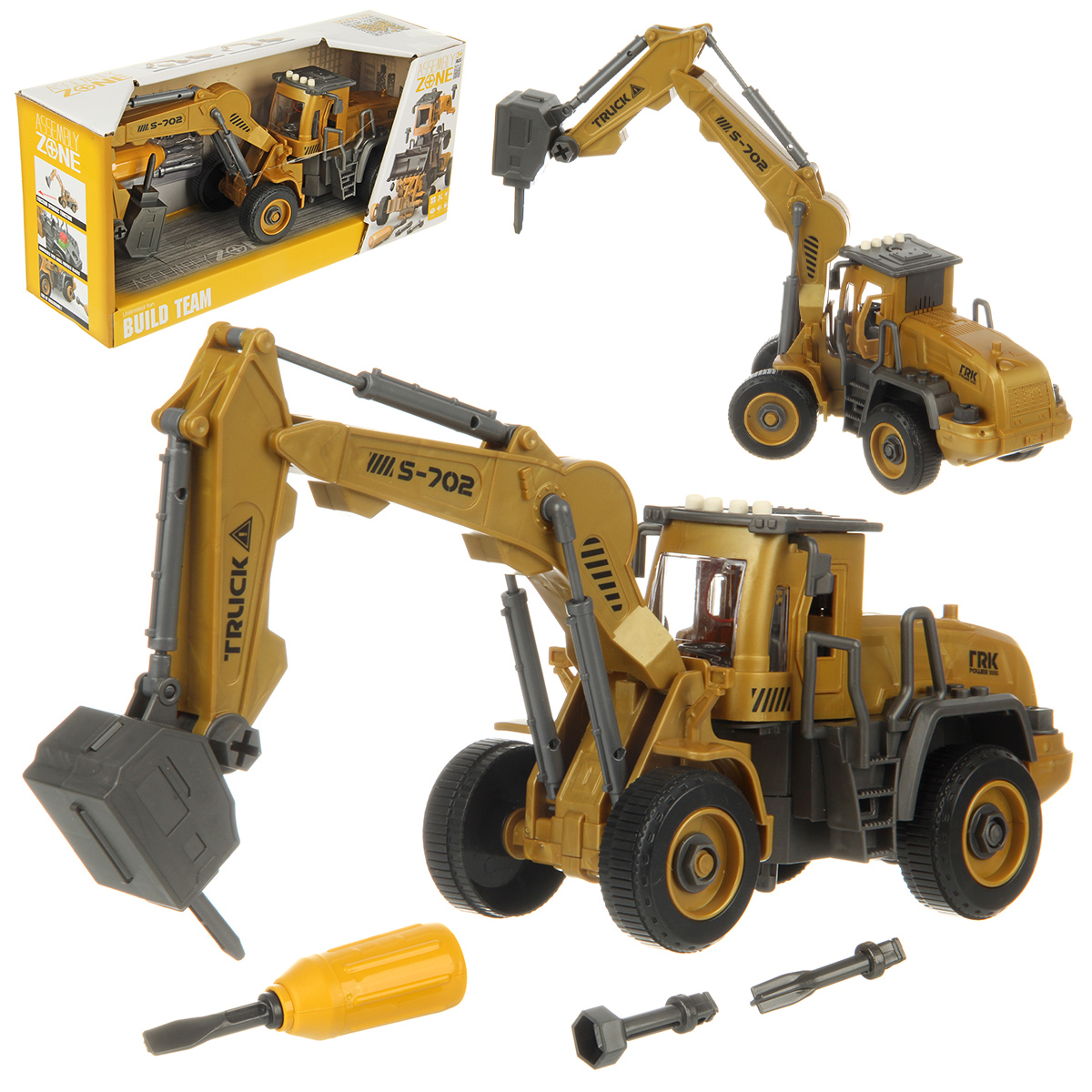 В наборе экскаватор, отвертка с 3 насадками.