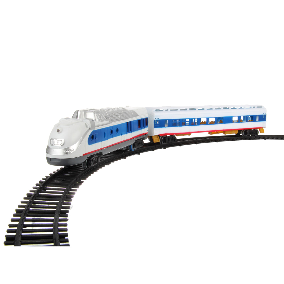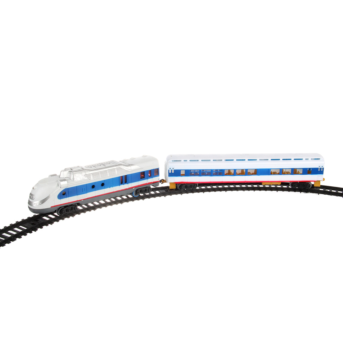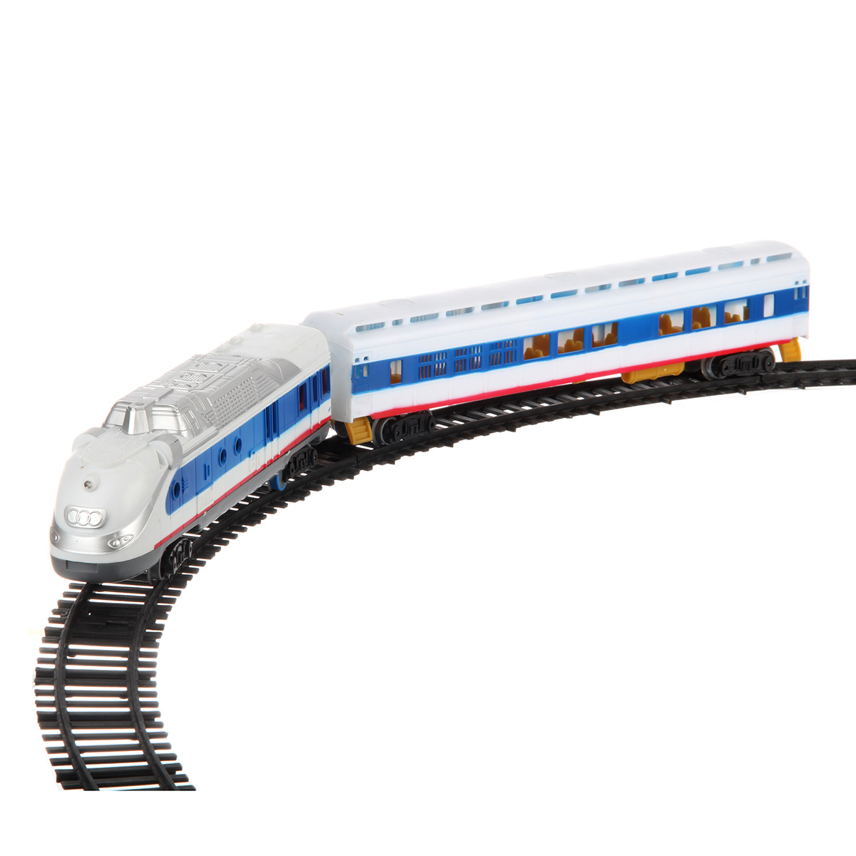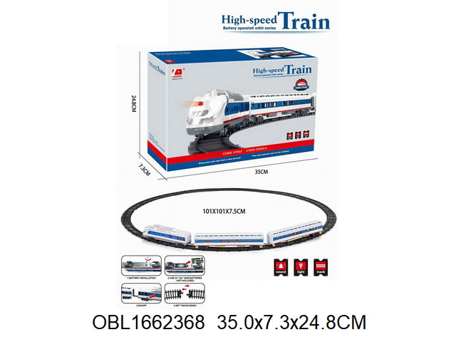 Игрушечная железная дорога с локомотивом со светом и звуком. Игрушка поезд в современном дизайне, игрушечный локомотив с эффектной подсветкой, звуками гудка и стука колес, движением вперед. Вагон и локомотив соединяются между собой, рельсы легко собираются, большой диаметр собранной железной дороги, конструктор удобно хранить в компактной коробке.