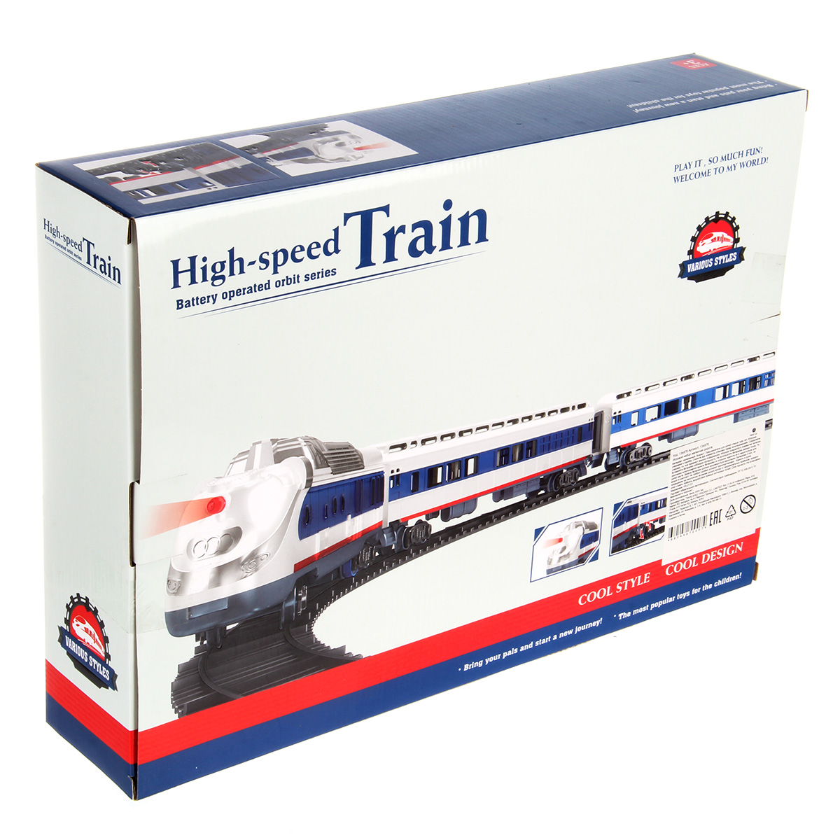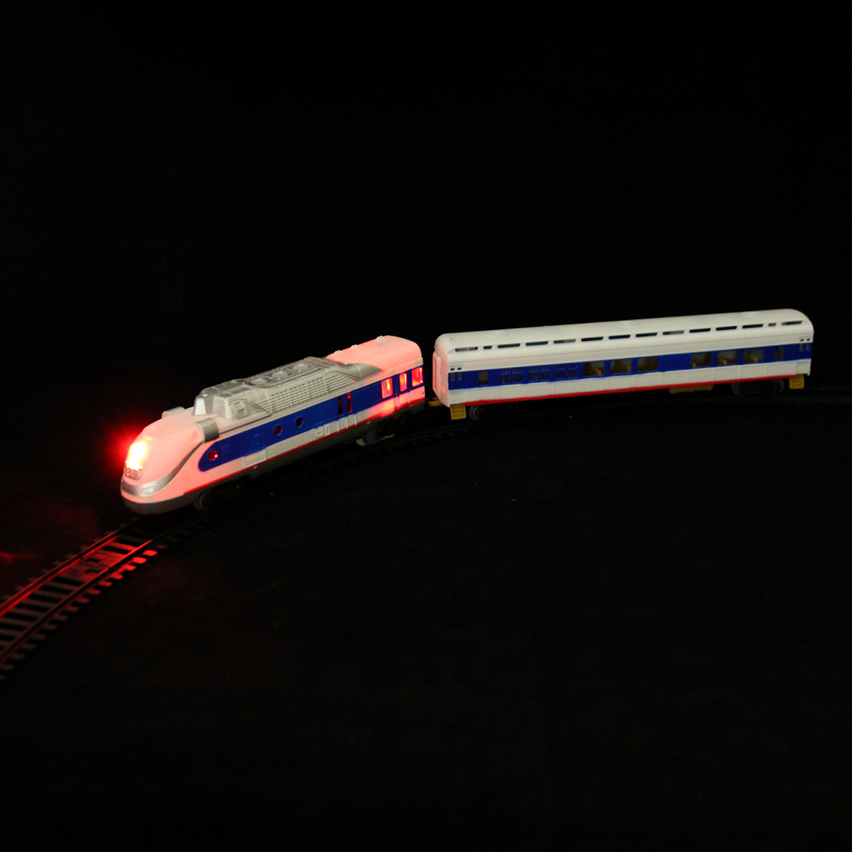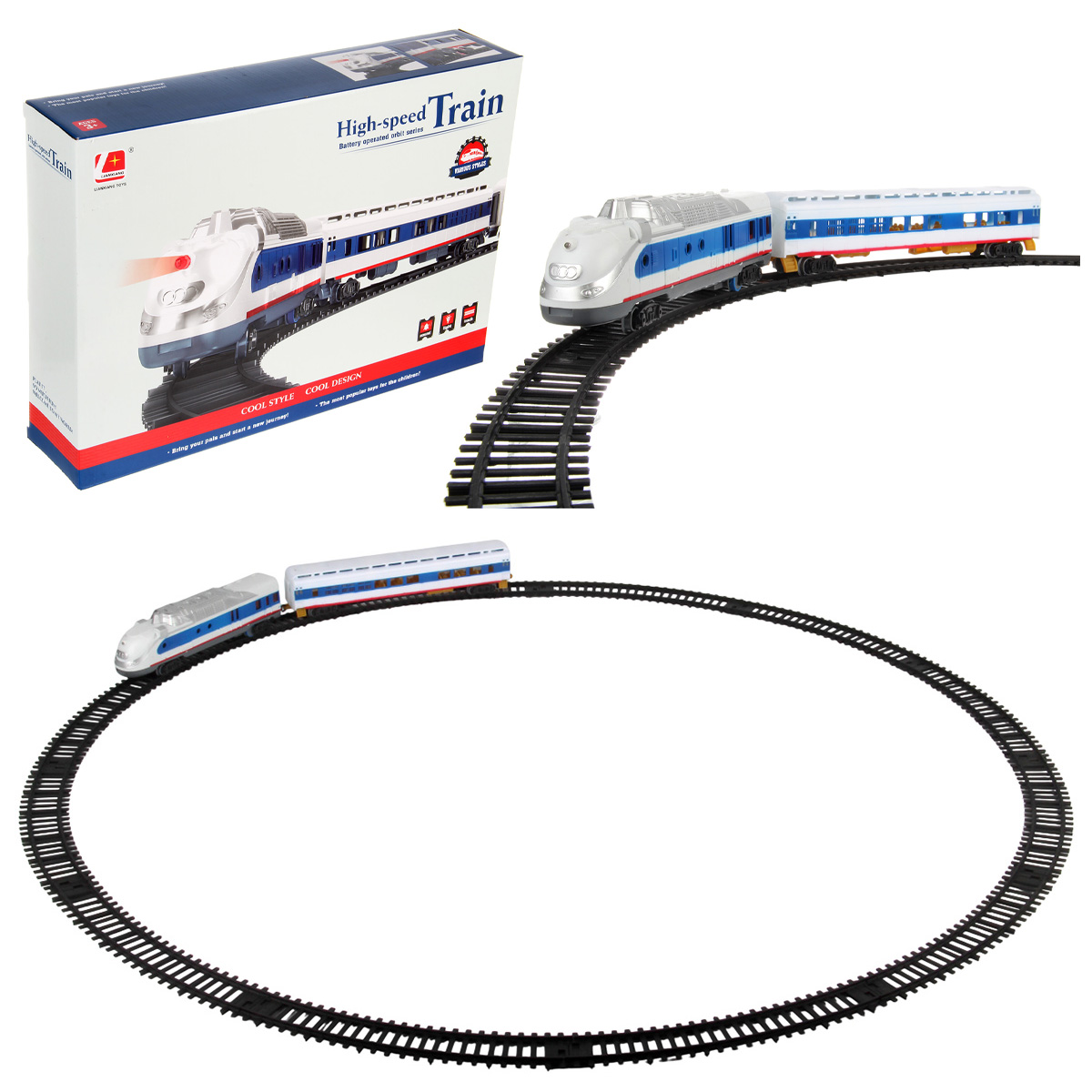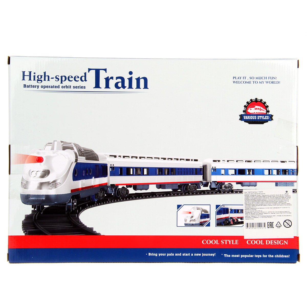 Игрушечная железная дорога с локомотивом со светом и звуком. Игрушка поезд в современном дизайне, игрушечный локомотив с эффектной подсветкой, звуками гудка и стука колес, движением вперед. Вагон и локомотив соединяются между собой, рельсы легко собираются, большой диаметр собранной железной дороги, конструктор удобно хранить в компактной коробке.
