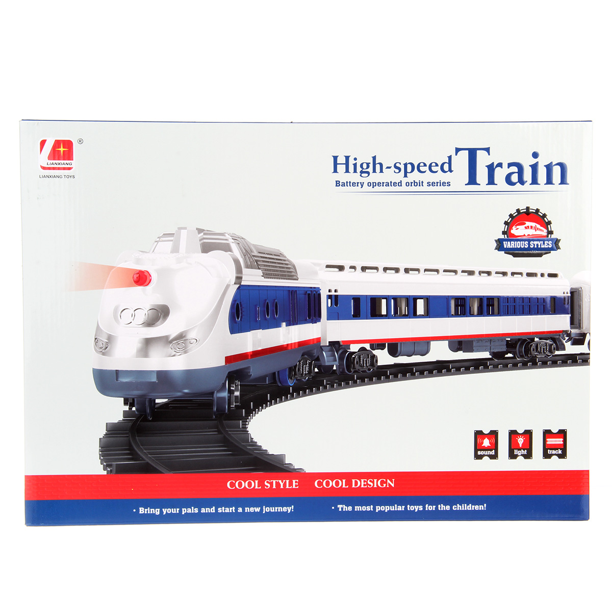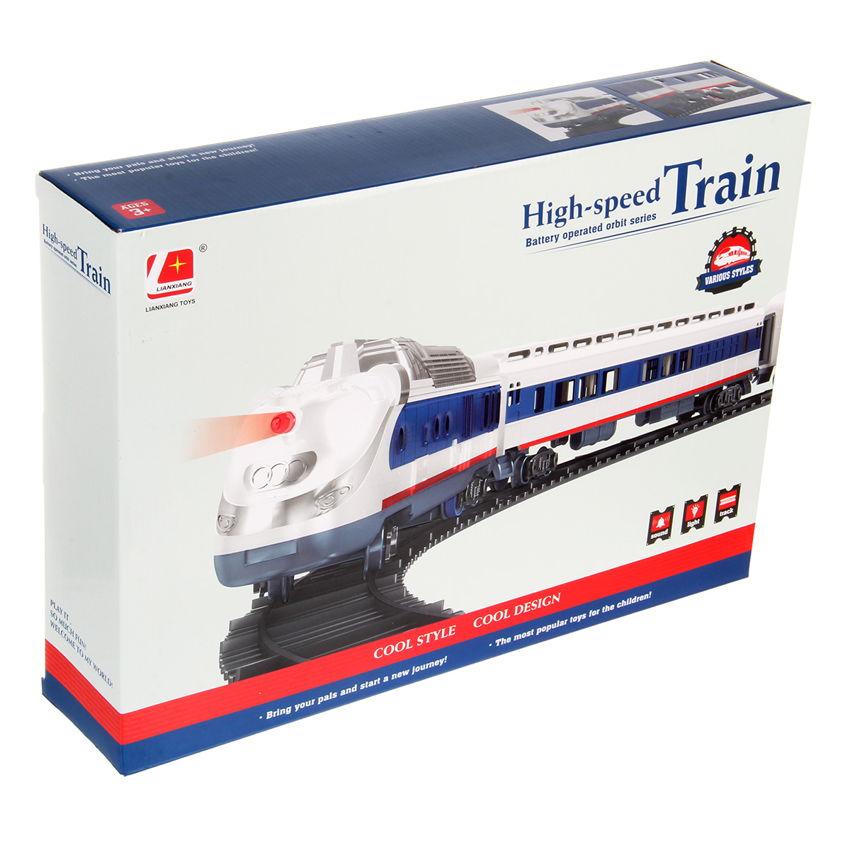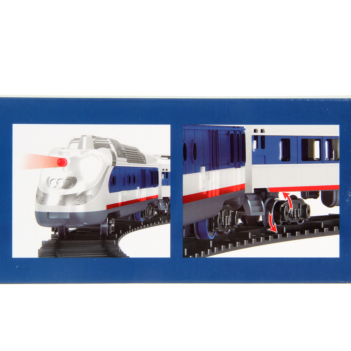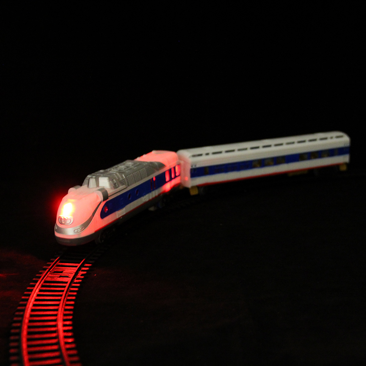 Игрушечная железная дорога с локомотивом со светом и звуком. Игрушка поезд в современном дизайне, игрушечный локомотив с эффектной подсветкой, звуками гудка и стука колес, движением вперед. Вагон и локомотив соединяются между собой, рельсы легко собираются, большой диаметр собранной железной дороги, конструктор удобно хранить в компактной коробке.
