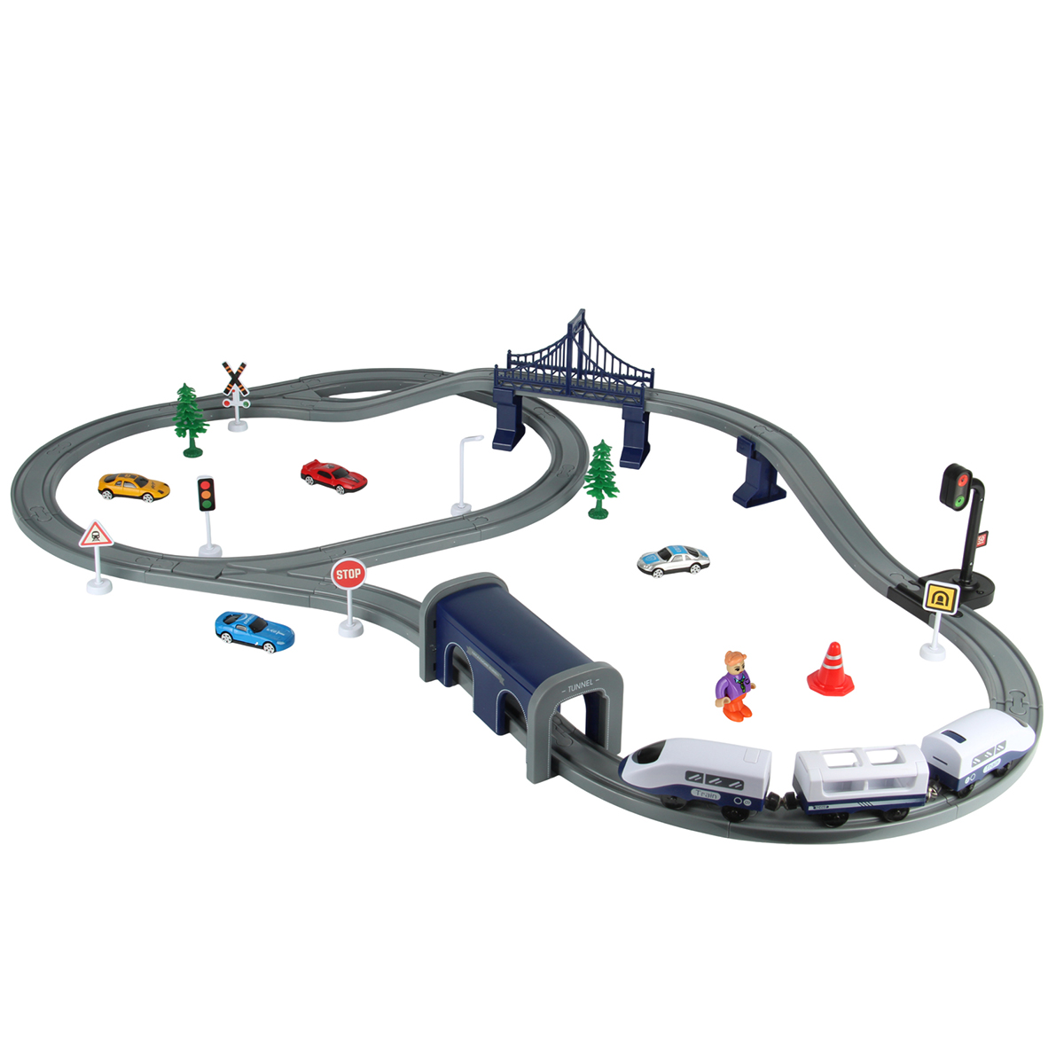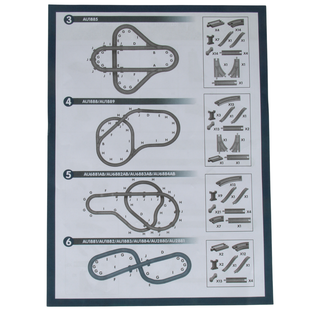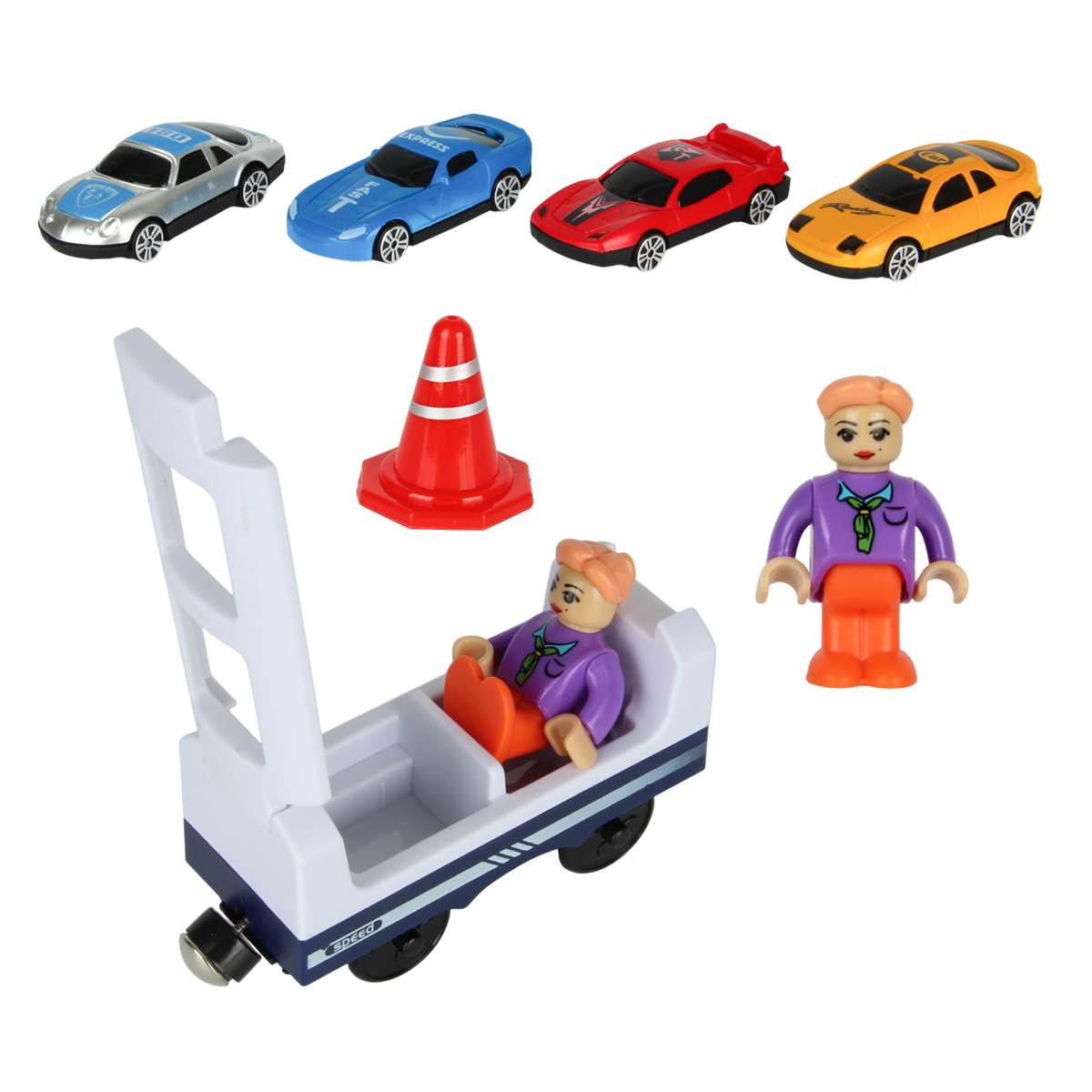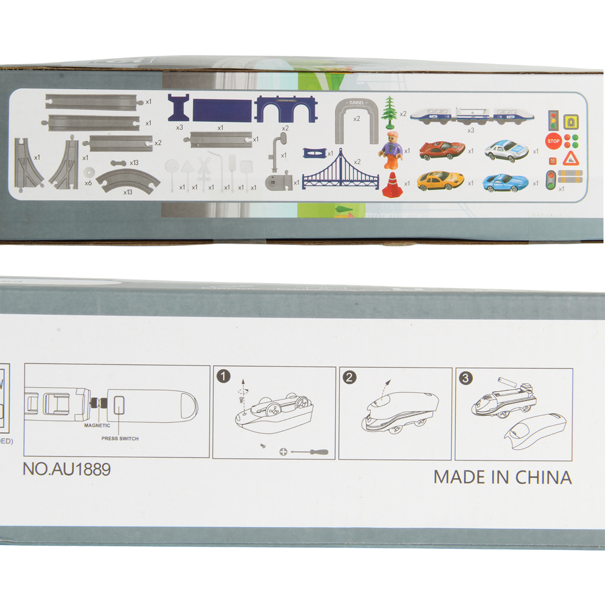 Детали для сборки железной дороги, 2 локомотива, 1 вагон, 4 машинки, пассажир, 2 дерева, конус, 6 дорожных знаков, набор наклеек, инструкция на английском языке.