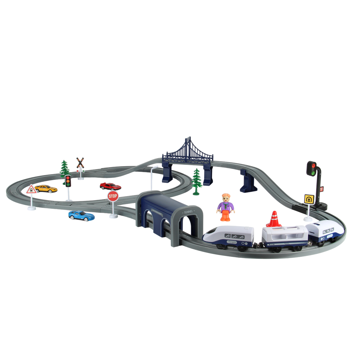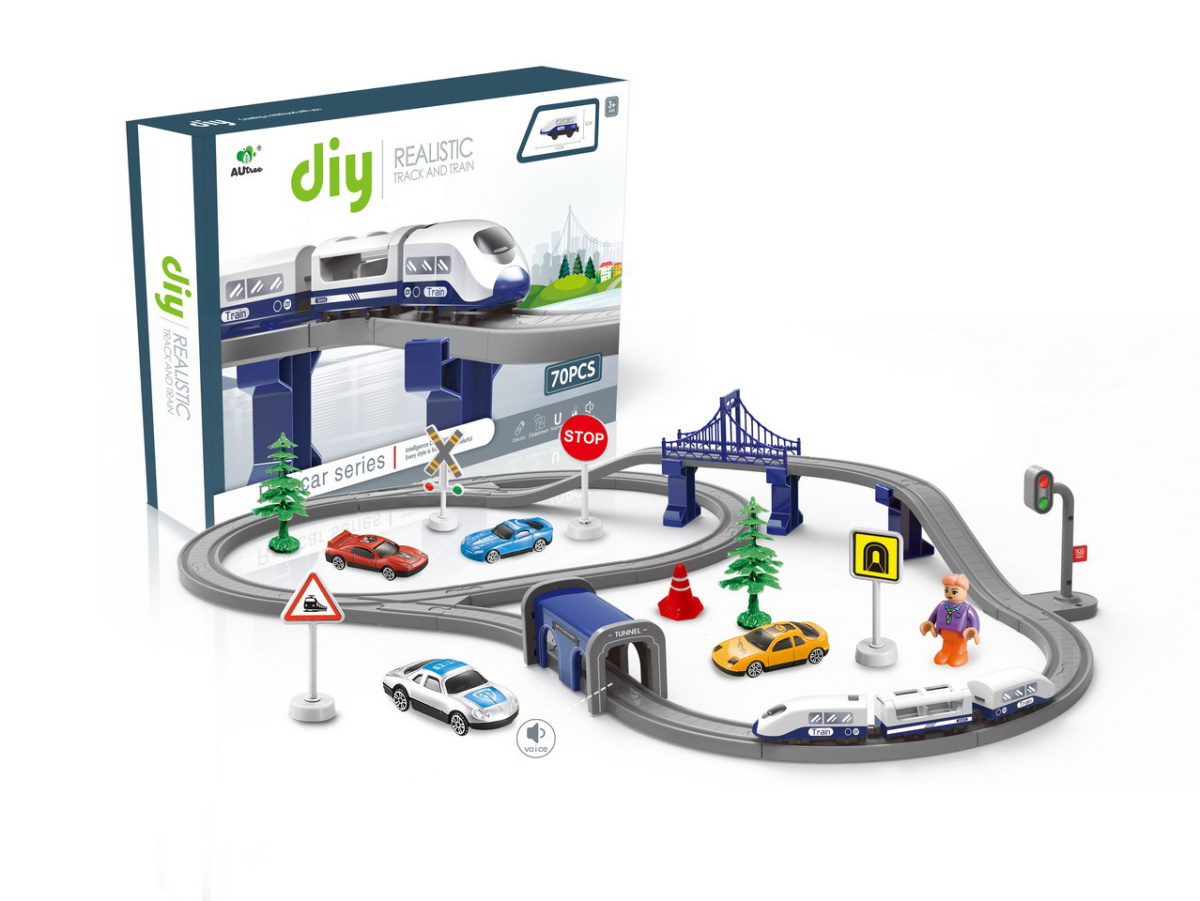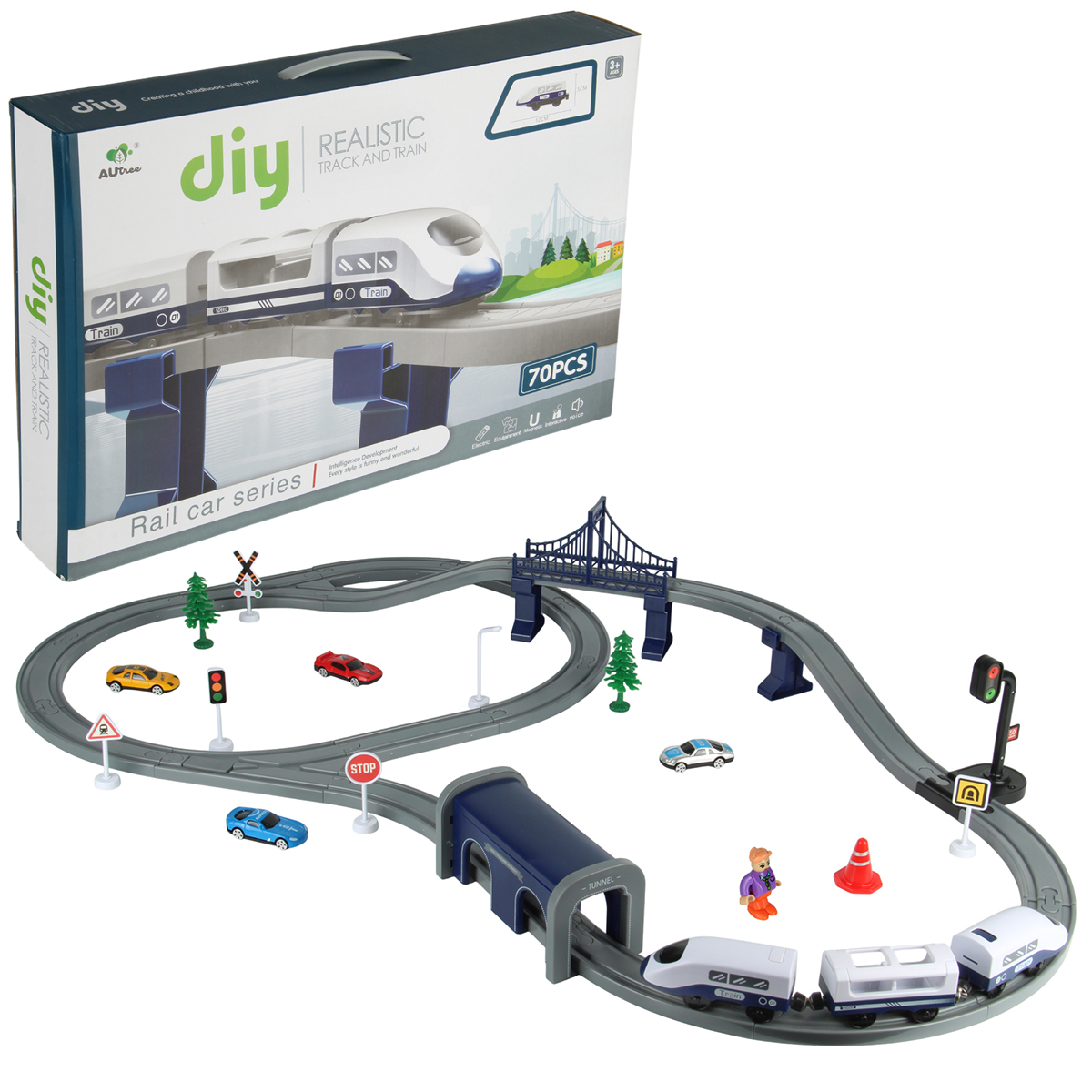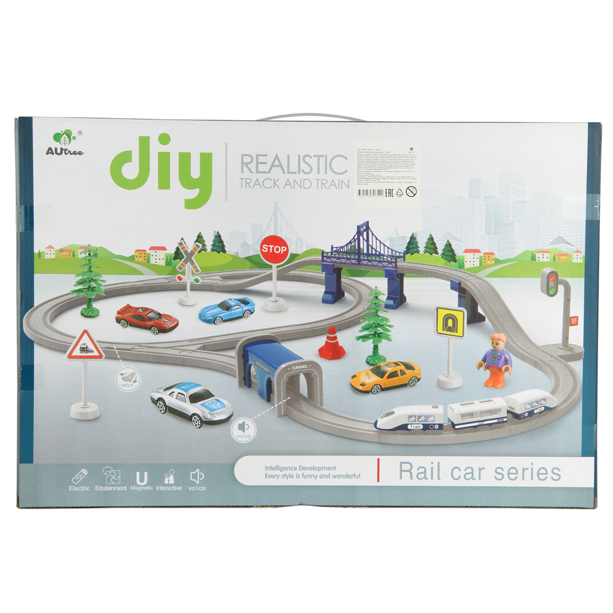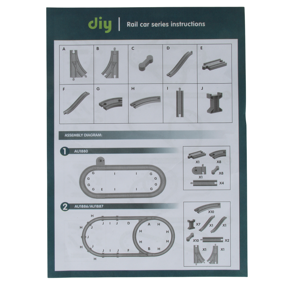 Детали для сборки железной дороги, 2 локомотива, 1 вагон, 4 машинки, пассажир, 2 дерева, конус, 6 дорожных знаков, набор наклеек, инструкция на английском языке.