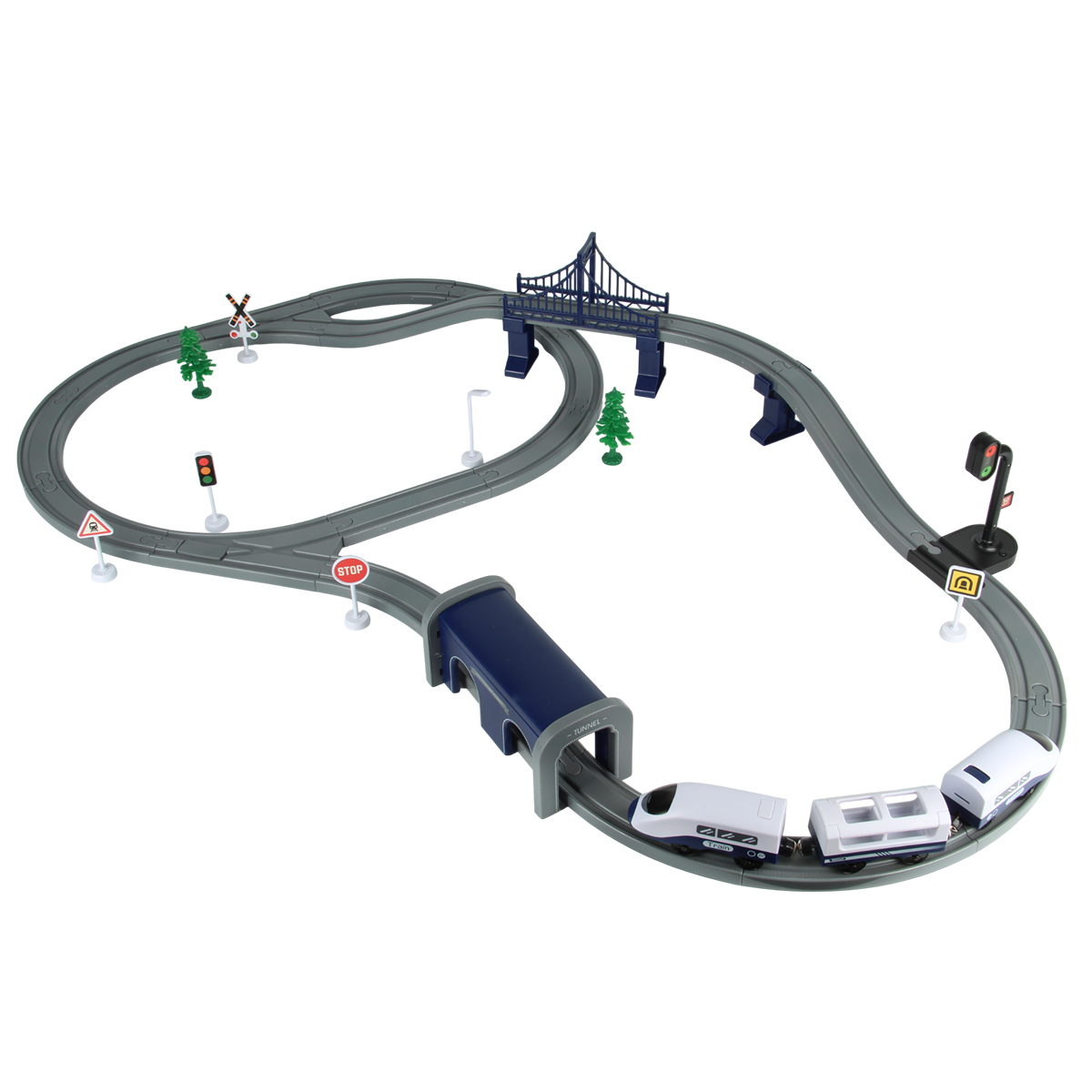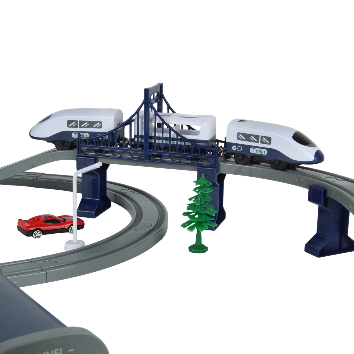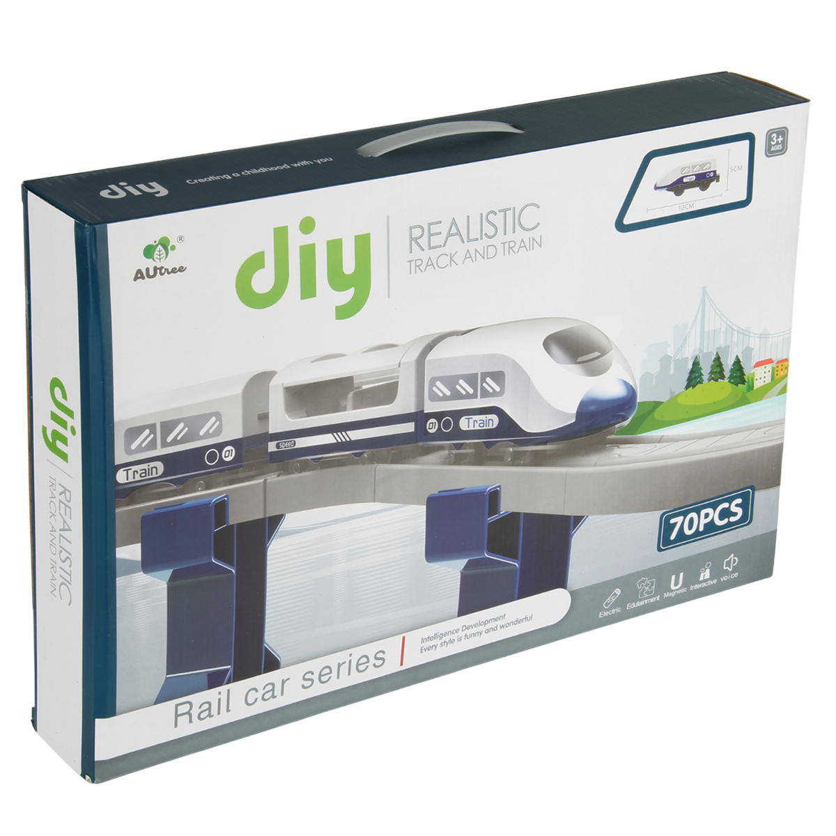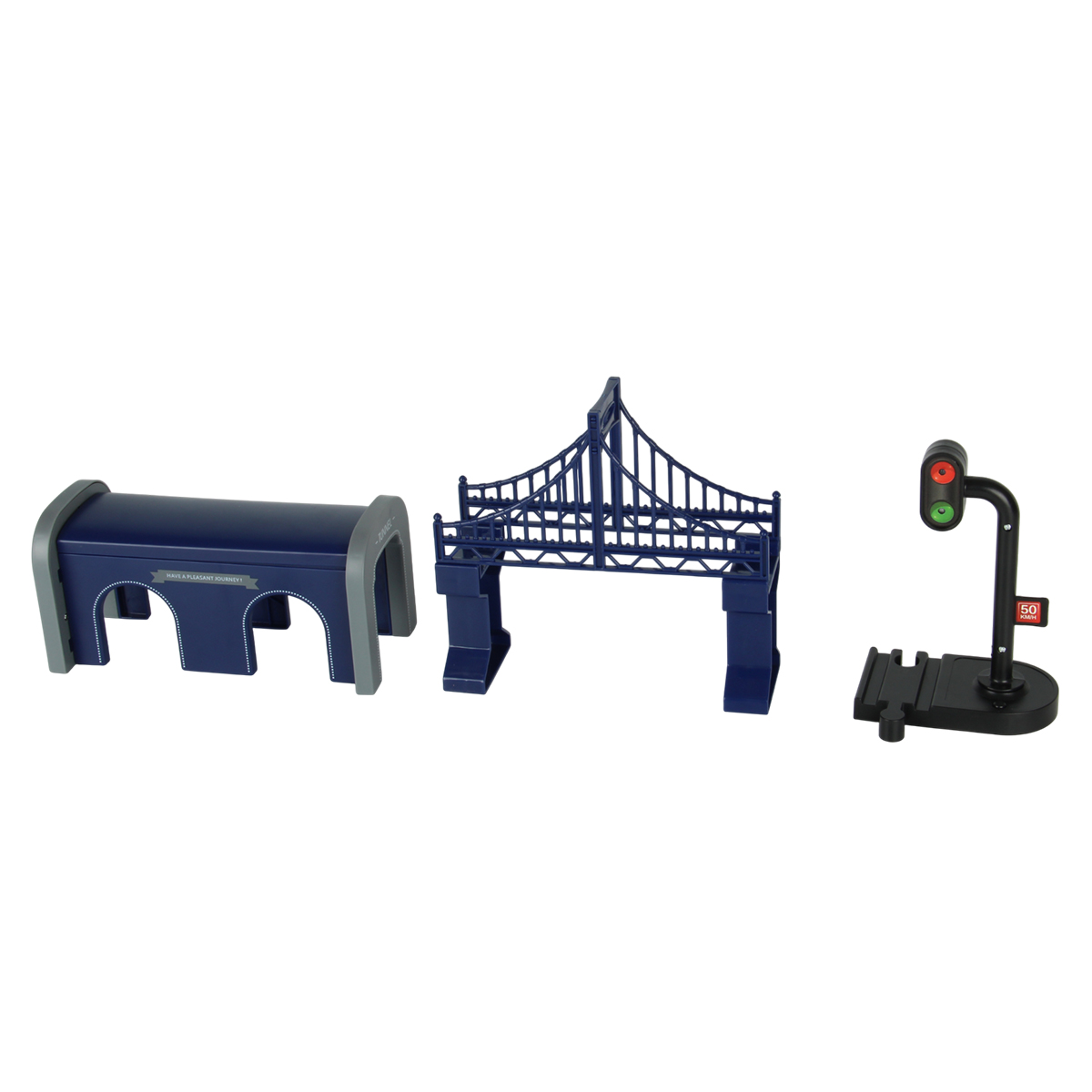 Детали для сборки железной дороги, 2 локомотива, 1 вагон, 4 машинки, пассажир, 2 дерева, конус, 6 дорожных знаков, набор наклеек, инструкция на английском языке.