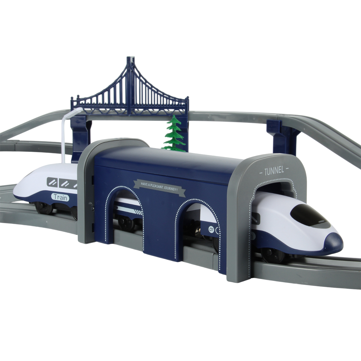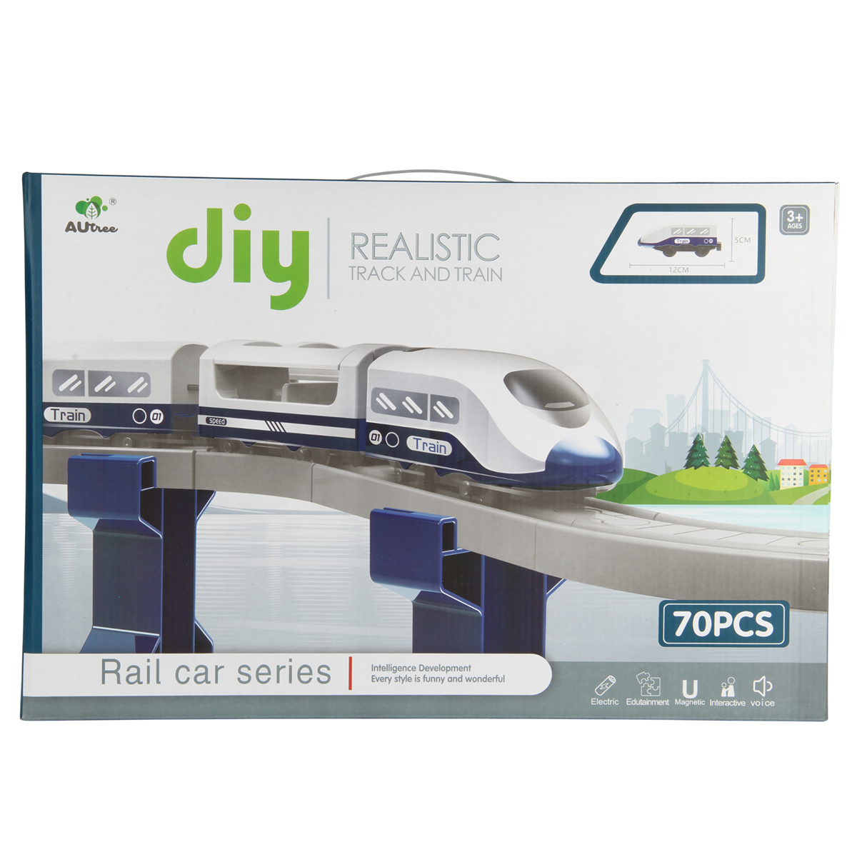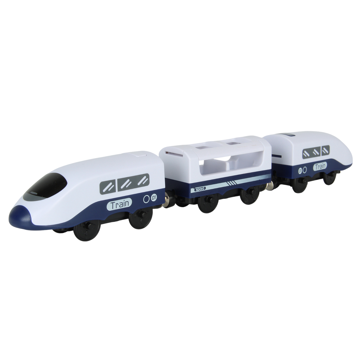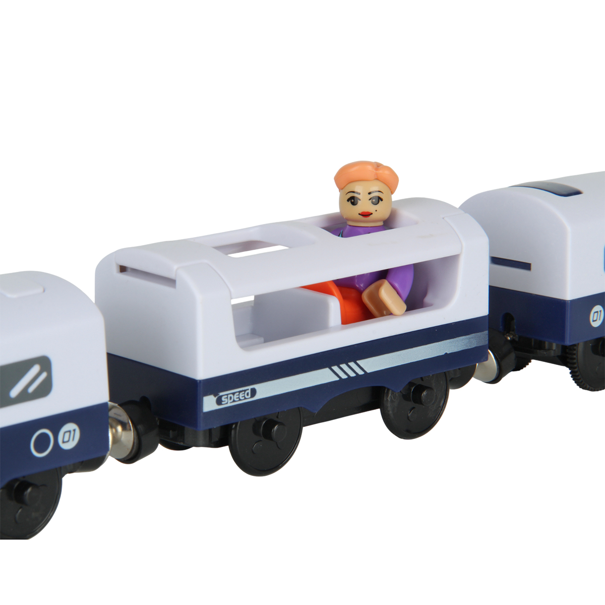 1. Один из локомотивов на батарейках, едет вперёд, локомотивы и вагоны соединяются магнитной сцепкой. У вагона поднимается крыша, можно поместить туда фигурку пассажира.