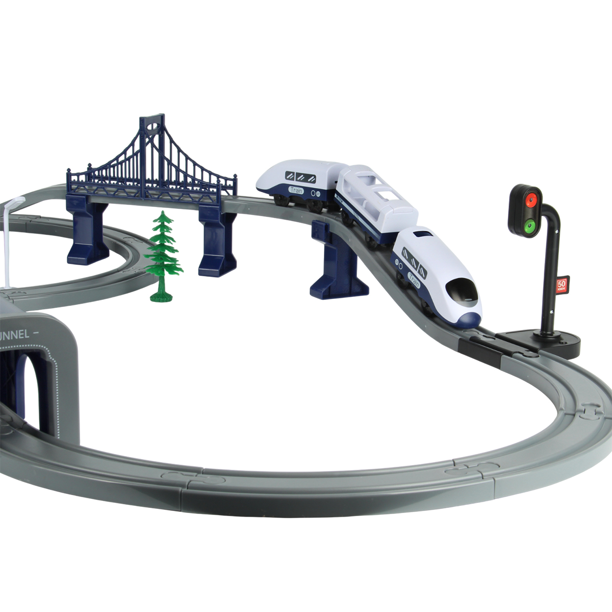 Игрушечная железная дорога со множеством аксессуаров, световыми и звуковыми эффектами. Подвижные элементы, звуки железнодорожного переезда, стука колес и гудка, меняющийся сигнал светофора. Локомотив с движением вперёд, магнитная сцепка вагонов, миниатюрные машинки в комплекте, катаются вперёд и назад, фигурка пассажира с подвижными руками и ногами. Игрушка изготовлена из прочных и безопасных материалов в качественном исполнении с вниманием к деталям.