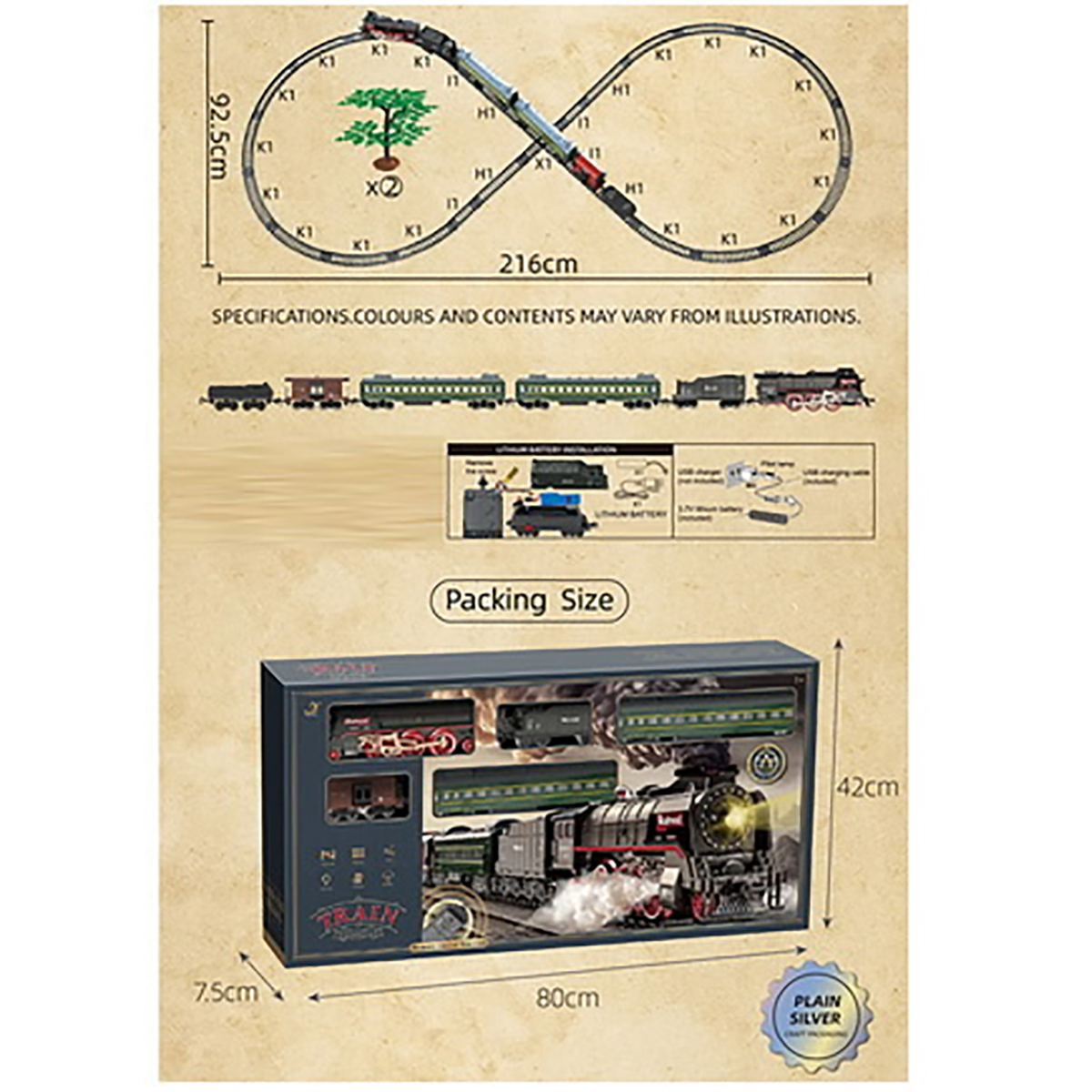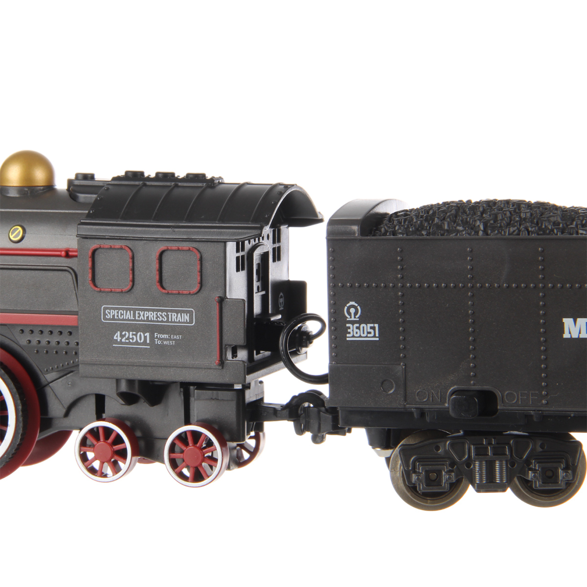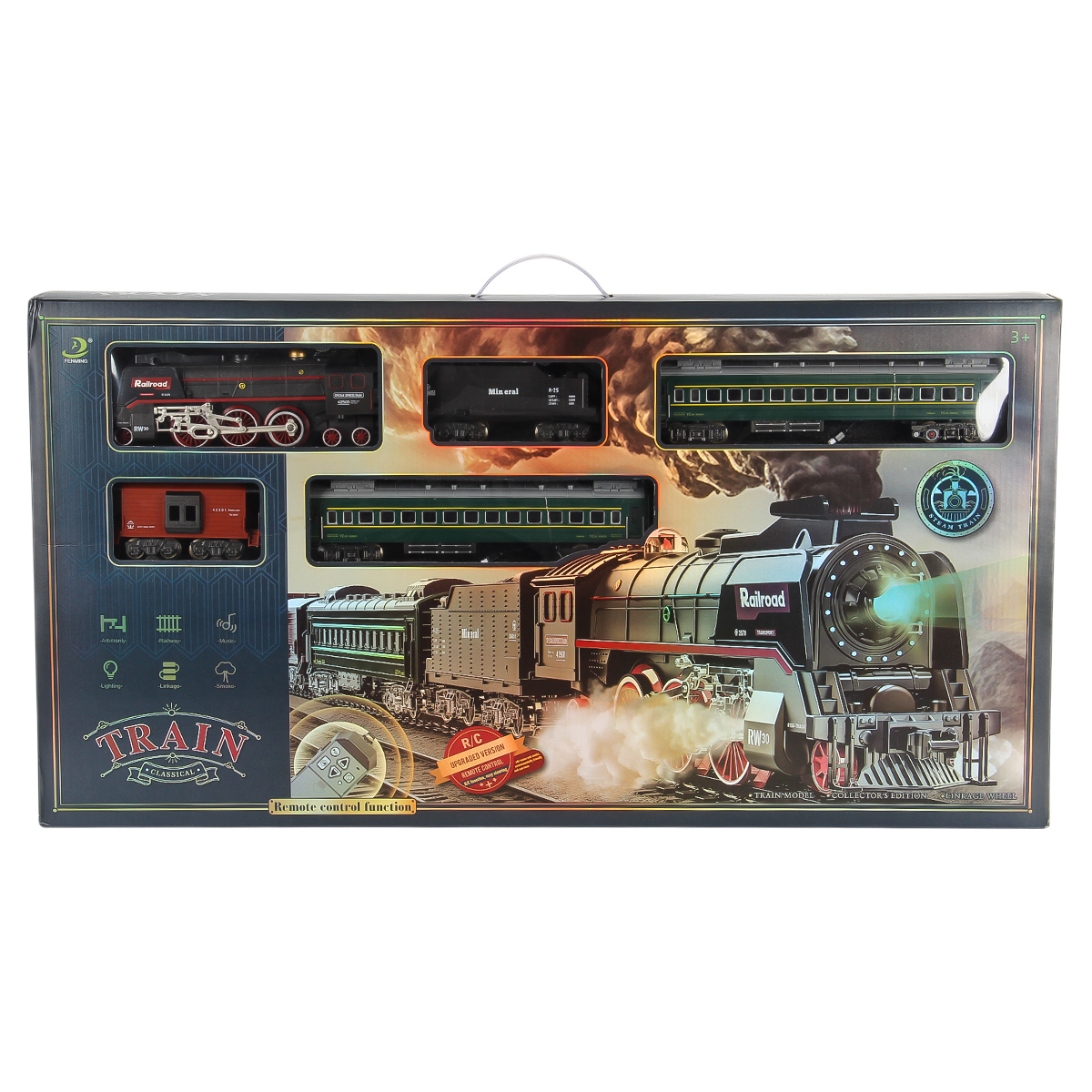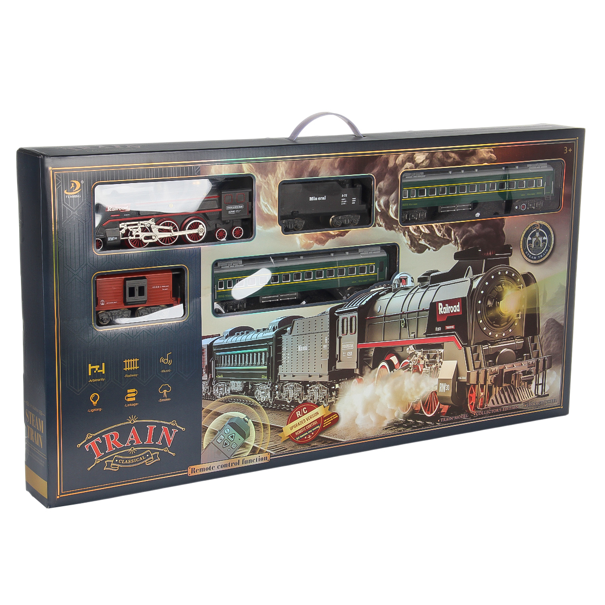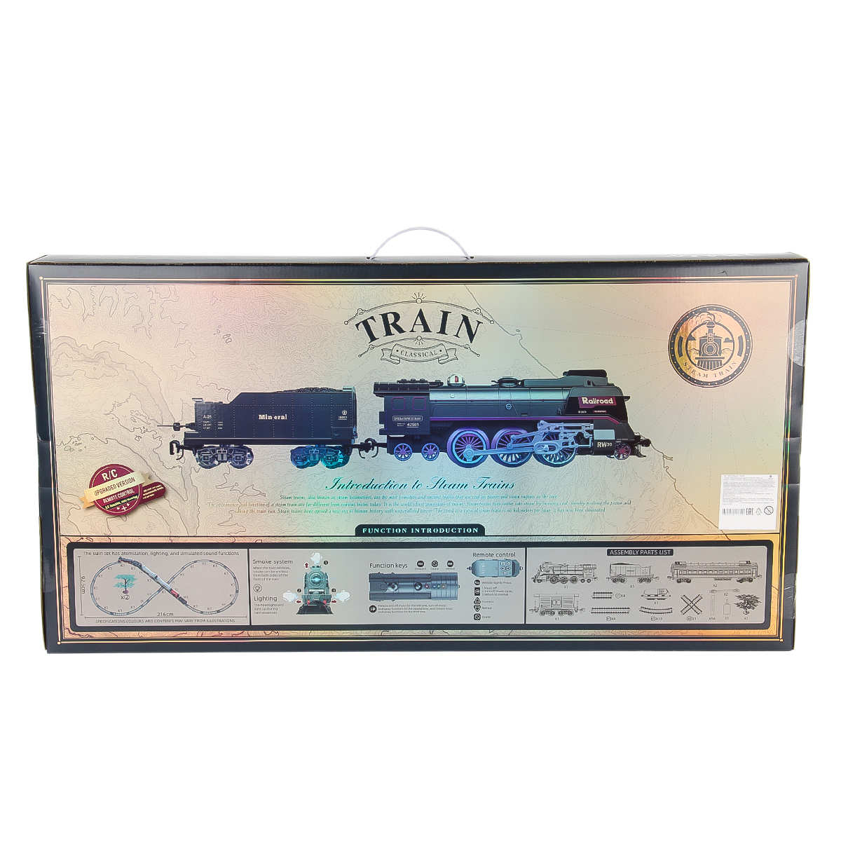 Шикарный игровой набор железная дорога с поездом. Локомотив с паром из трубы и колес, красивой подсветкой носового фонаря и трубы, звуковыми эффектами, движением вперед и назад. Плавный разгон, как у настоящего локомотива. Вагоны с подсветкой, работа от заряжаемого аккумулятора, 2 вида управления локомотивом, с помощью пульта и кнопок на корпусе. Пульт управления сделан в виде дополнительного вагона, можно подсоединить к составу. Легкая сборка железной дороги, общая подробная инструкция на железную дорогу и состав, подробная инструкция на пульт управления, бутылочка в наборе. Отличное качество исполнения, прочные и долговечные материалы, внимание к деталям, реалистичная модель локомотива, выполненная в ретродизайне. Благодаря подсветке можно играть в темное время суток.