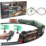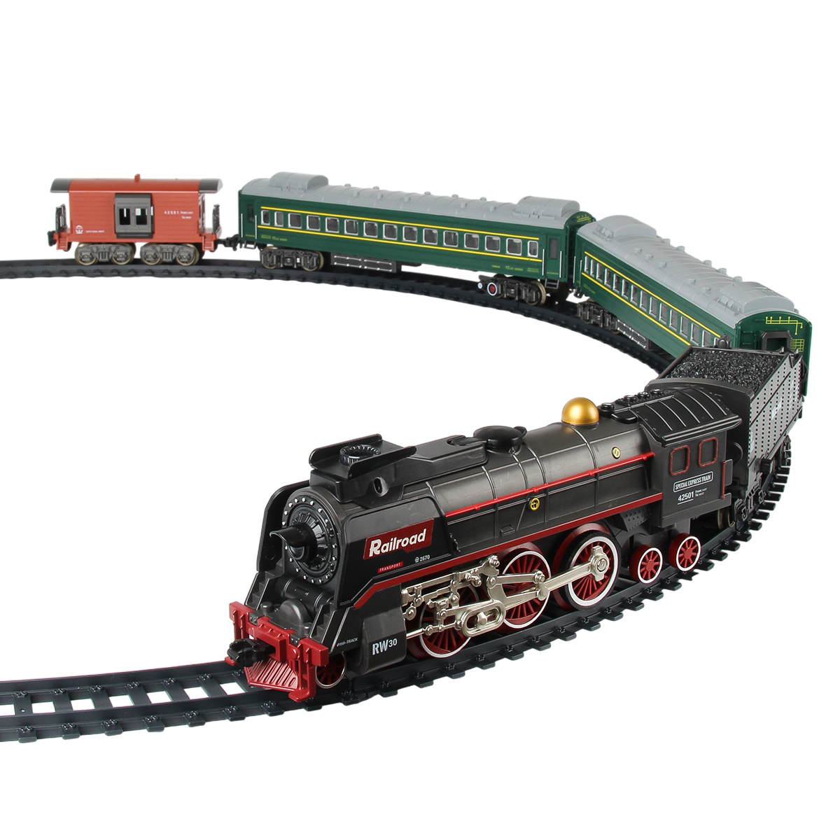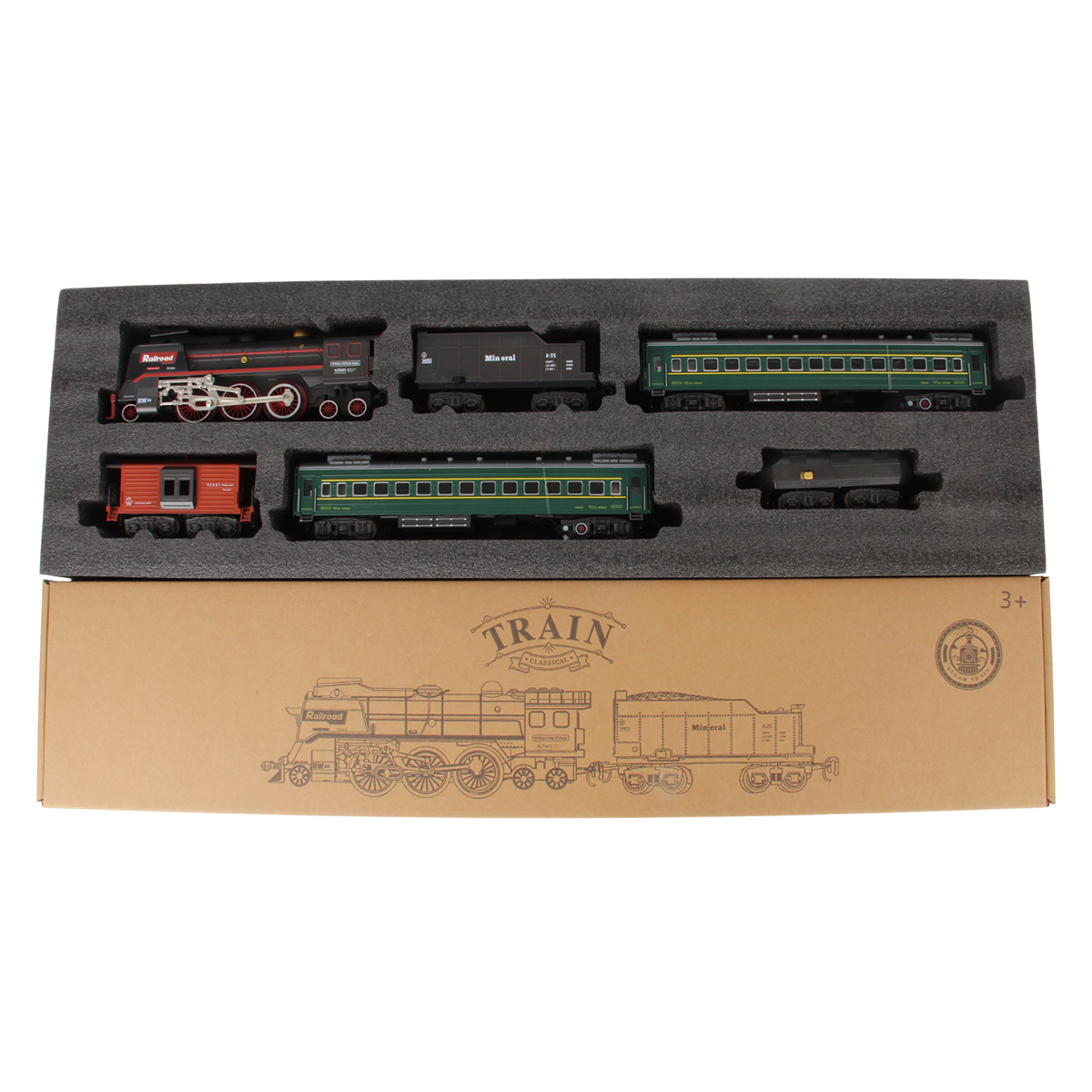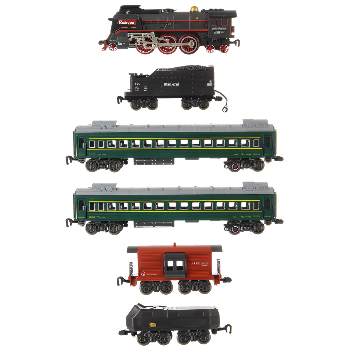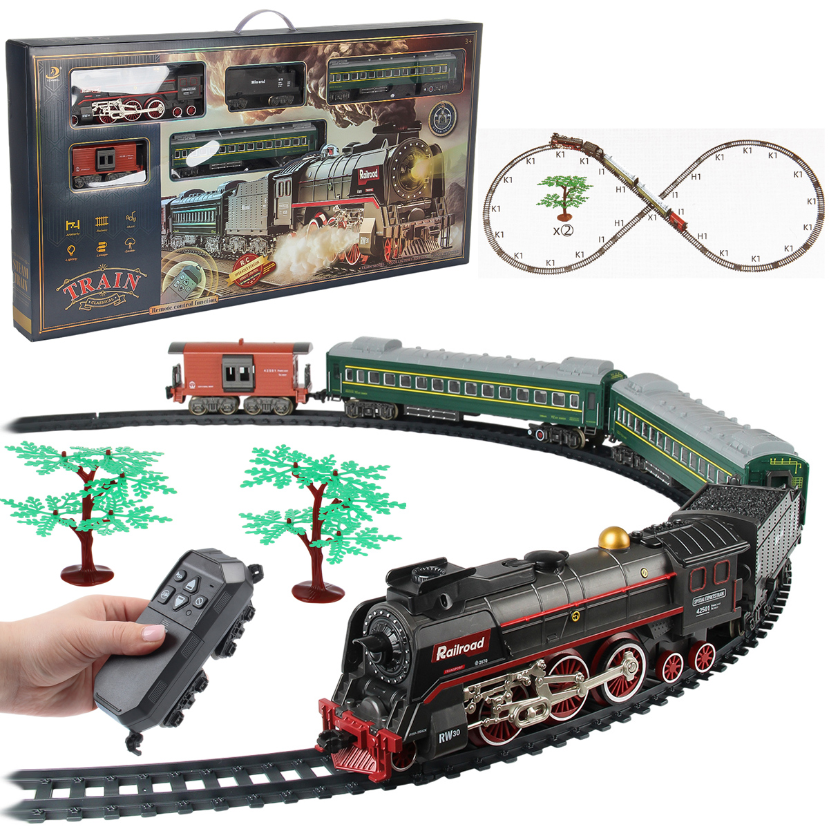 Шикарный игровой набор железная дорога с поездом. Локомотив с паром из трубы и колес, красивой подсветкой носового фонаря и трубы, звуковыми эффектами, движением вперед и назад. Плавный разгон, как у настоящего локомотива. Вагоны с подсветкой, работа от заряжаемого аккумулятора, 2 вида управления локомотивом, с помощью пульта и кнопок на корпусе. Пульт управления сделан в виде дополнительного вагона, можно подсоединить к составу. Легкая сборка железной дороги, общая подробная инструкция на железную дорогу и состав, подробная инструкция на пульт управления, бутылочка в наборе. Отличное качество исполнения, прочные и долговечные материалы, внимание к деталям, реалистичная модель локомотива, выполненная в ретродизайне. Благодаря подсветке можно играть в темное время суток.