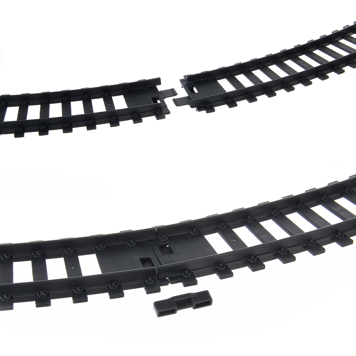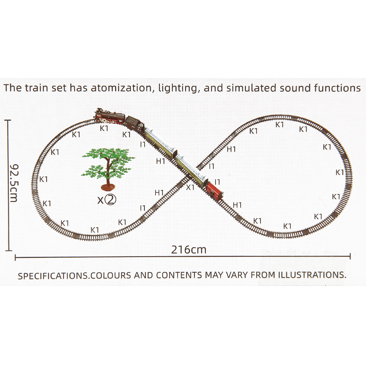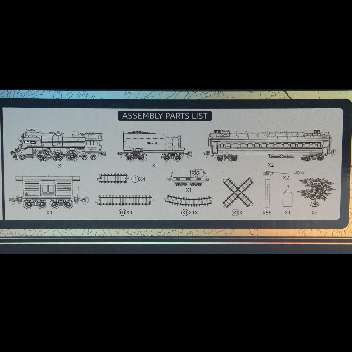 В наборе детали для сборки железной дороги 83 штуки, локомотив, 4 вагона, пульт управления, 2 дерева, бутылочка для воды, USB кабель, крестовая отвертка, аккумулятор 3.7V, подробная инструкция на английском языке.
