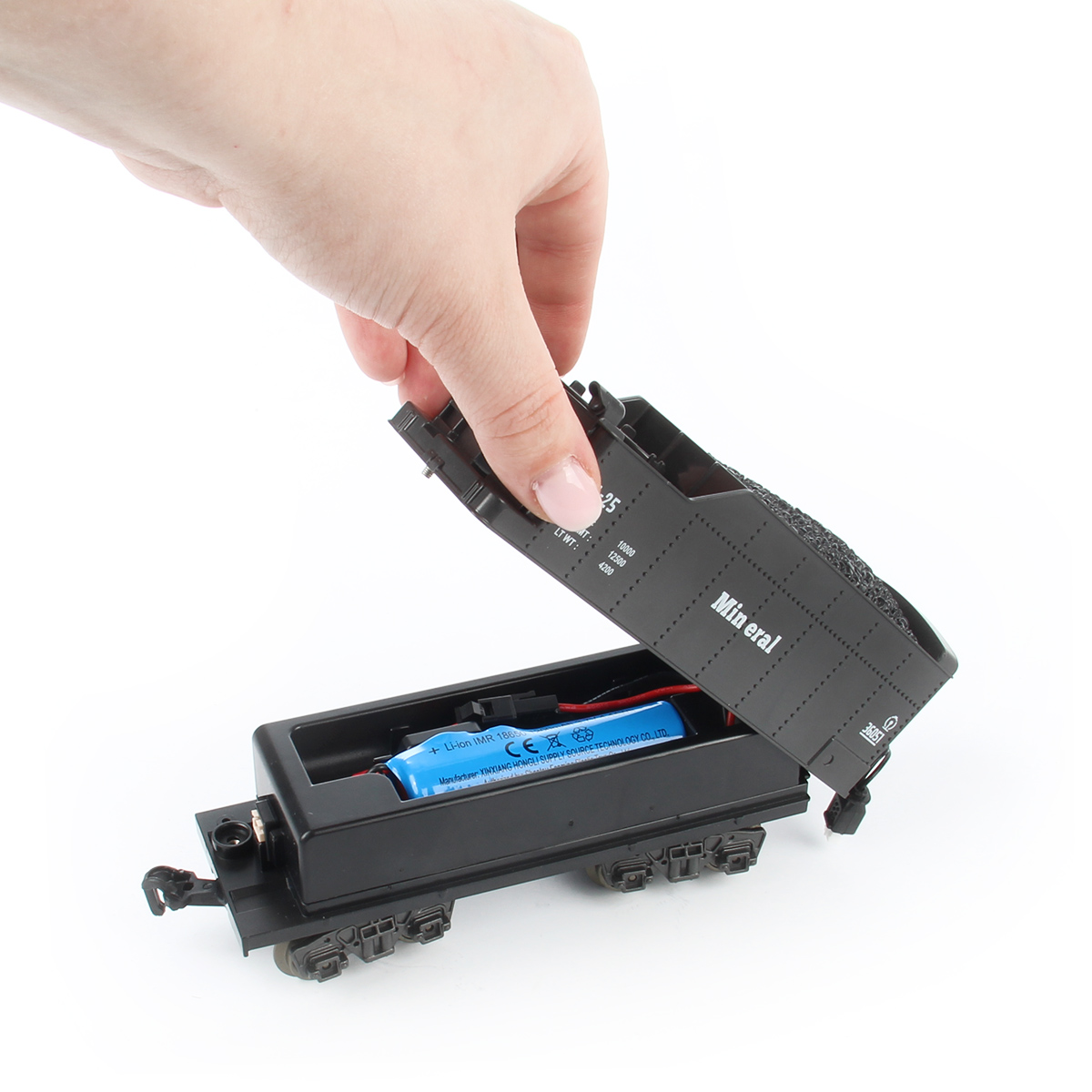 Локомотив работает от аккумулятора 3.7V, входит в комплект. Аккумулятор вставляется в грузовой вагон, для этого снимите верхнюю часть корпуса.