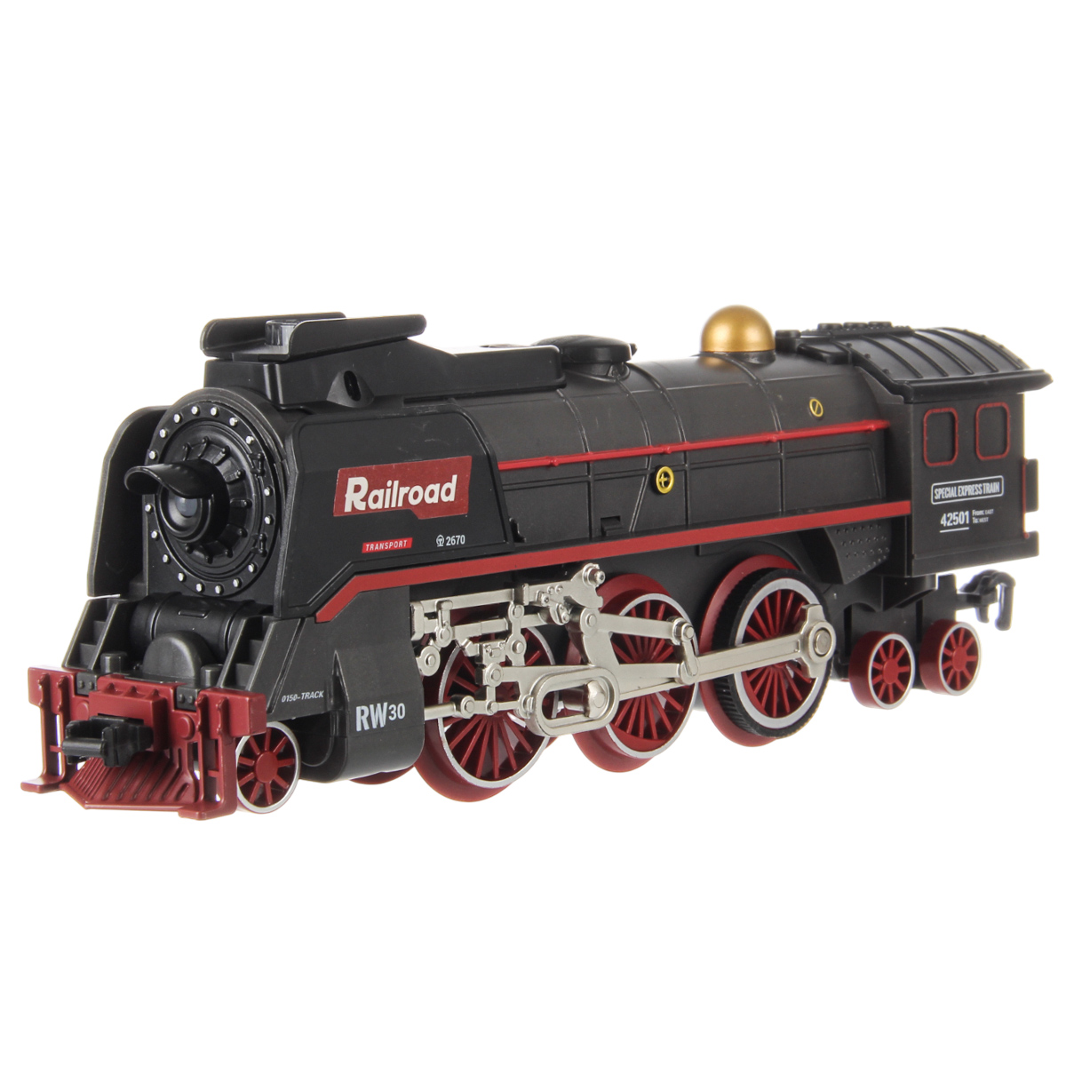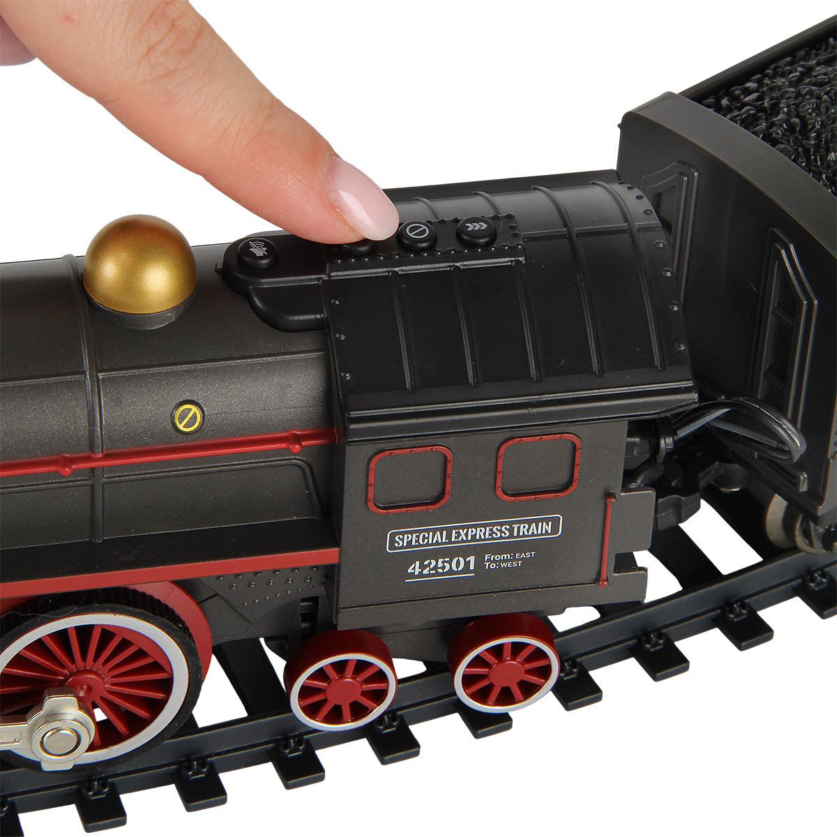 Локомотив едет вперед и назад, издает звуки гудка, железнодорожного переезда, звук выпуска пара, подсветка носового фонаря и трубы, пар из трубы и колес. Плавный разгон, как у настоящего локомотива. Кнопка в виде перечеркнутого круга на пульте управления останавливает движение локомотива. При нажатии на кнопку в виде трубы можно отключить звук, при повторном нажатии отключить функцию пара.