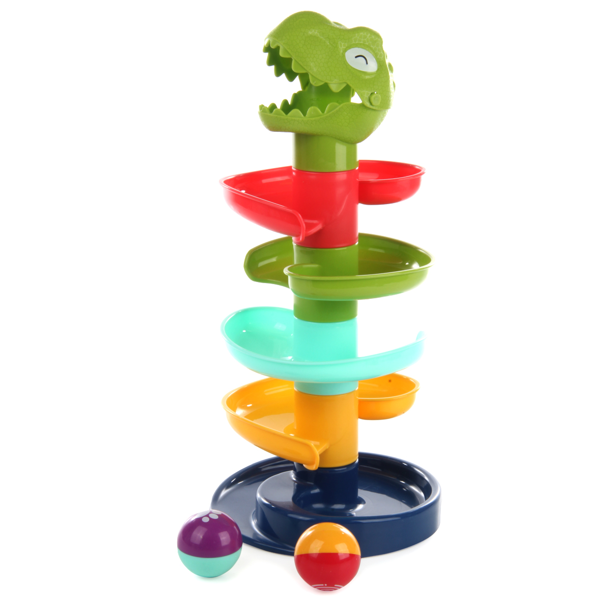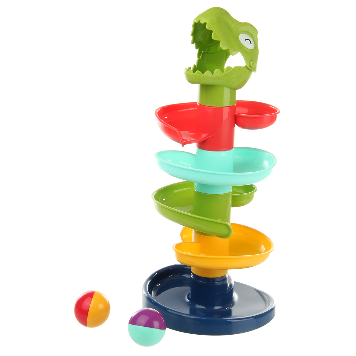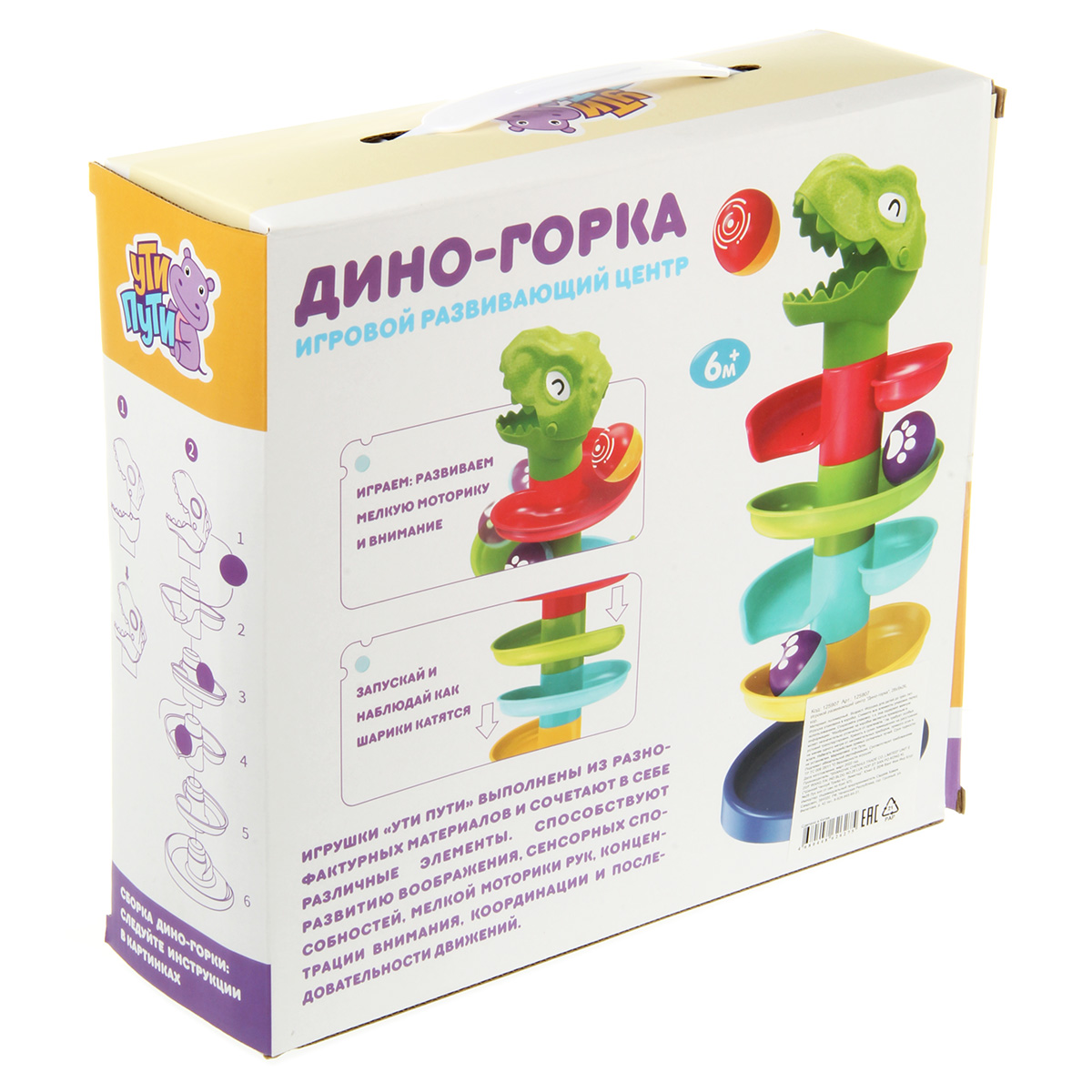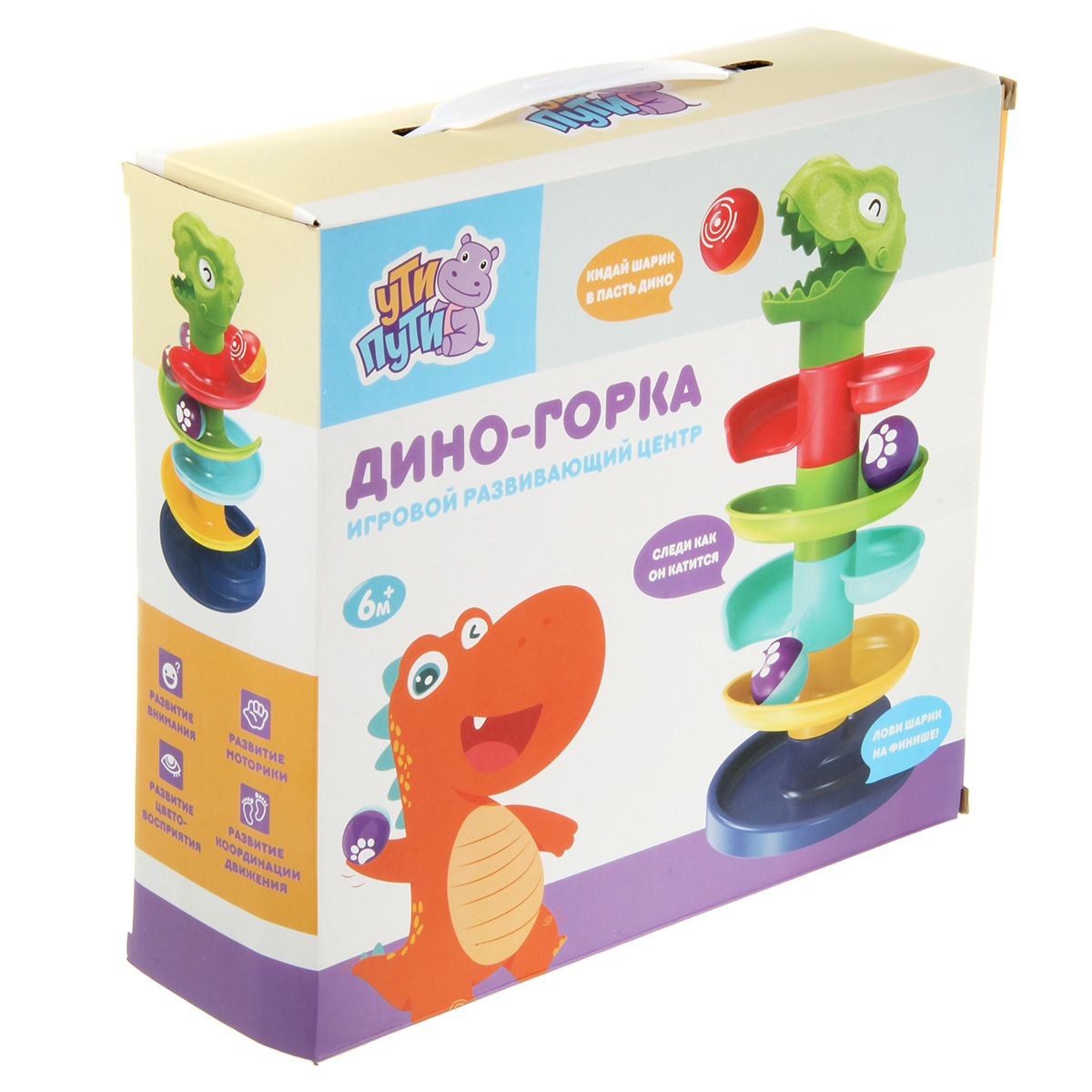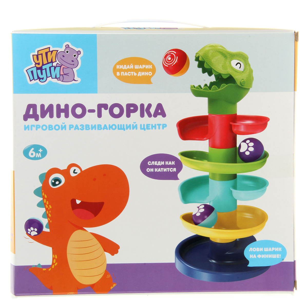 Игровой развивающий центр в виде динозаврика понравится каждому малышу. Развивающая игра с шариками содержит крупные и яркие элементы. Игрушка горка имеет простой принцип сборки, в разобранном виде занимает мало места. Развивающая горка сделана из прочных и долговечных материалов, можно мыть. В комплекте детали для сборки горки, 2 шарика. Шарики шумят, внутри погремушка. У динозаврика открывается пасть, кладем внутрь шарик, он скатывается вниз. Замечательная игрушка для запоминания цветов, развития пространственного и логического мышления. Игрушка для детей до 3 лет. Материал: полимер. Размеры собранной горки: 18*36 см. Диаметр шарика: 4 см. Размеры коробки: 28*9*26 см.