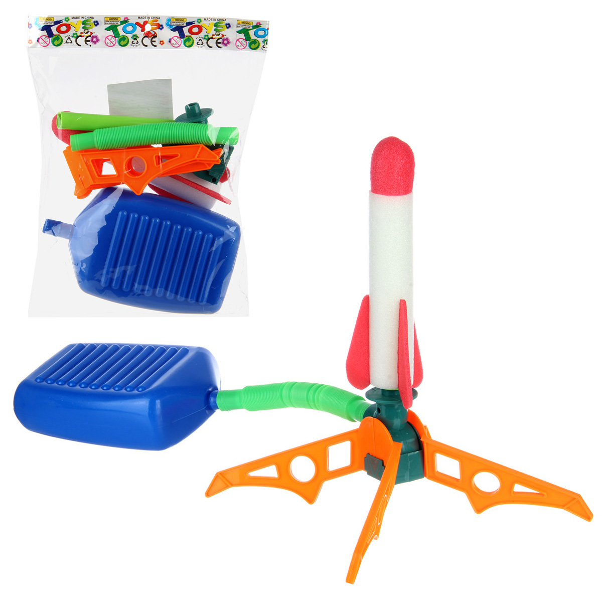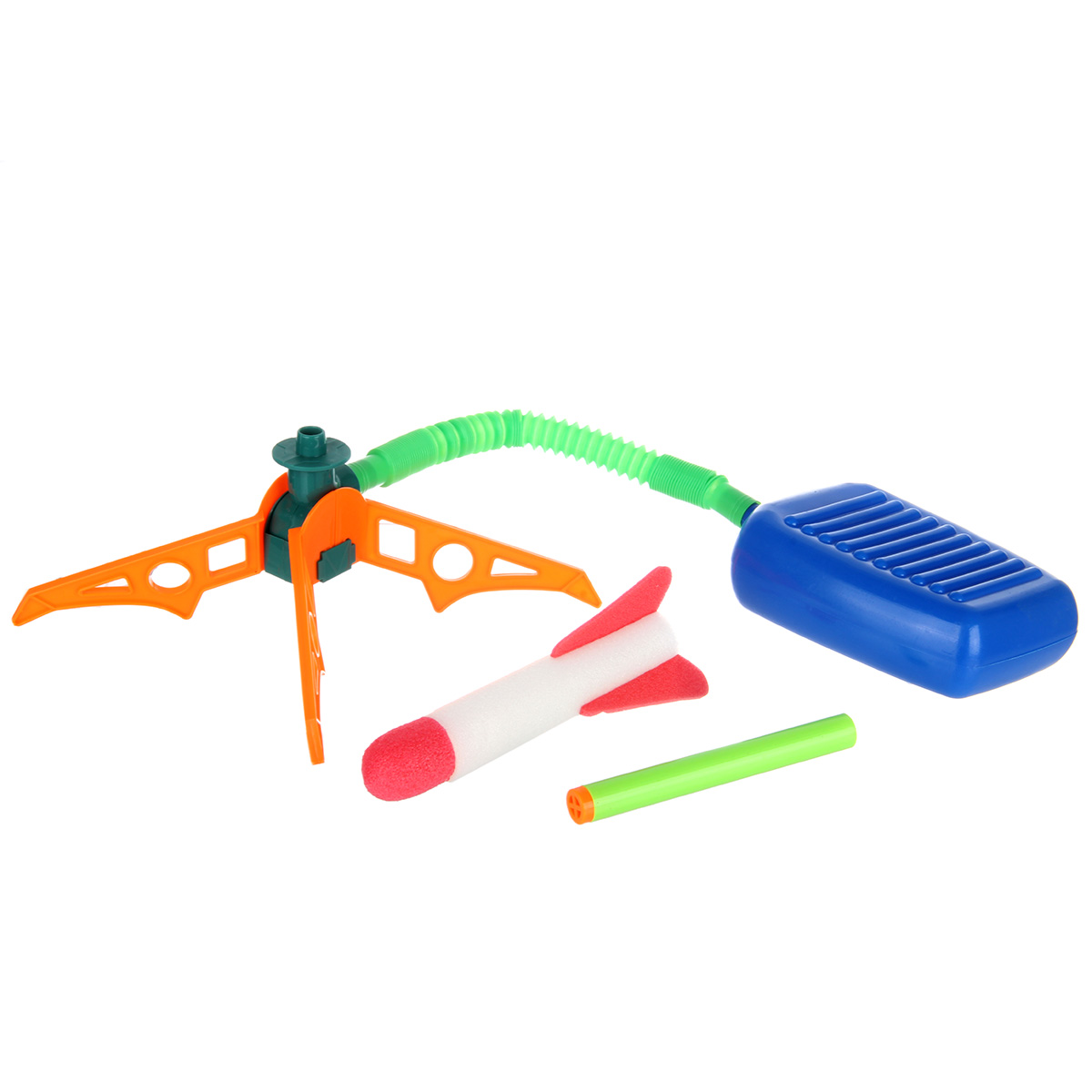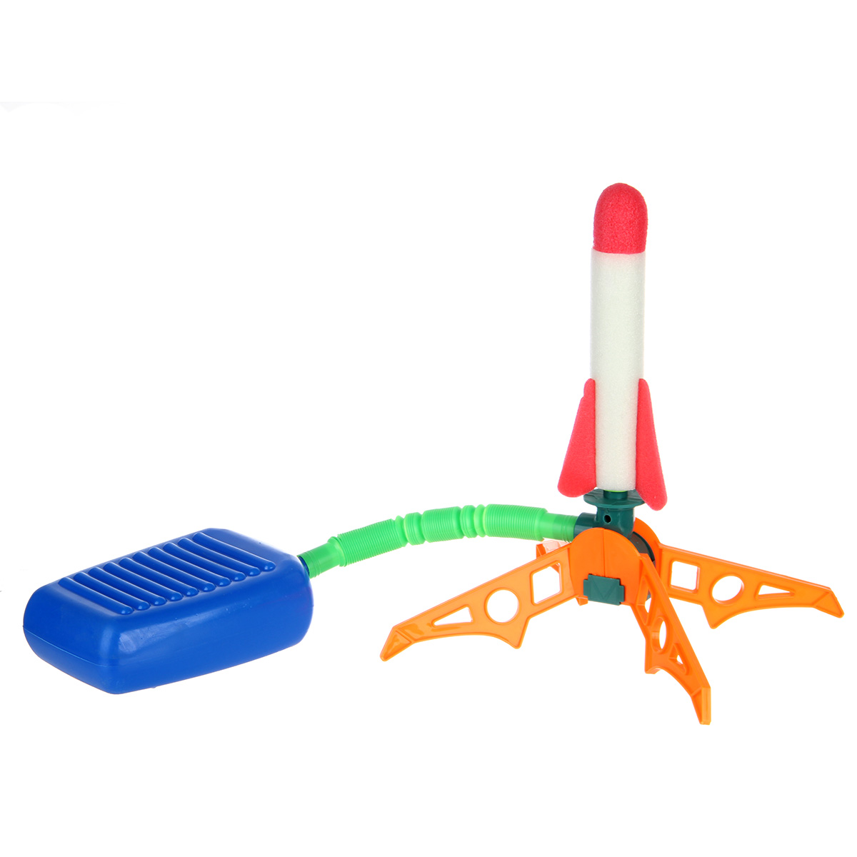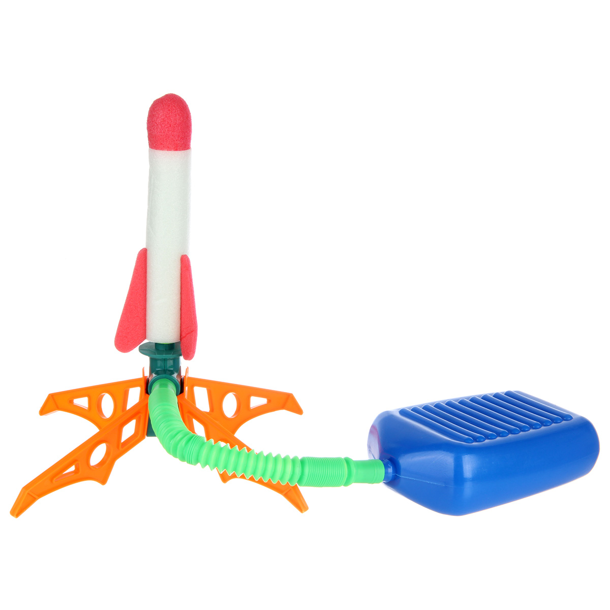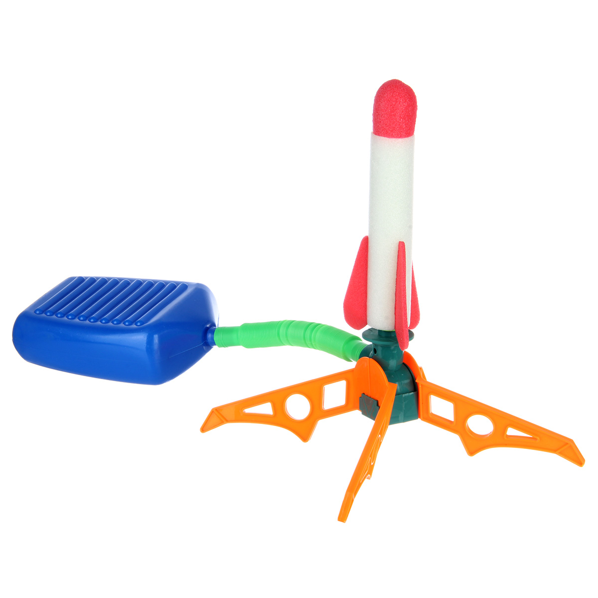 Принцип работы. Соберите установку для запуска, чтобы получилась конструкция, как представлено на фото. Установите ракету на держателе, резко нажмите на педаль, ракета полетит вверх, педаль работает в качестве насоса, верхняя часть корпуса ракеты при сильном столкновении с предметом начинает подсвечиваться. Угол наклона стойки с держателем регулируется, можно менять угол полета. Ракета изготовлена из вспененного материала, благодаря этому легко подлетает вверх.