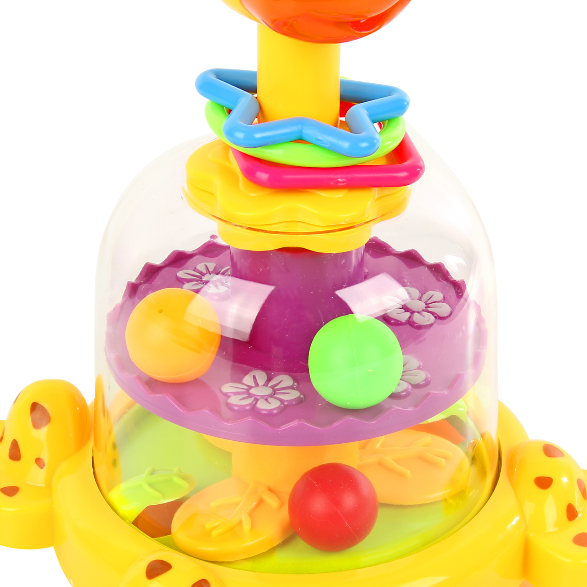 Юла в виде веселого жирафа понравится каждому малышу. Игрушка оформлена в очень милом и симпатичном дизайне, обладает яркой расцветкой, ребенок будет в восторге от такой игрушки. Если нажать на голову жирафа, шарики внутри игрушки станут двигаться за счет вращения подставок. Фигурные элементы на шее жирафа перемещаются и прокручиваются. Благодаря такой игрушке ребенок будет с удовольствием развивать мелкую моторику рук, координацию движений, воображение, тактильные навыки, познакомится с цветами и формами. Юла станет хорошим подарком. Обязательно порадуйте малыша такой потрясающей игрушкой. Игрушка предназначена для детей до 3 лет. Игрушка изготовлена из высококачественного и безопасного полимерного материала. Размеры игрушки: 17*15*24,5 см. Размеры коробки: 17*15*26 см.