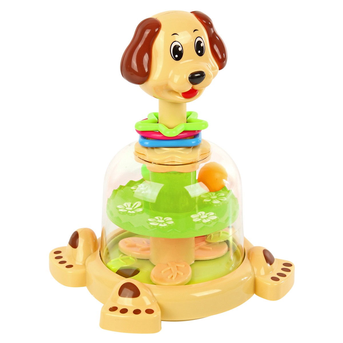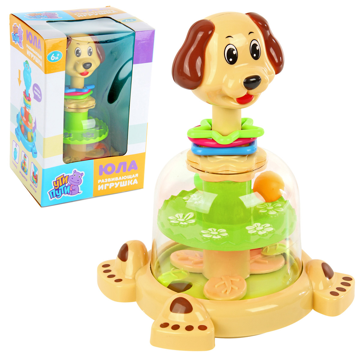 Юла в виде веселого песика понравится каждому малышу. Игрушка оформлена в очень милом и симпатичном дизайне, обладает яркой расцветкой, ребенок будет в восторге от такой игрушки. Если нажать на голову собачки, шарики внутри игрушки станут двигаться за счет вращения подставок. Фигурные элементы на шее песика перемещаются и прокручиваются. Благодаря такой игрушке ребенок будет с удовольствием развивать мелкую моторику рук, координацию движений, воображение, тактильные навыки, познакомится с цветами и формами. Юла станет хорошим подарком. Обязательно порадуйте малыша такой потрясающей игрушкой. Игрушка предназначена для детей до 3 лет. Представлена в ассортименте. Игрушка изготовлена из высококачественного и безопасного полимерного материала. Размеры игрушки: 17*15*24 см. Размеры коробки: 17*15*26 см.