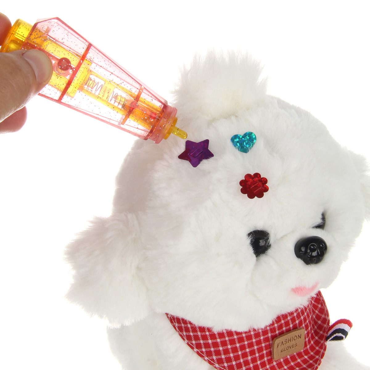 Игрушечная собака со звуковыми эффектами. Волшебная палочка с блестками, с помощью ручки можно прикрепить блестки на шерстку питомца и на волосы ребенка. Интерактивная собака гавкает, поскуливает, простой механизм работы, оттянули хохолок. Игрушка антистресс, сыпучие элементы в нижней части тела. Плюшевая игрушка имеет мягкую, приятную на ощупь шерстку, глазки бусинки. Интерактивная детская игрушка с мягким наполнителем в компактном размере, удобно брать с собой, отличается качественным исполнением, вниманием к деталям и милым дизайном. Игровой набор станет замечательным подарком ребенку на Новый год и День рождения.