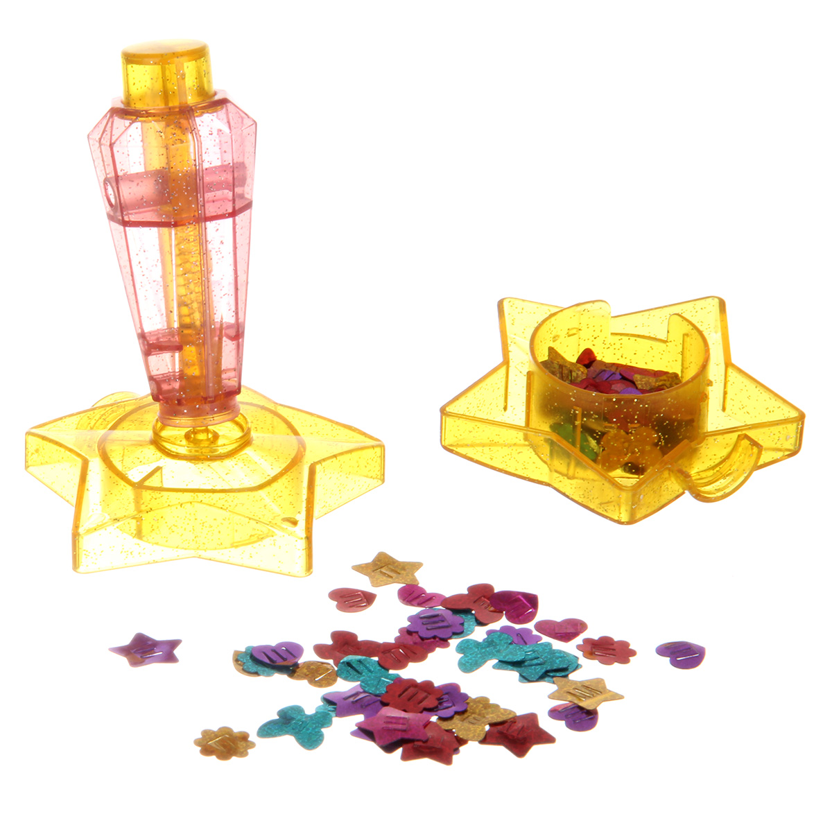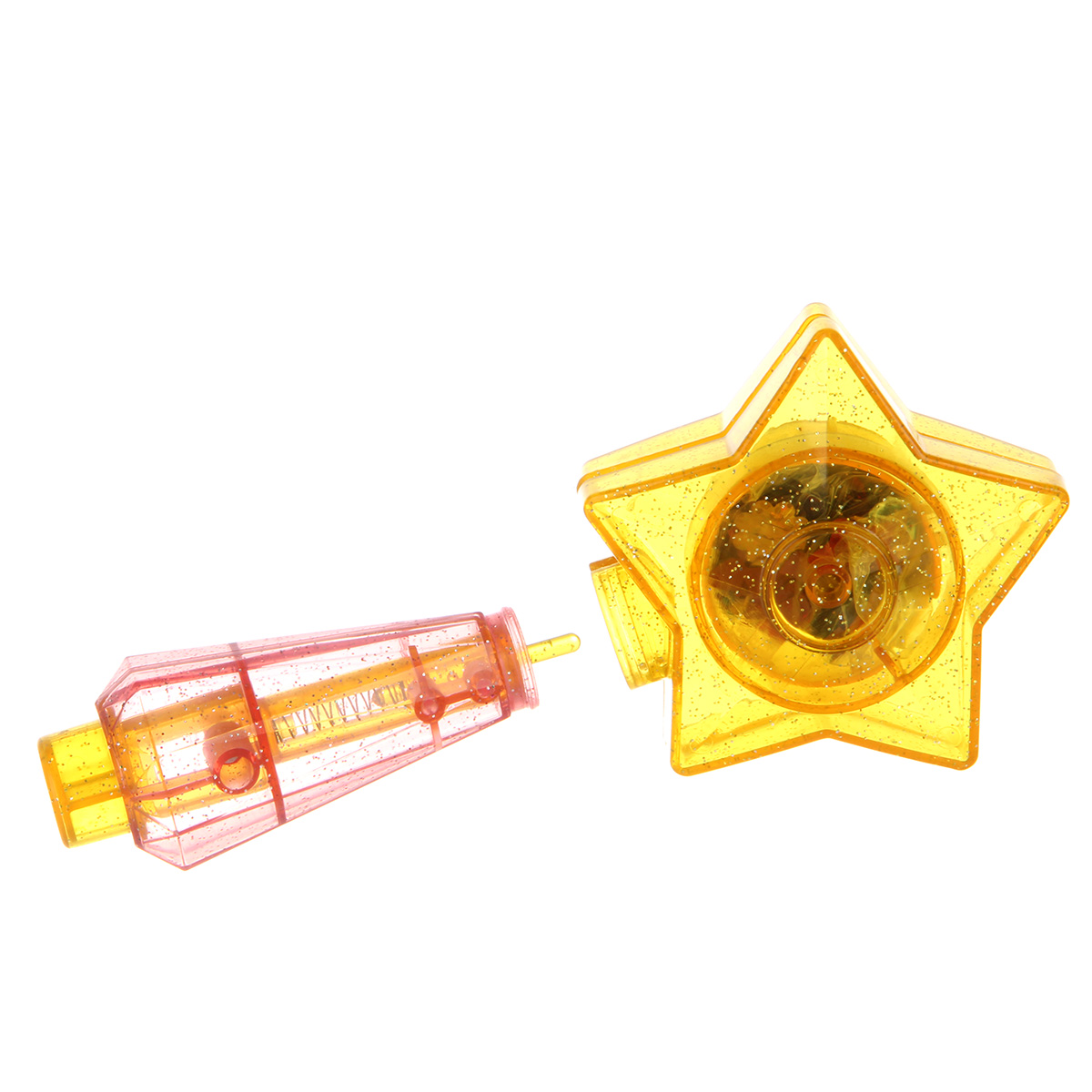 2. Волшебная палочка состоит из ручки и звездочки. Откройте звездочку, одна половинка выступает хранилищем, в ней находятся блестки. Положите другую половинку звезды на ровную поверхность, возьмите ручку, положите блестку в центральное углубление половинки звездочки, вдавите блестку ручкой, чтобы та наделась на кончик ручки, при этом будет слышен щелчок. Чтобы прикрепить блестку к шерстке питомца, нажмите на кнопку ручки. Таким же способом блестки можно прикрепить к волосам ребенка.