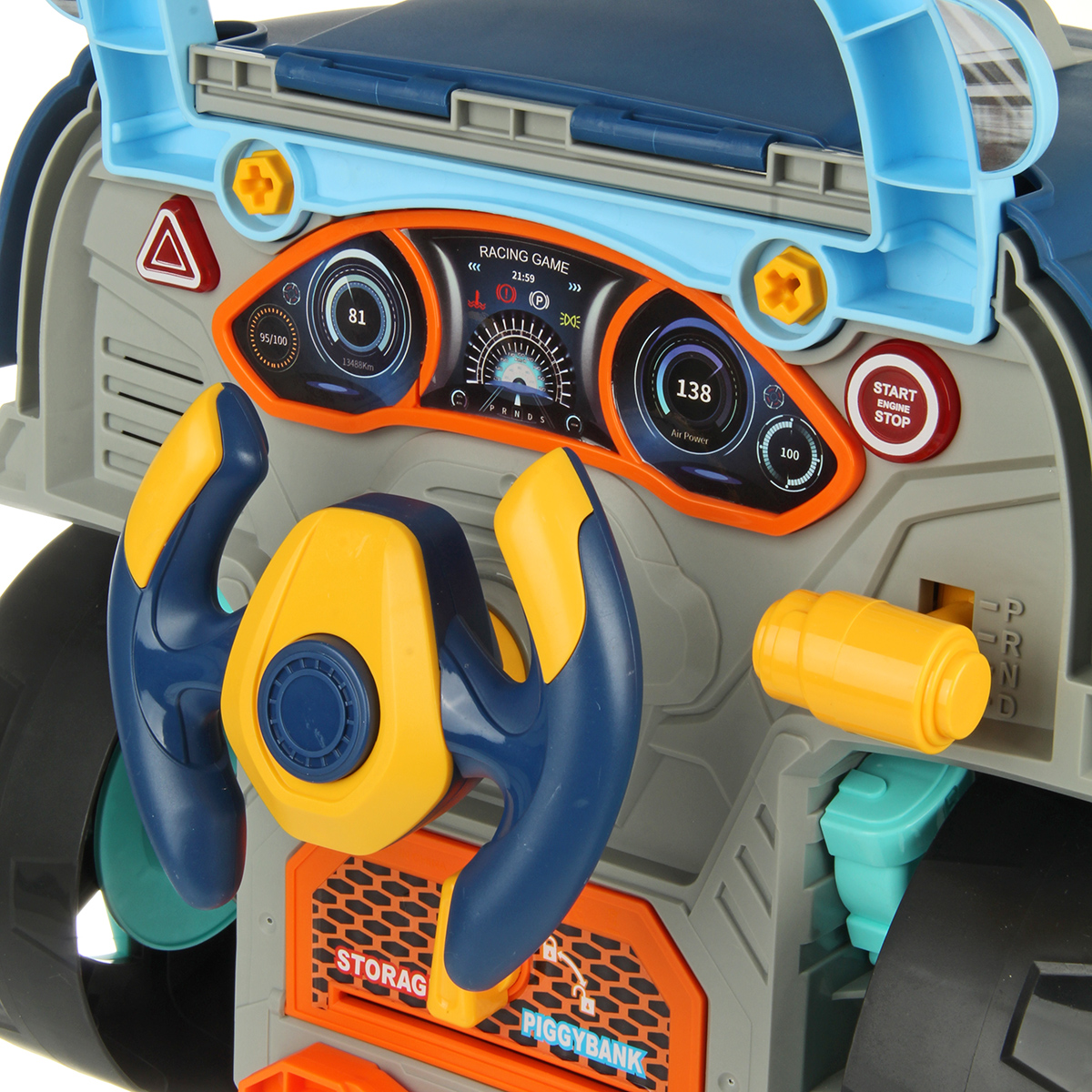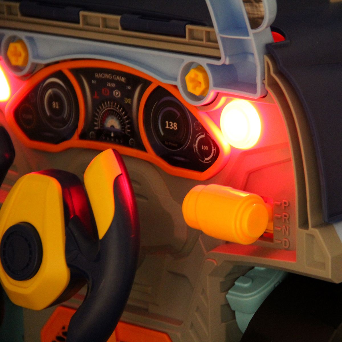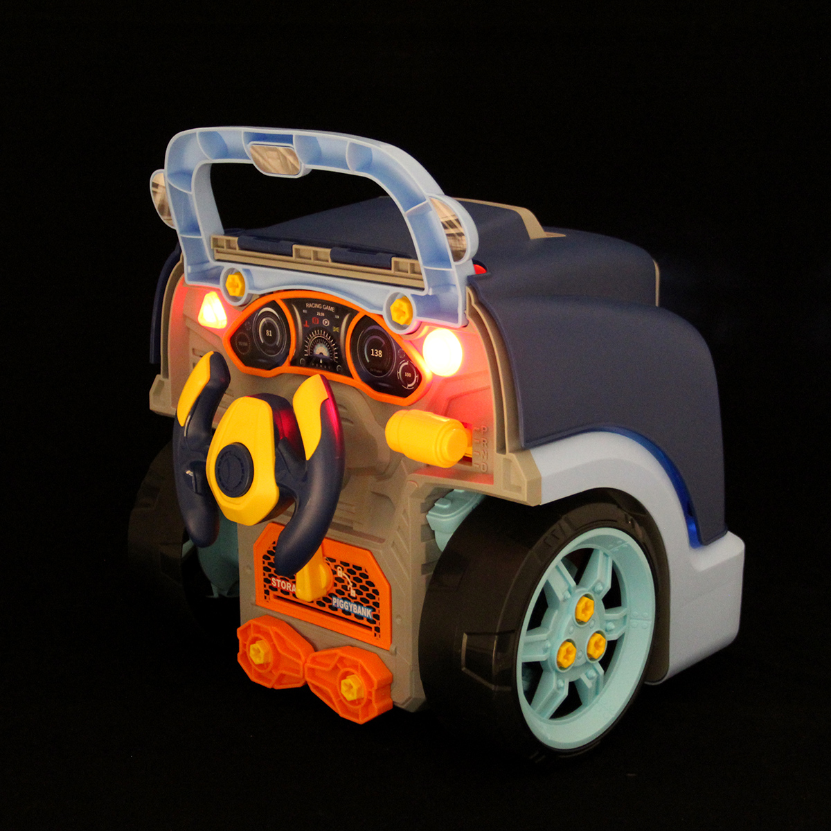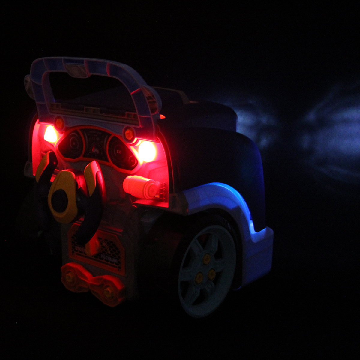 Конструктор разборный с эффектной подсветкой фар, подсветка кнопок Старта и аварийной остановки, можно играть в темное время суток.